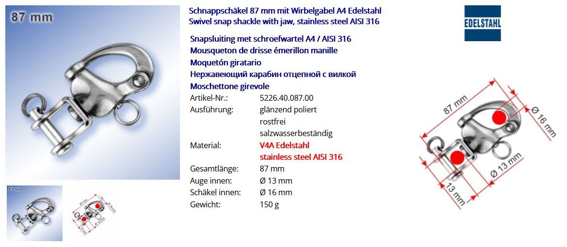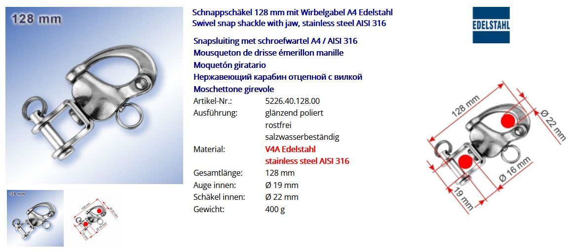 Schnappschäkel Schäkel mit Wirbelgabel A4 Edelstahl Niro Bootsport Yachtsport