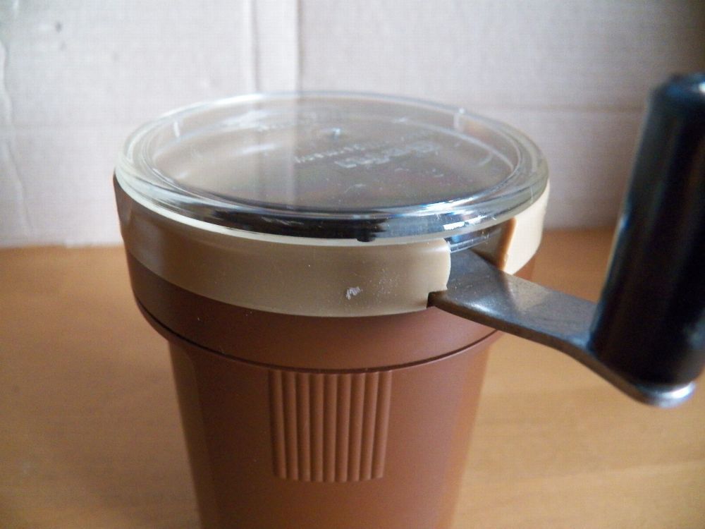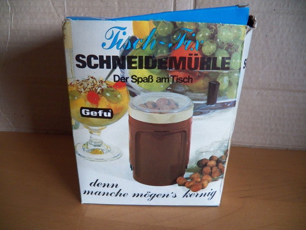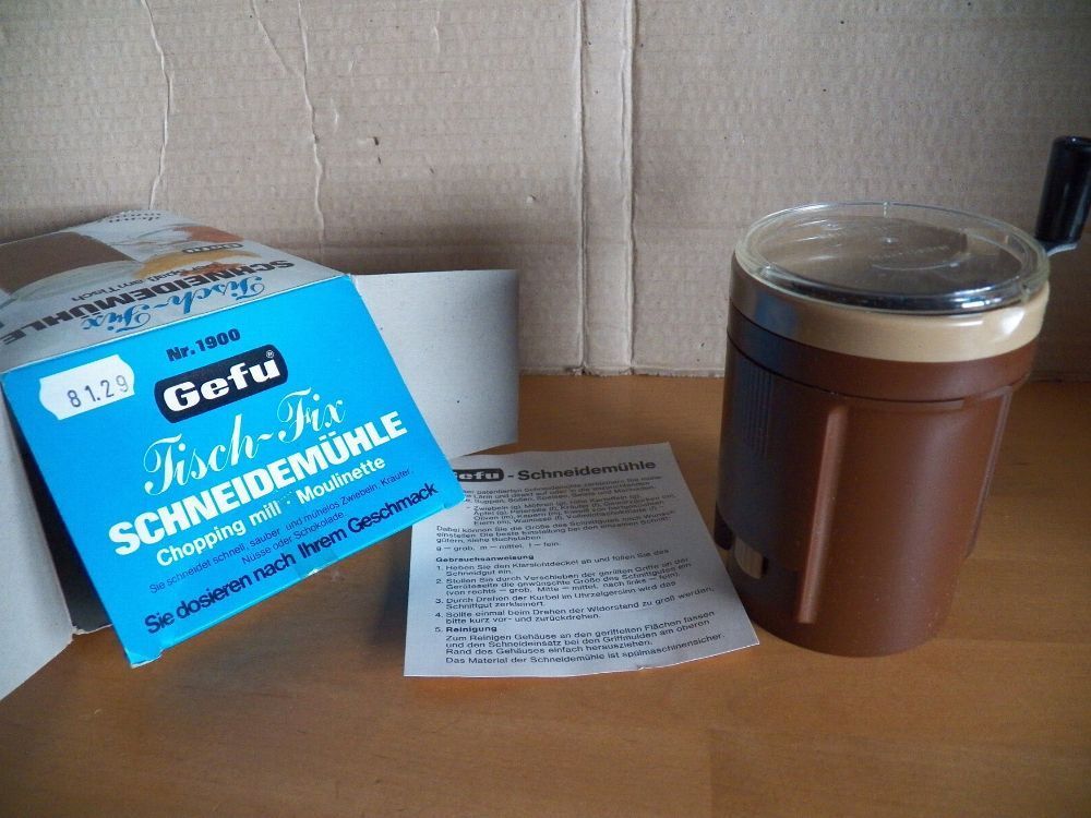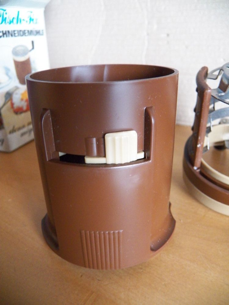 Teil könnte verstaubt oder verschmutzt sein oben am Rand ist ein Stück ausgebrochen und der Ring ist eingerissen (Bild) Maße : ca. 6,5 cm Durchschitt x 10,5 cm hoch -Füllhöhe ca. 5,5 cm bis innen am Strich gemessen Made in W. Germany Inox- rostfrei Mit dieser patentierten Schneidemühle zerkleinern S