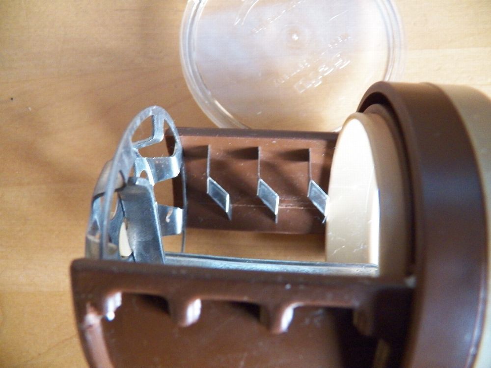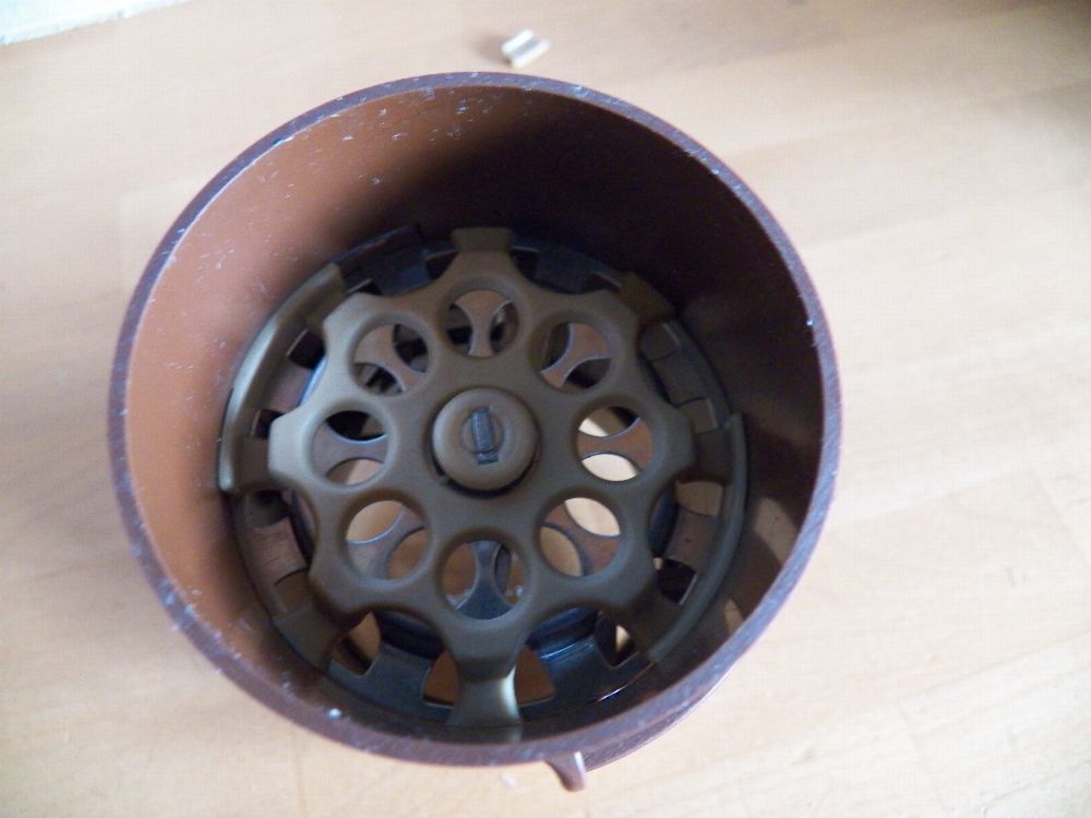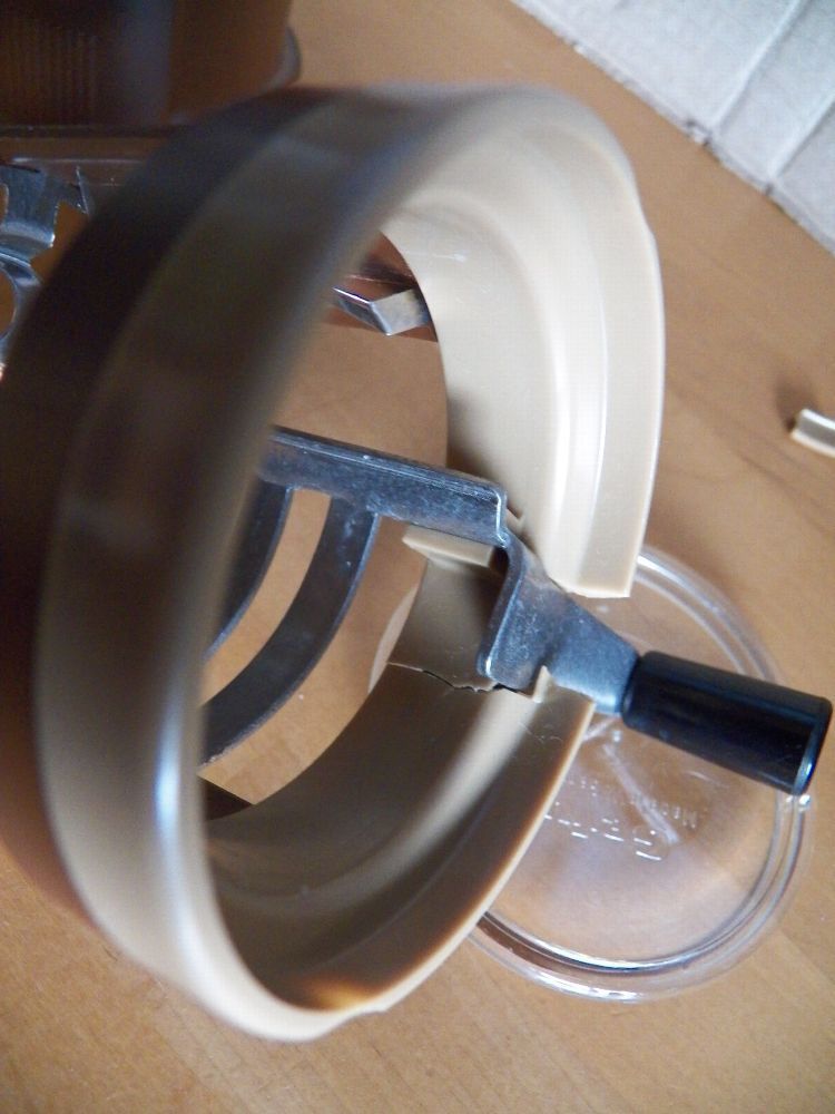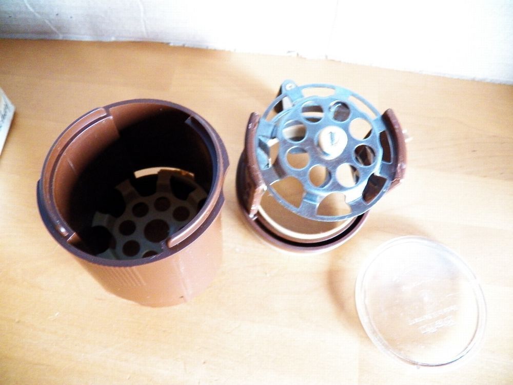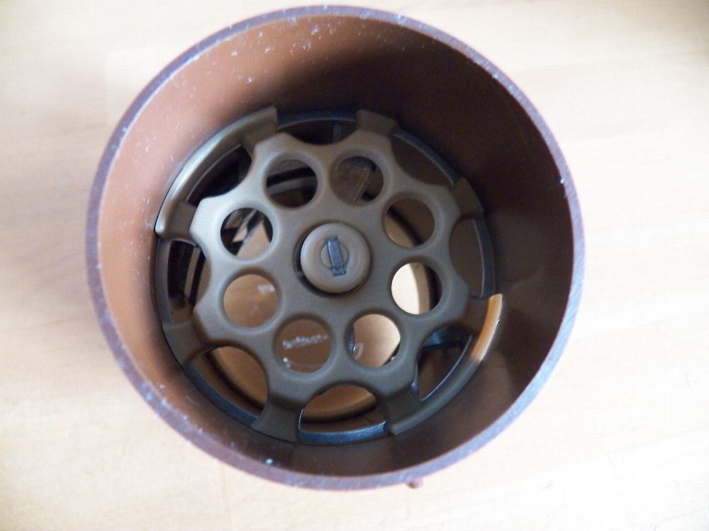 Teil könnte verstaubt oder verschmutzt sein oben am Rand ist ein Stück ausgebrochen und der Ring ist eingerissen (Bild) Maße : ca. 6,5 cm Durchschitt x 10,5 cm hoch -Füllhöhe ca. 5,5 cm bis innen am Strich gemessen Made in W. Germany Inox- rostfrei Mit dieser patentierten Schneidemühle zerkleinern S