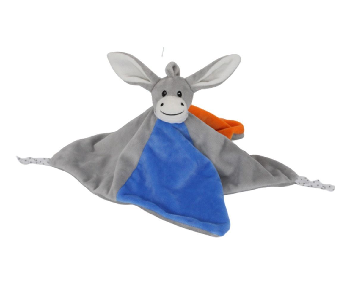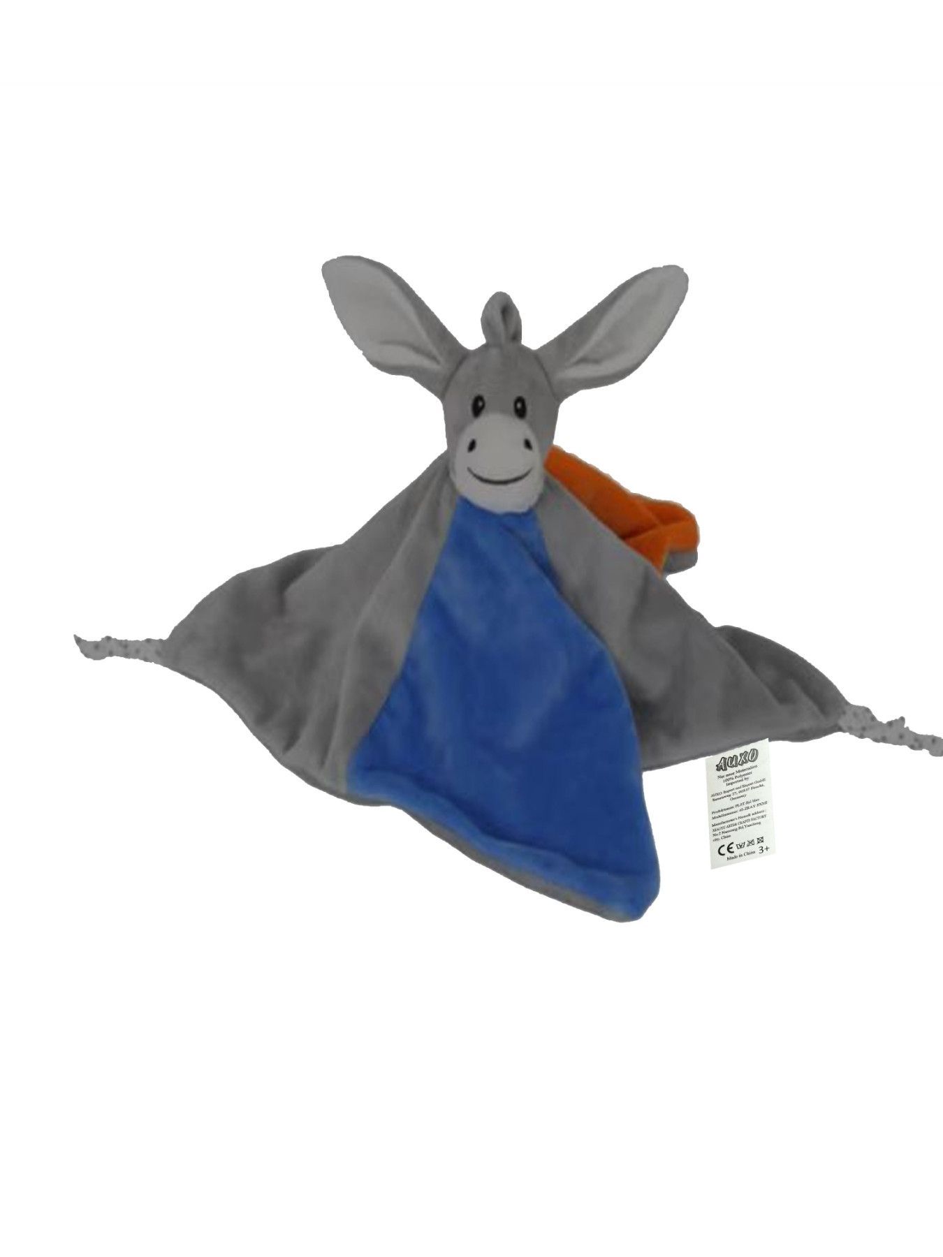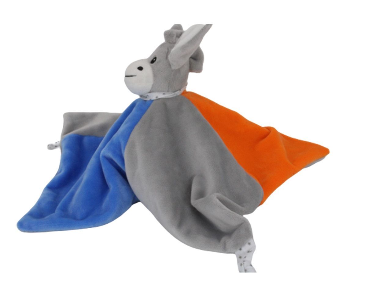 Schmusetuch Kuscheltuch in blau orange grau, kuschelweiche Begleiter für Baby 100% Polyester Movtiv: Esel, Nase, Augen sind bestickt, kein Kunststoff Mass: 32x32cm bis 60°C waschbar, Pflege: Handwasch empfohlen Uni Sex, geeignet für Junge und Mädchen 65g netto gewicht