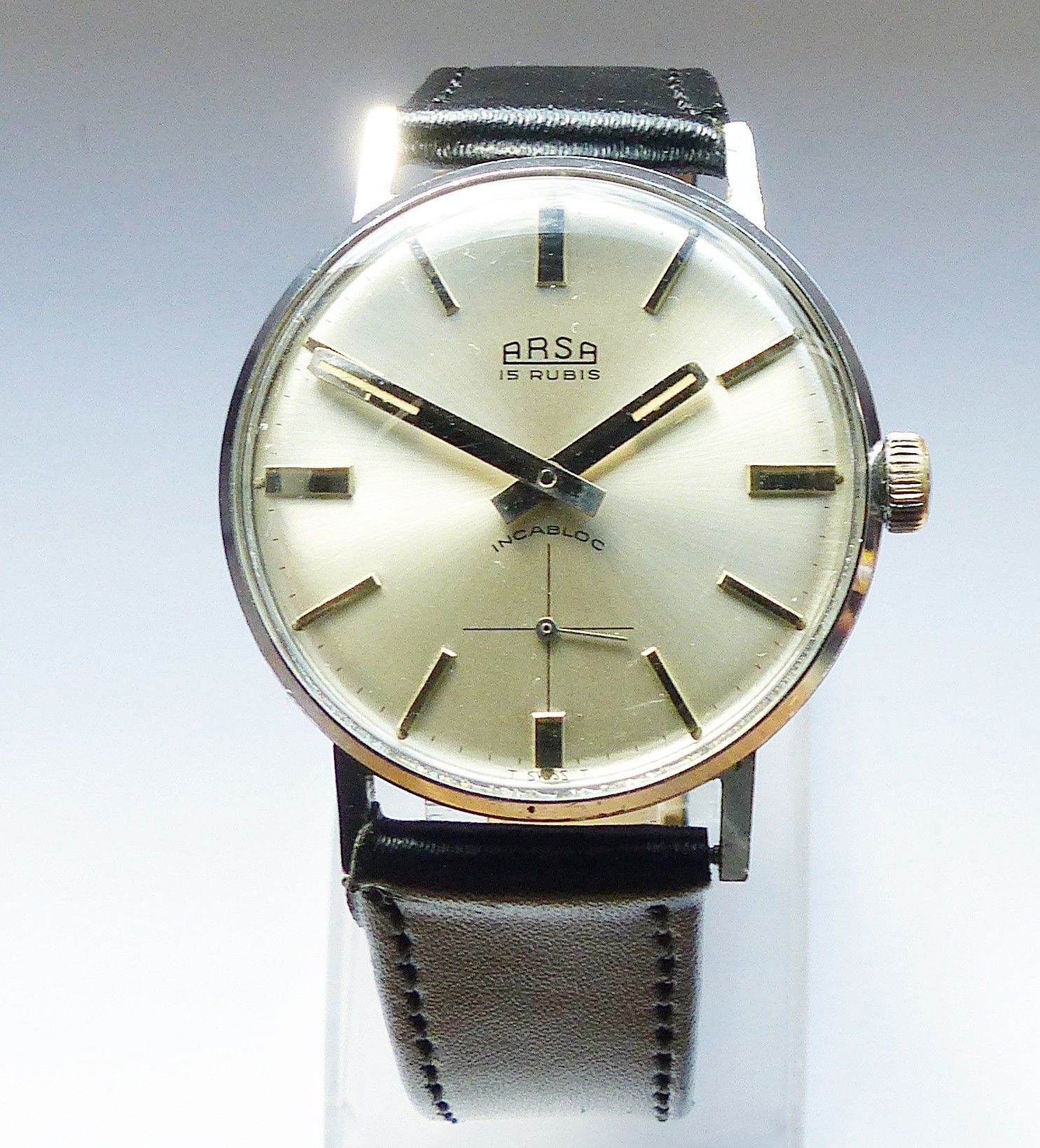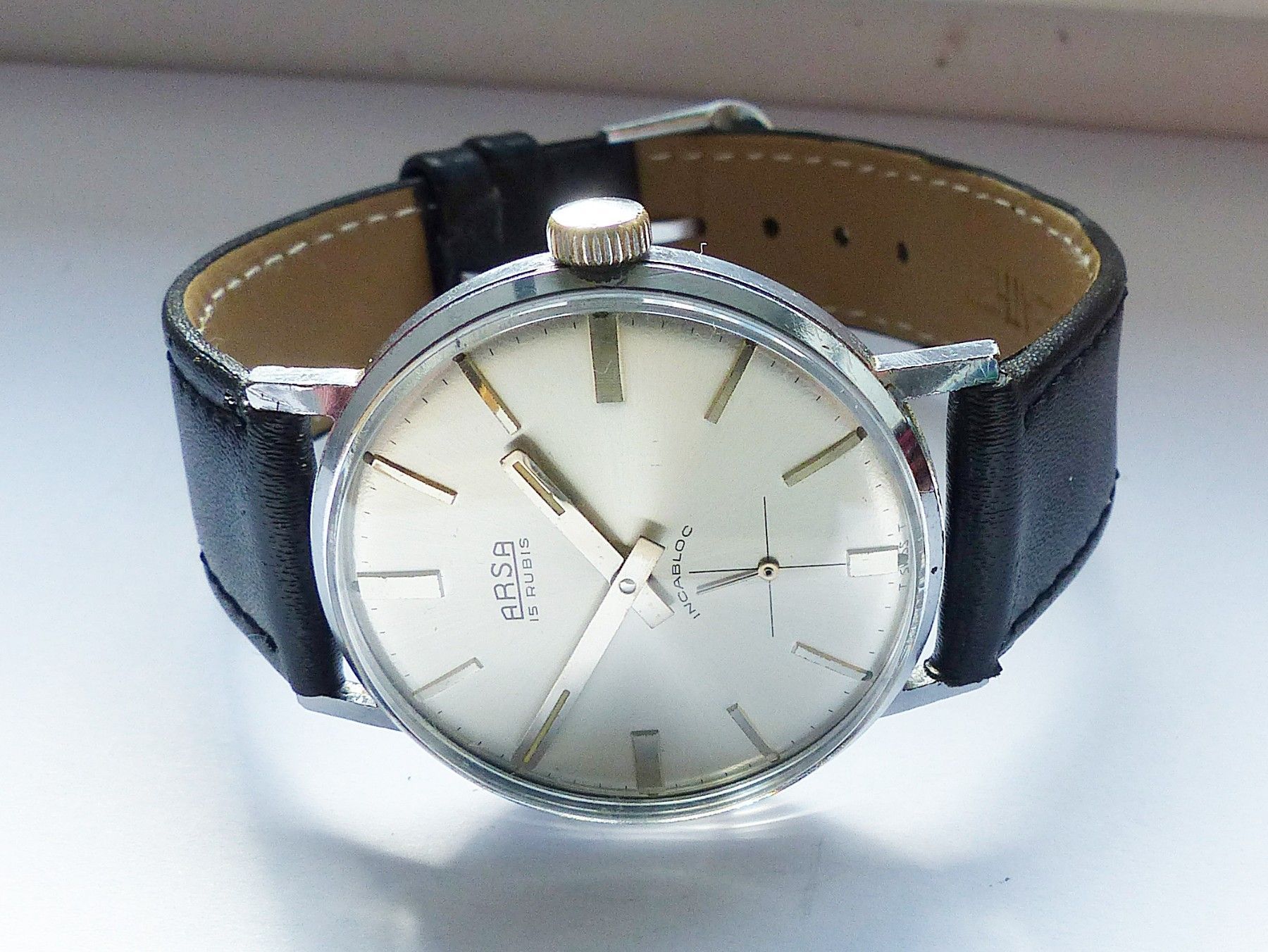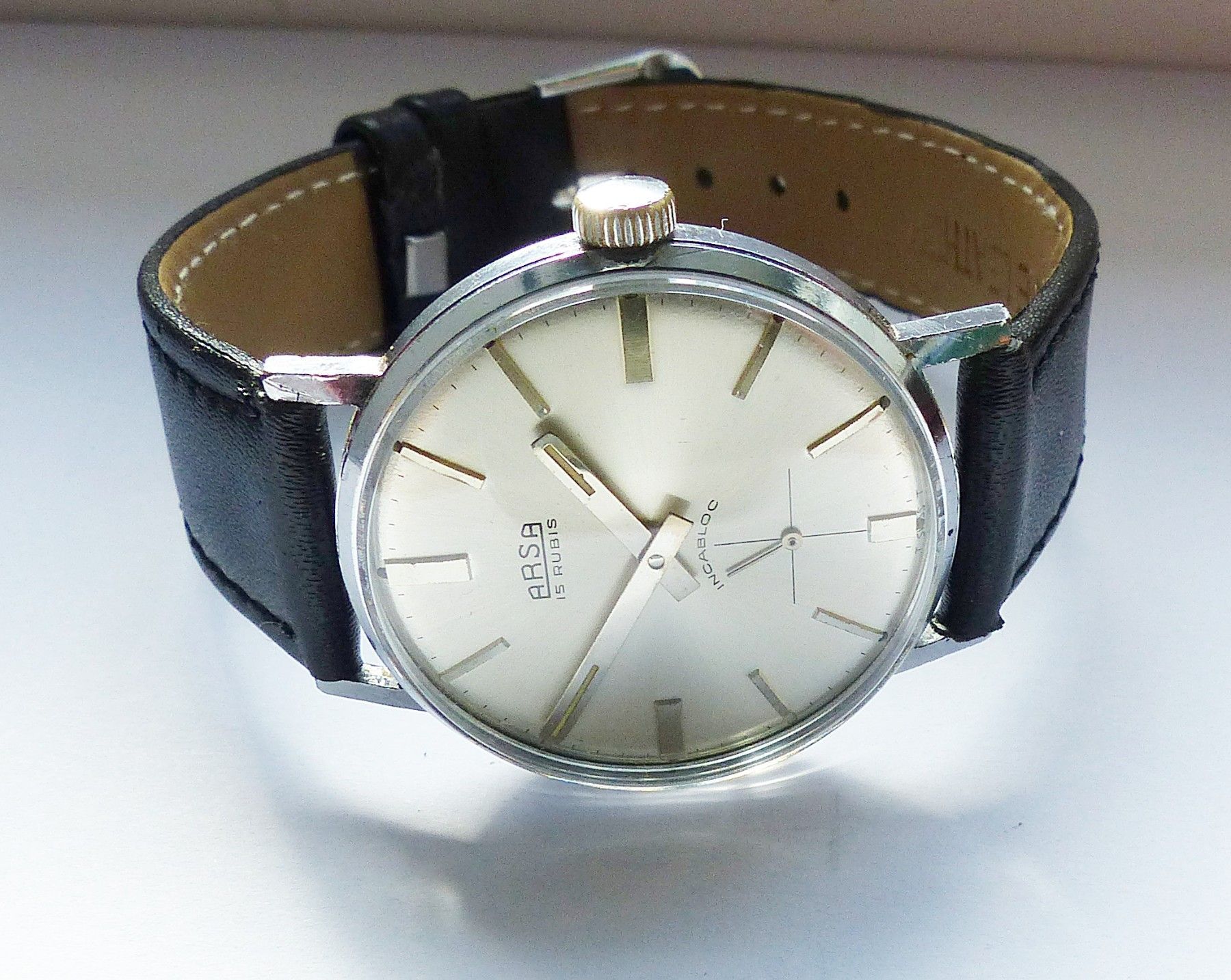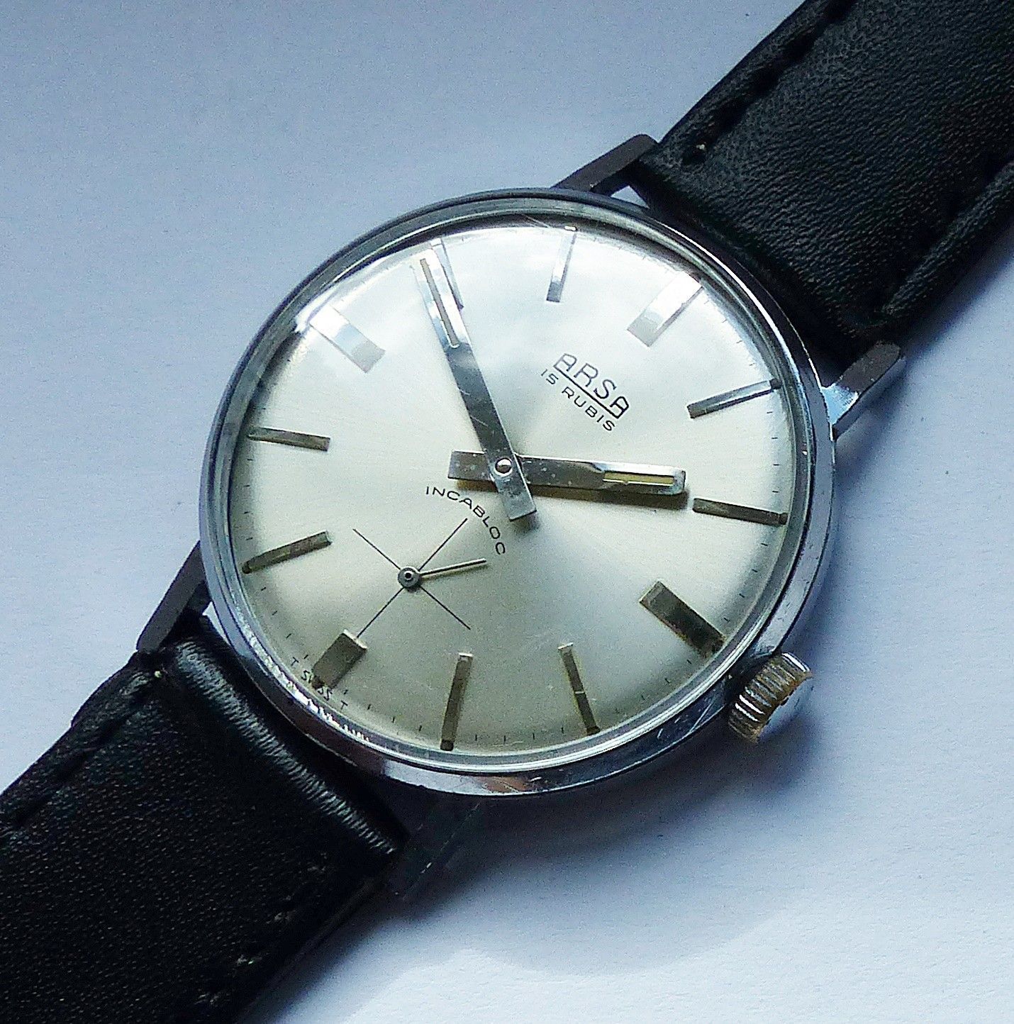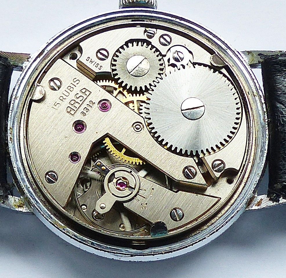 Schöne ARSA Classic Military Herren Vintage Armbanduhr mit Silbernem Zifferblatt im Sonnenschliff und aufgesetzten Silbernen Strichindizes, dezentraler kleiner Sekunde bei 6.00 Uhr, fluoreszierenden Zeigern und Indexpunkten. Die Uhr ist voll funktionsfähig und in Top Sammler-Zustand s. Fotos Herstel... Mehr