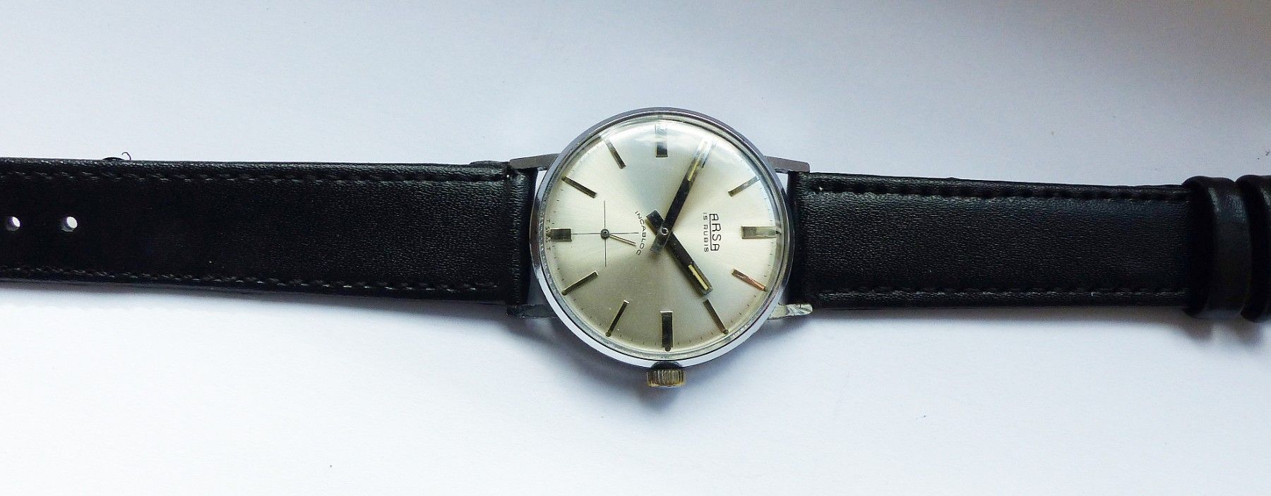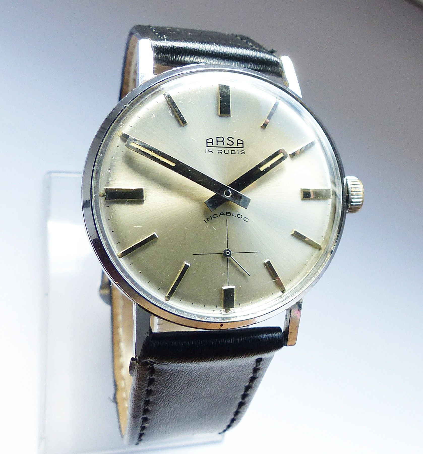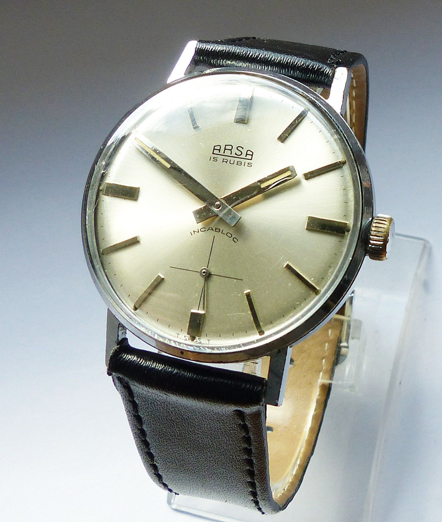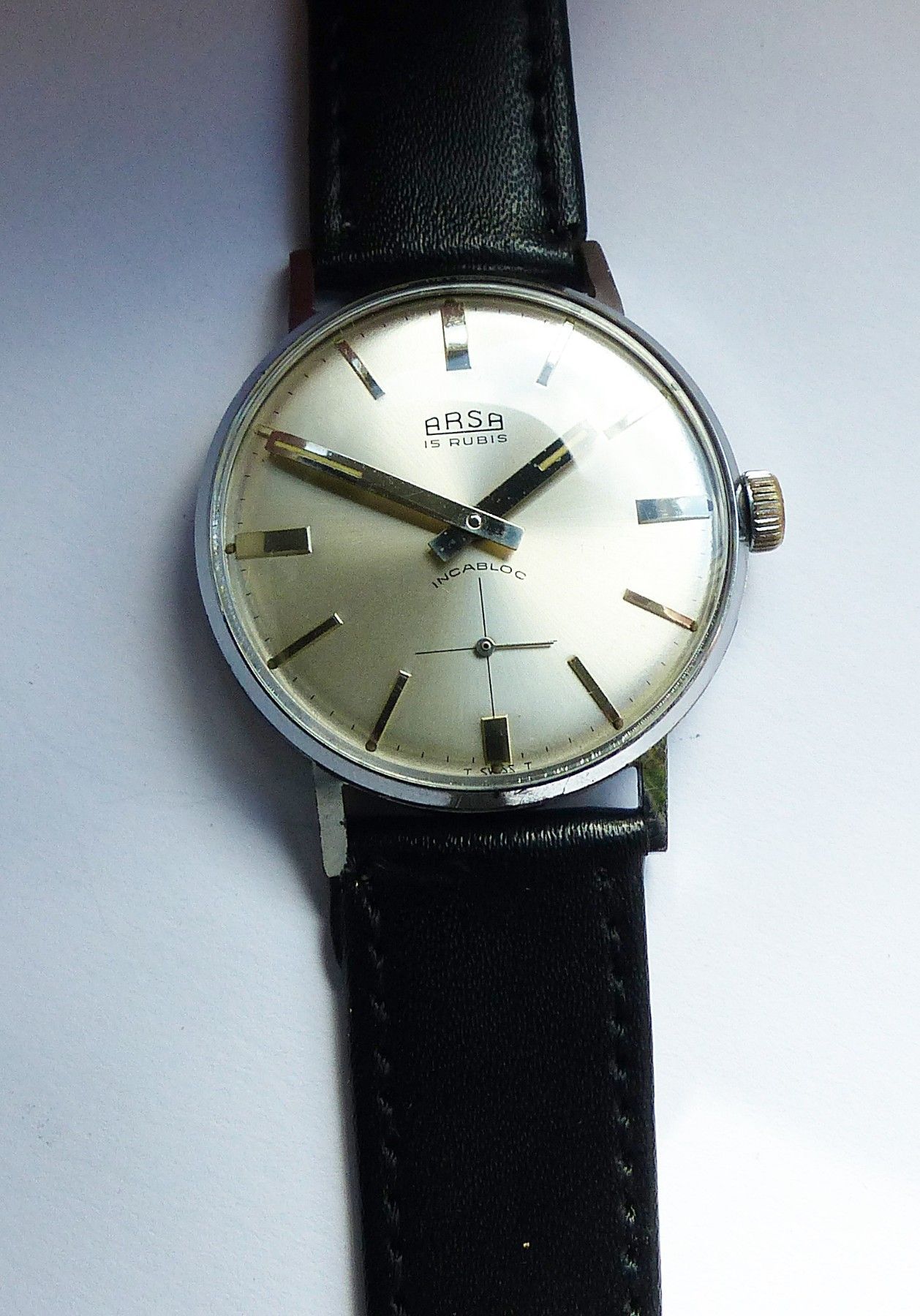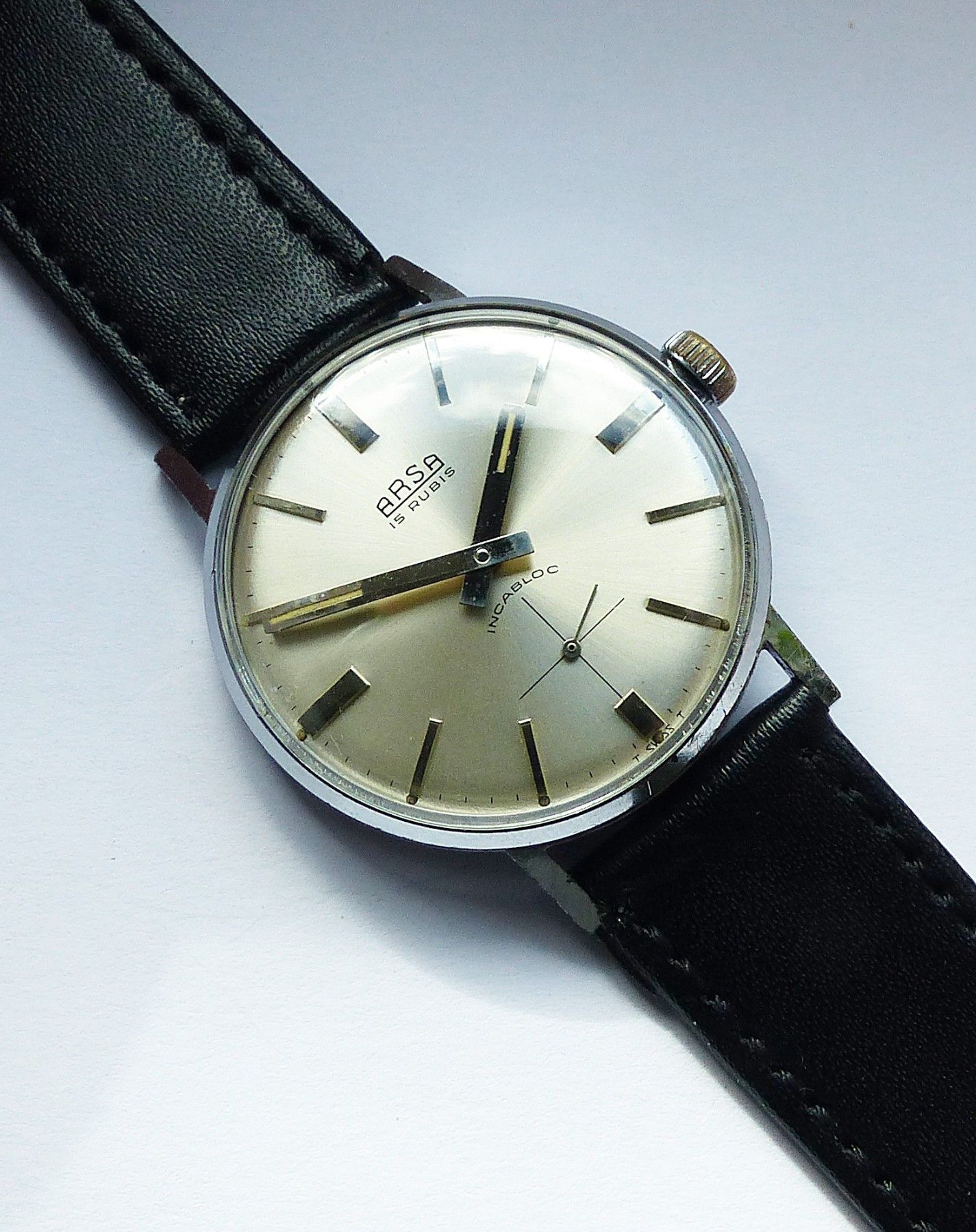 Schöne ARSA Classic Military Herren Vintage Armbanduhr mit Silbernem Zifferblatt im Sonnenschliff und aufgesetzten Silbernen Strichindizes, dezentraler kleiner Sekunde bei 6.00 Uhr, fluoreszierenden Zeigern und Indexpunkten. Die Uhr ist voll funktionsfähig und in Top Sammler-Zustand s. Fotos Herstel... Mehr
