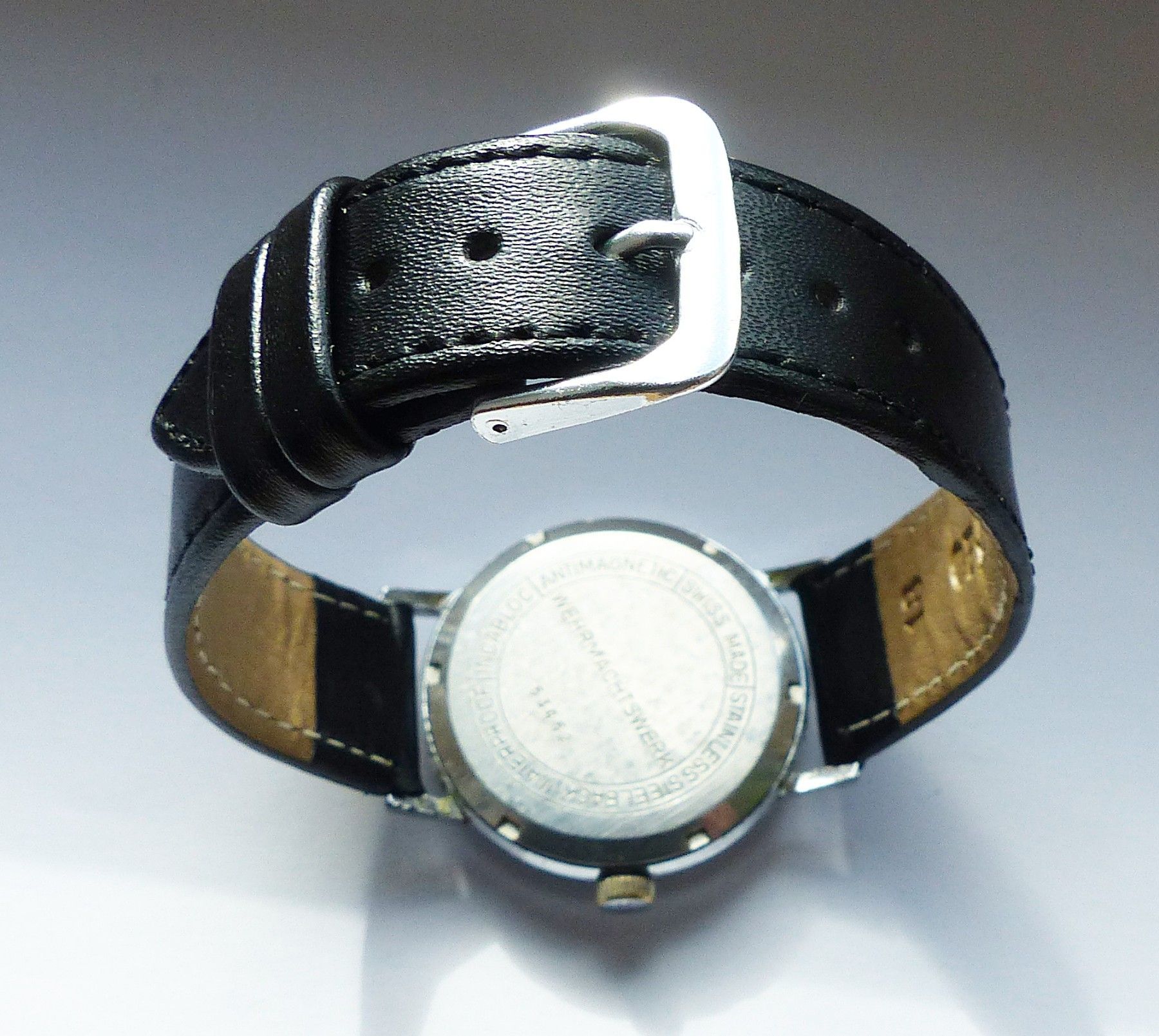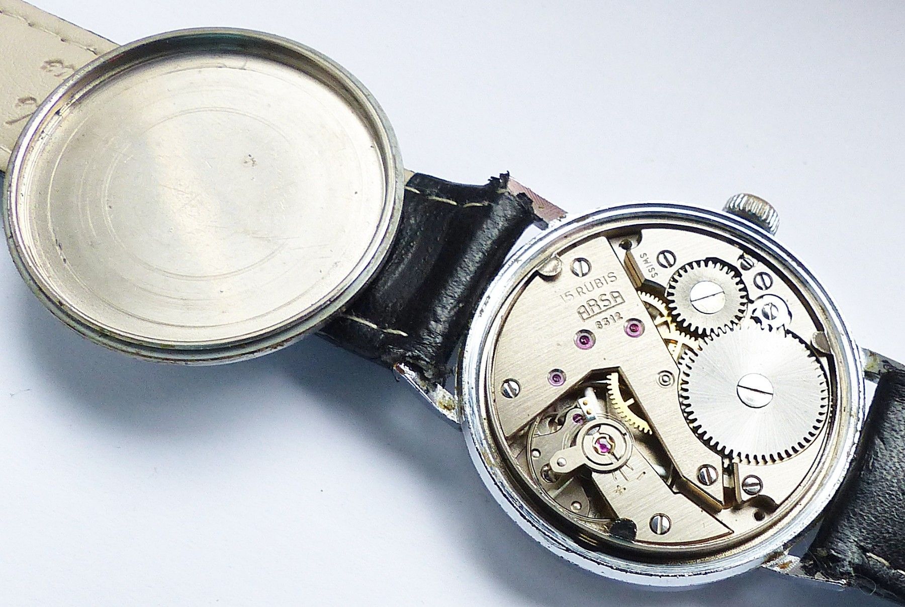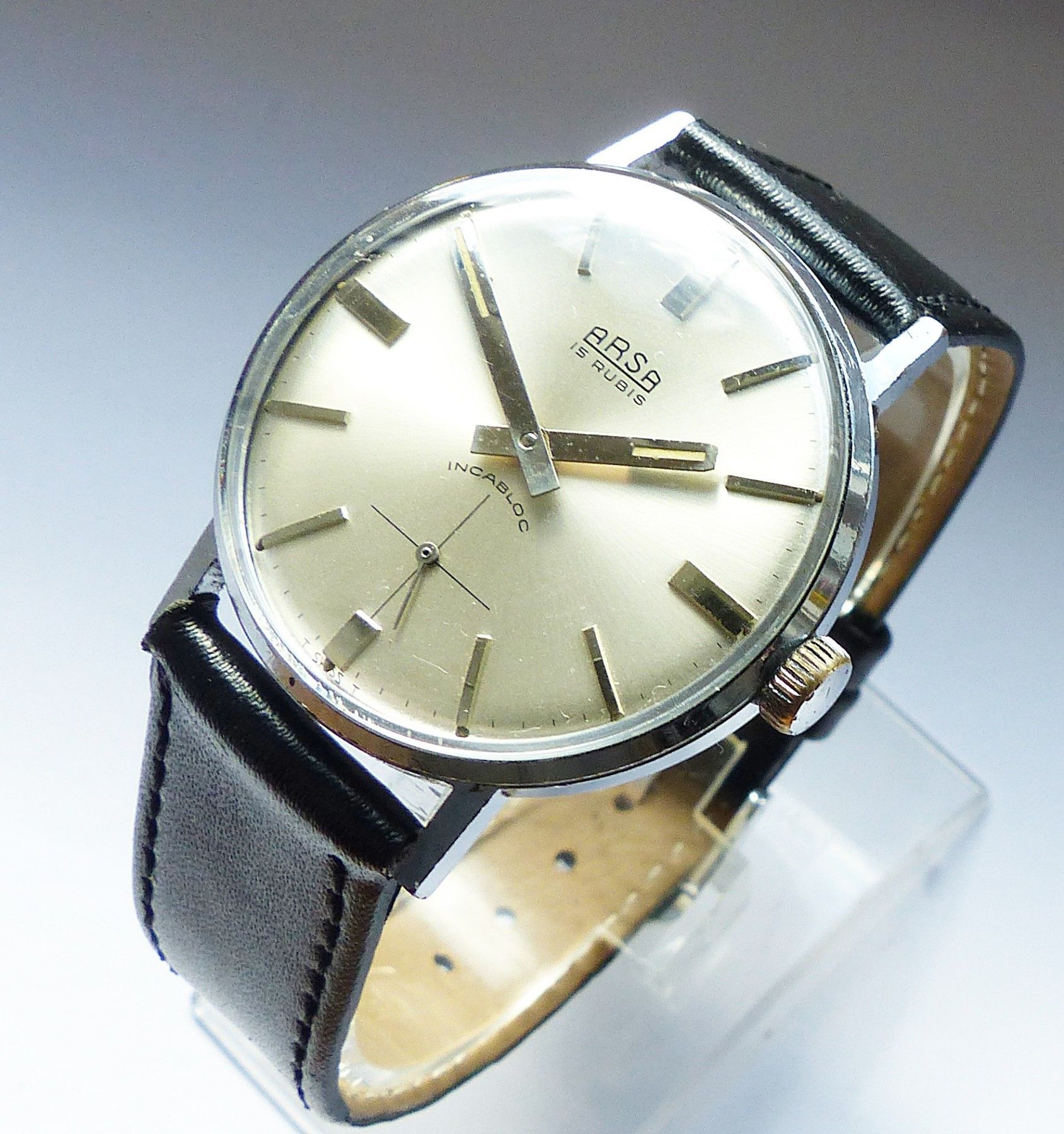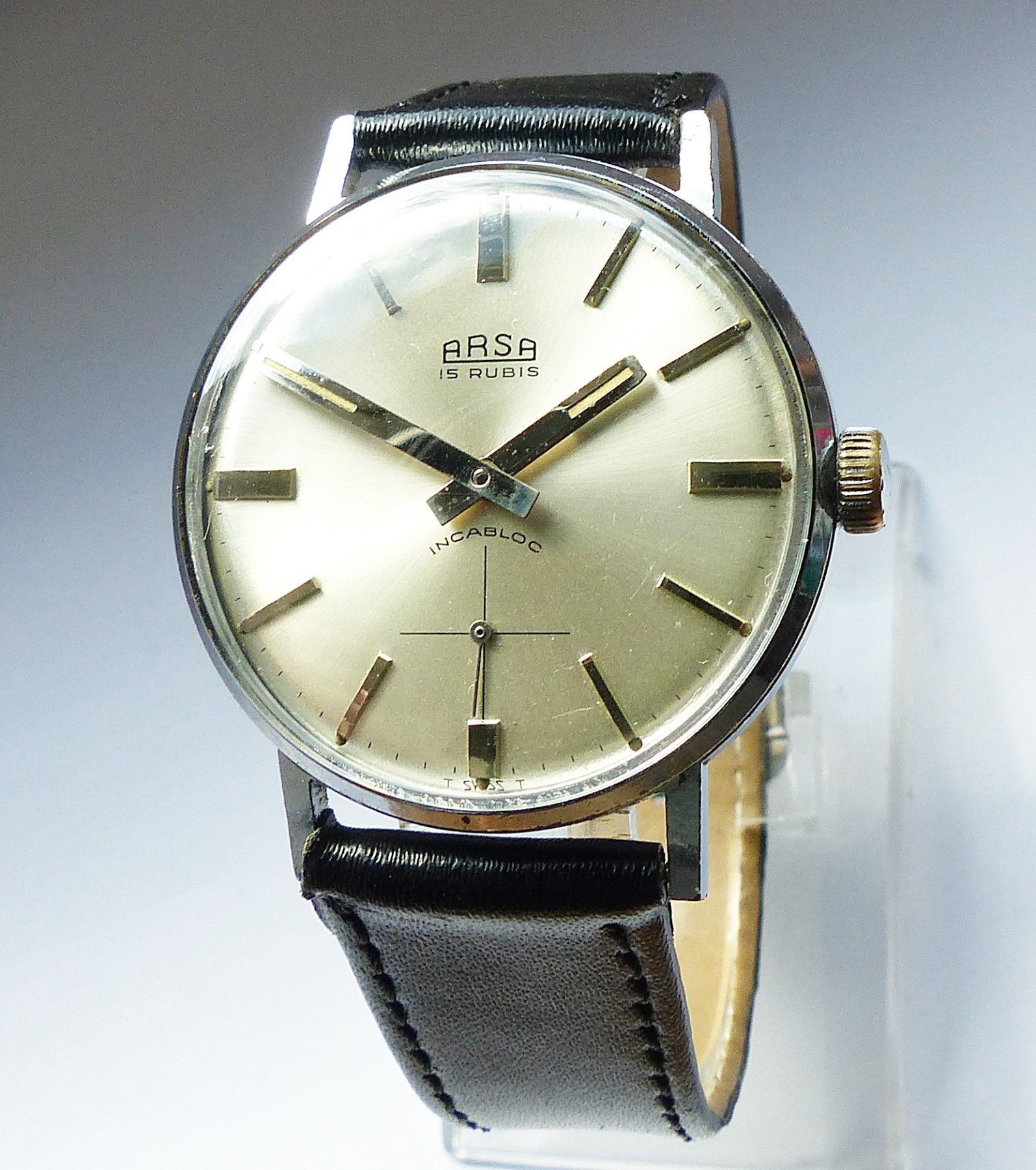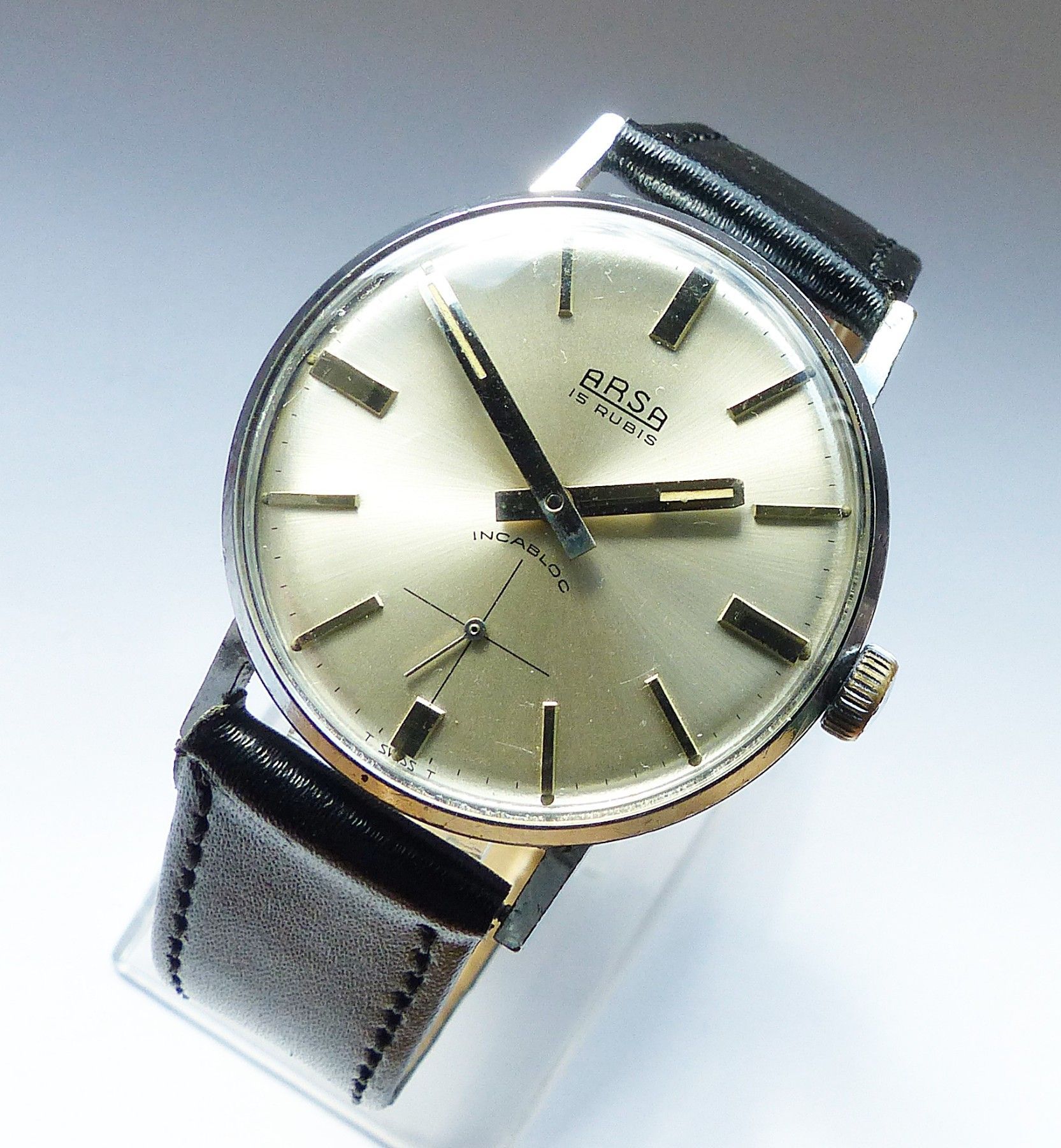 Schöne ARSA Classic Military Herren Vintage Armbanduhr mit Silbernem Zifferblatt im Sonnenschliff und aufgesetzten Silbernen Strichindizes, dezentraler kleiner Sekunde bei 6.00 Uhr, fluoreszierenden Zeigern und Indexpunkten. Die Uhr ist voll funktionsfähig und in Top Sammler-Zustand s. Fotos Herstel... Mehr