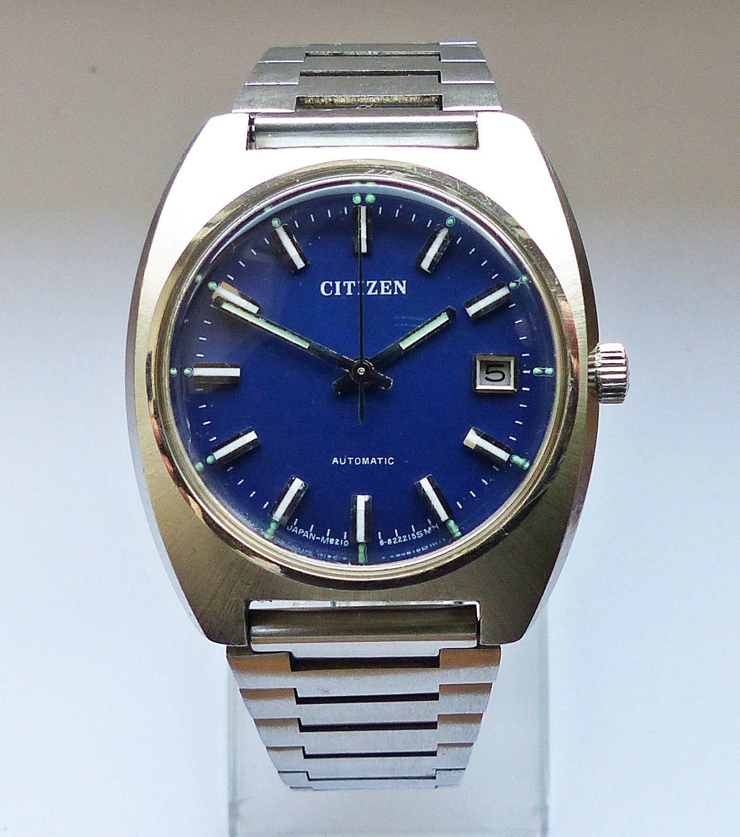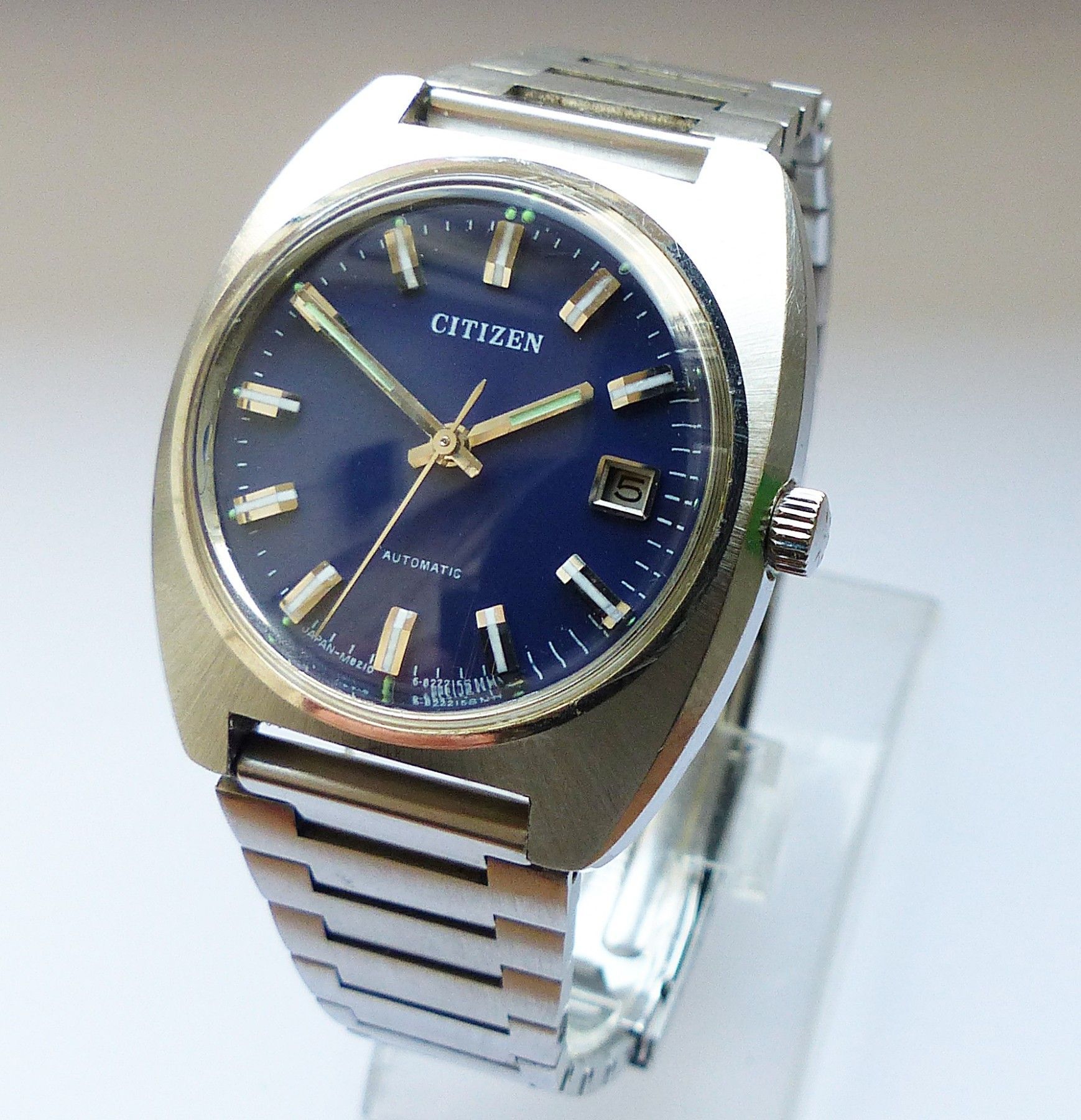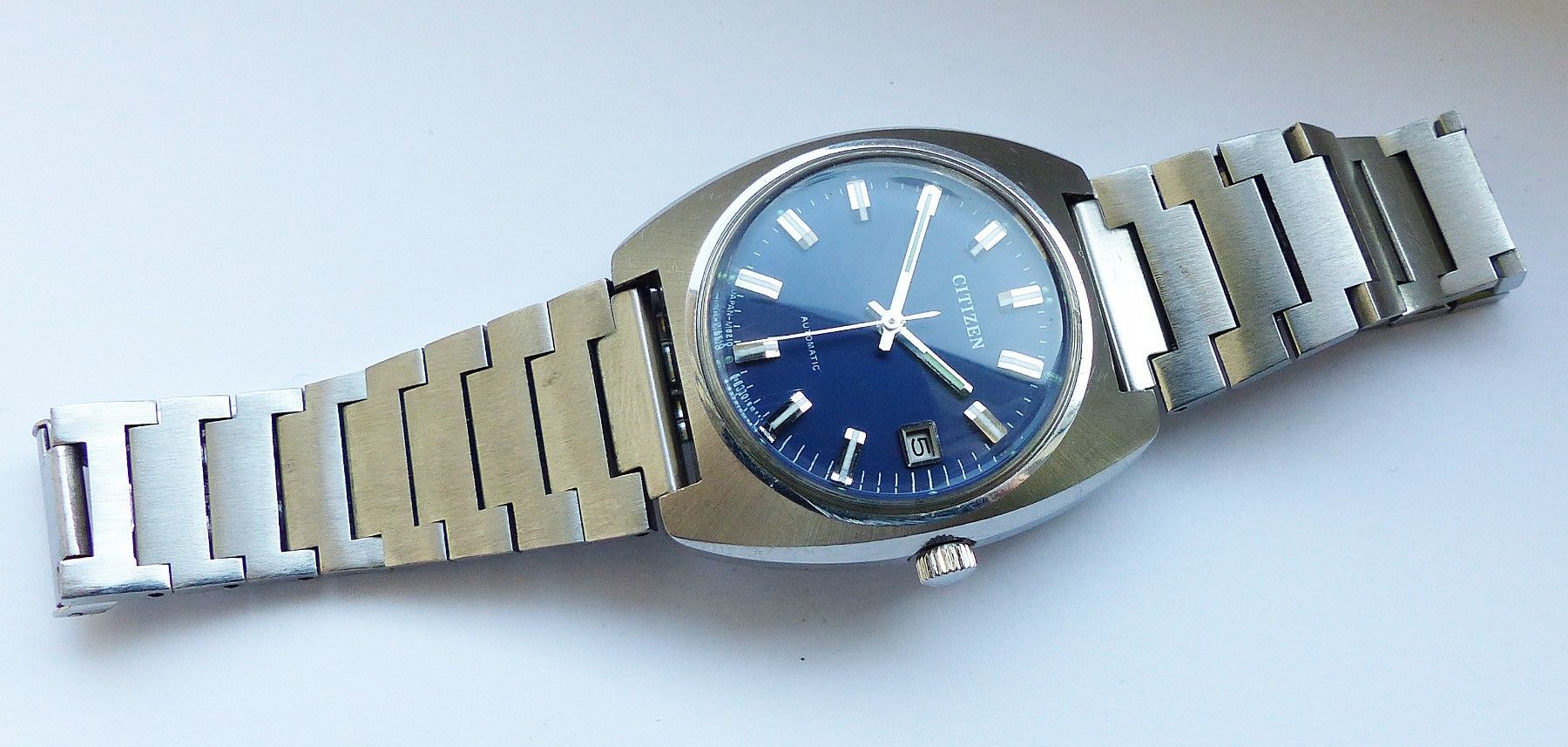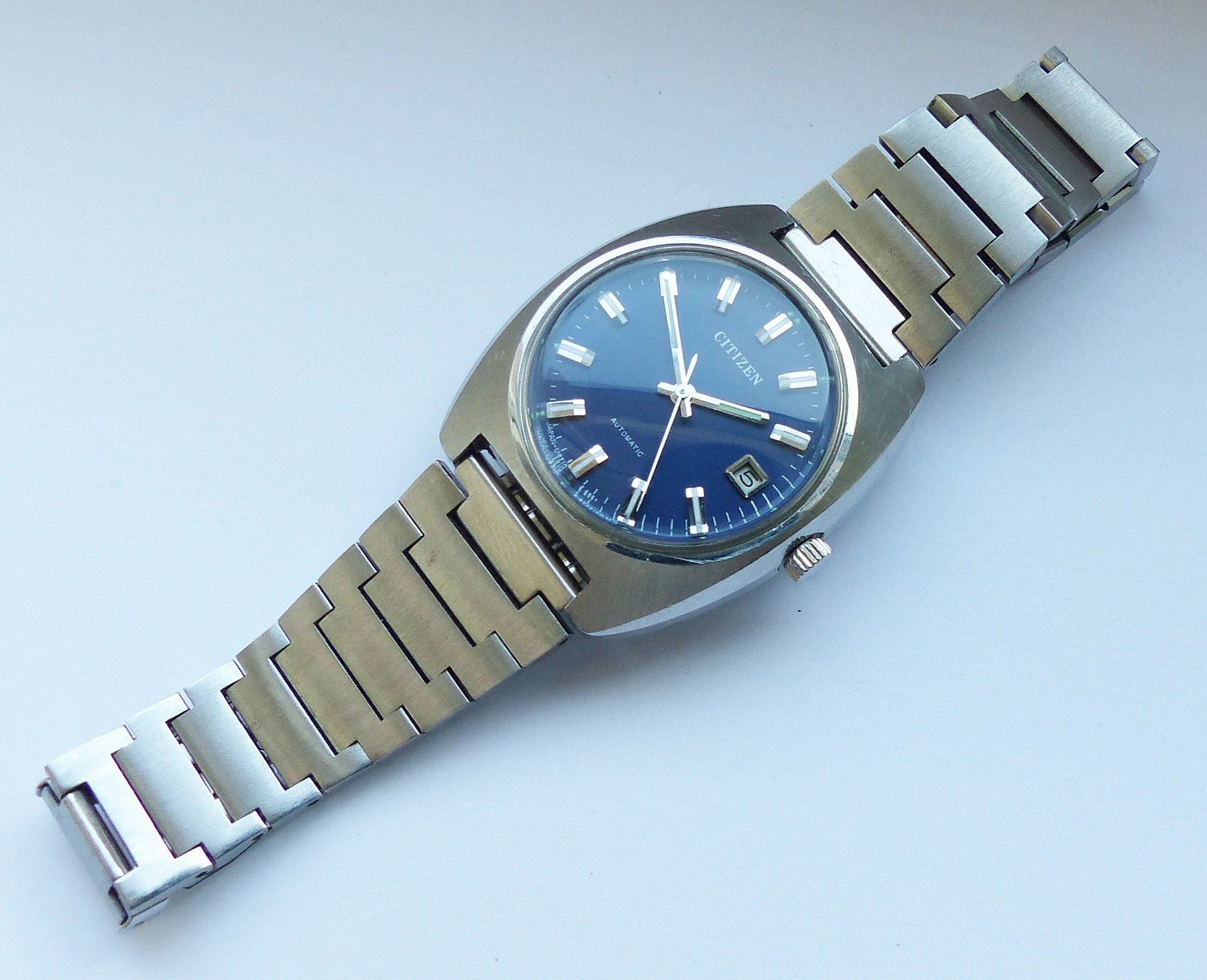 Schöne Citizen Automatic Calendar Herren Vintage Armbanduhr mit Blauen Zifferblatt und aufgesetzten Silber-Weissen Strichindexen, grosser zentraler Sekunde, Datum bei 3.00 Uhr, fluoreszierenden Zeigern und Indizes. Die Uhr ist voll funktionsfähig und in Top Zustand s. Fotos Uhrwerk : Kaliber Citizen