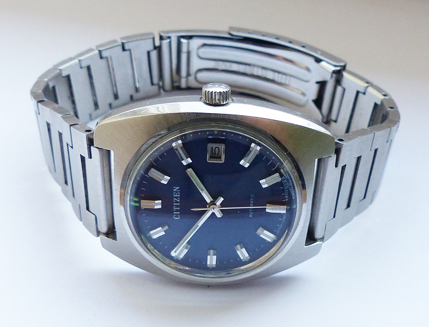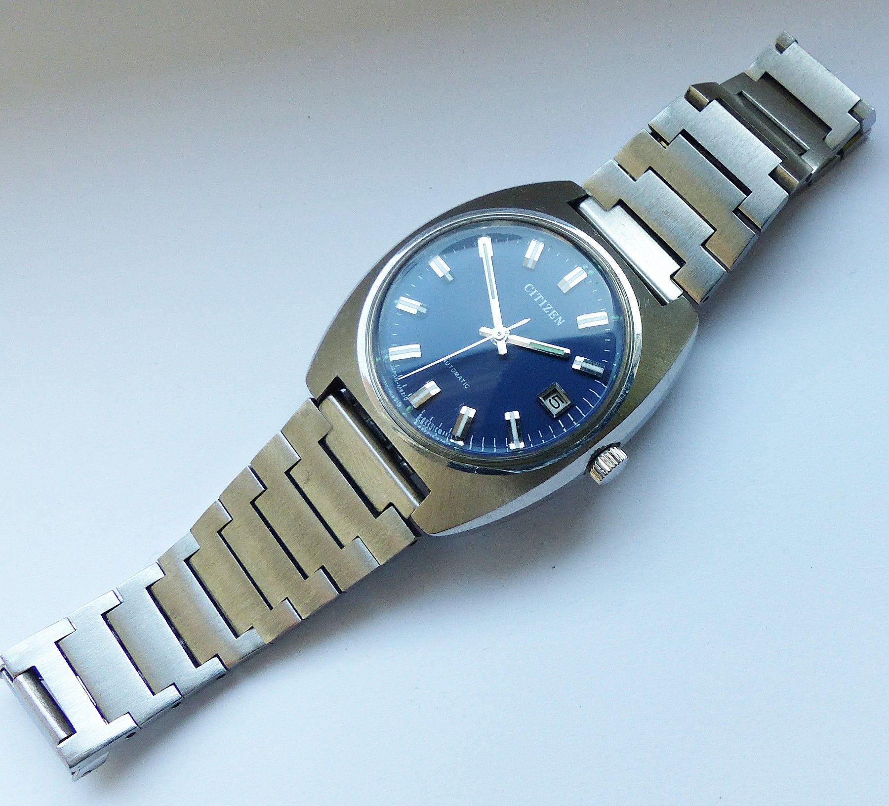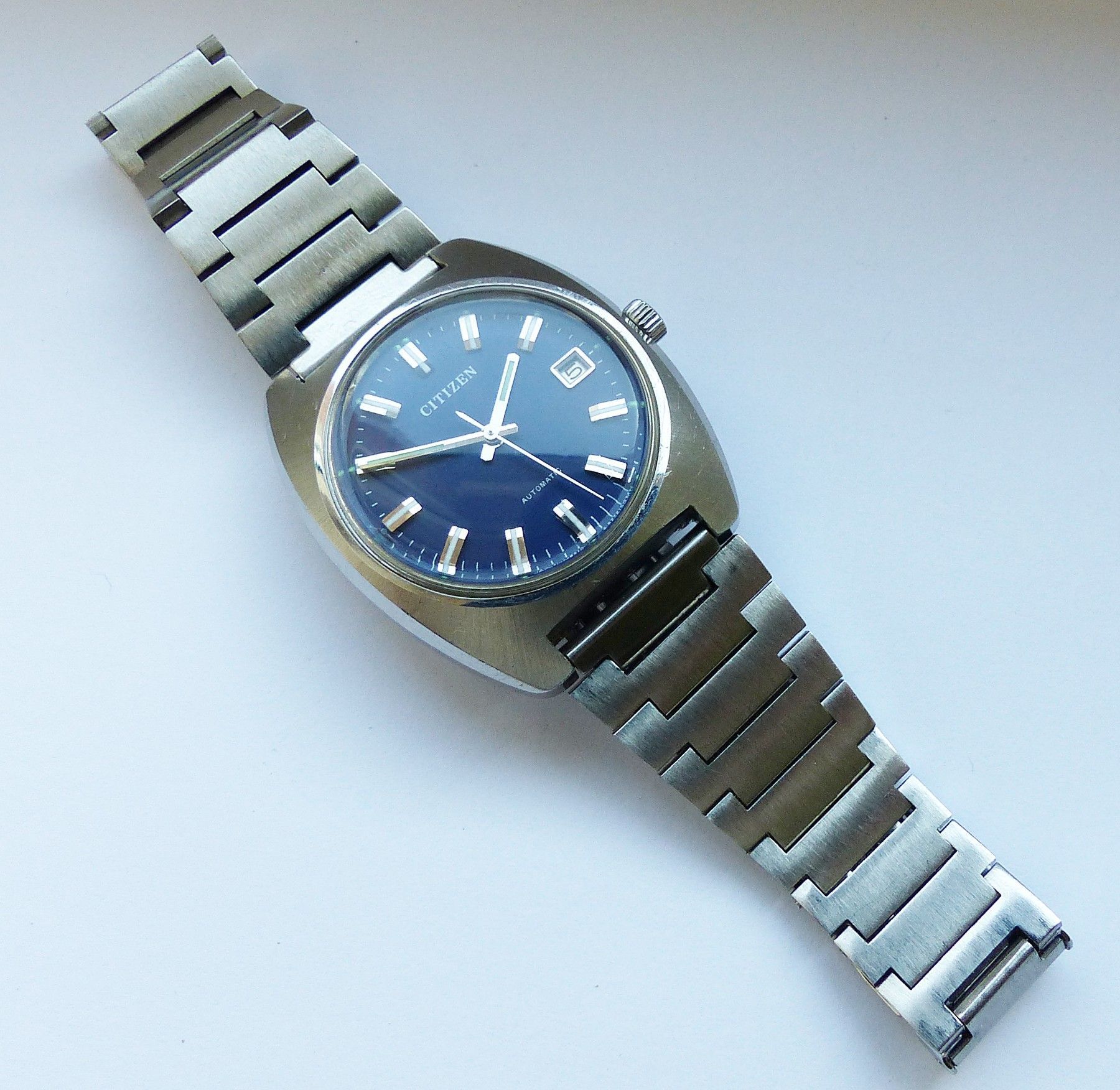 Schöne Citizen Automatic Calendar Herren Vintage Armbanduhr mit Blauen Zifferblatt und aufgesetzten Silber-Weissen Strichindexen, grosser zentraler Sekunde, Datum bei 3.00 Uhr, fluoreszierenden Zeigern und Indizes. Die Uhr ist voll funktionsfähig und in Top Zustand s. Fotos Uhrwerk : Kaliber Citizen