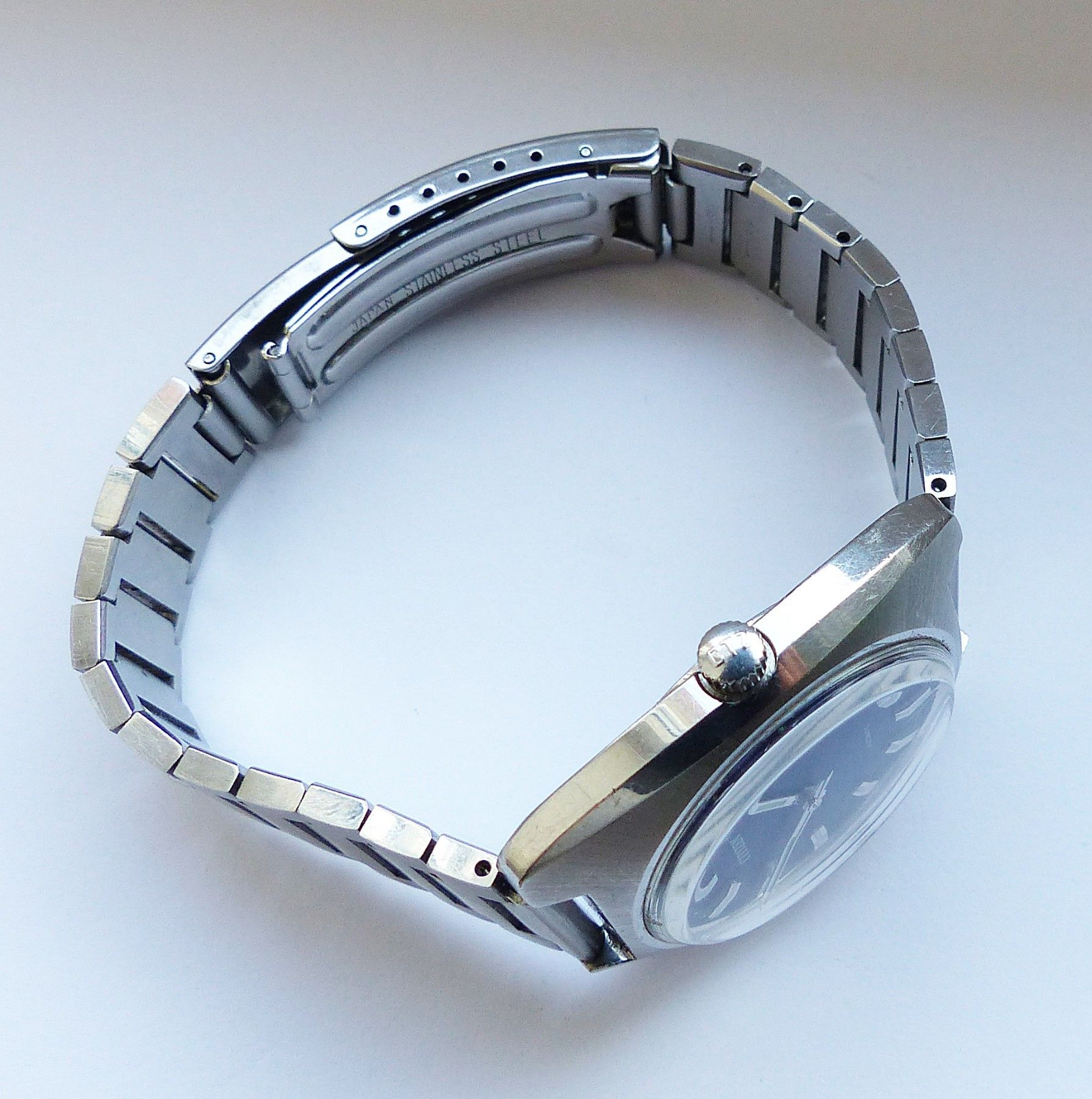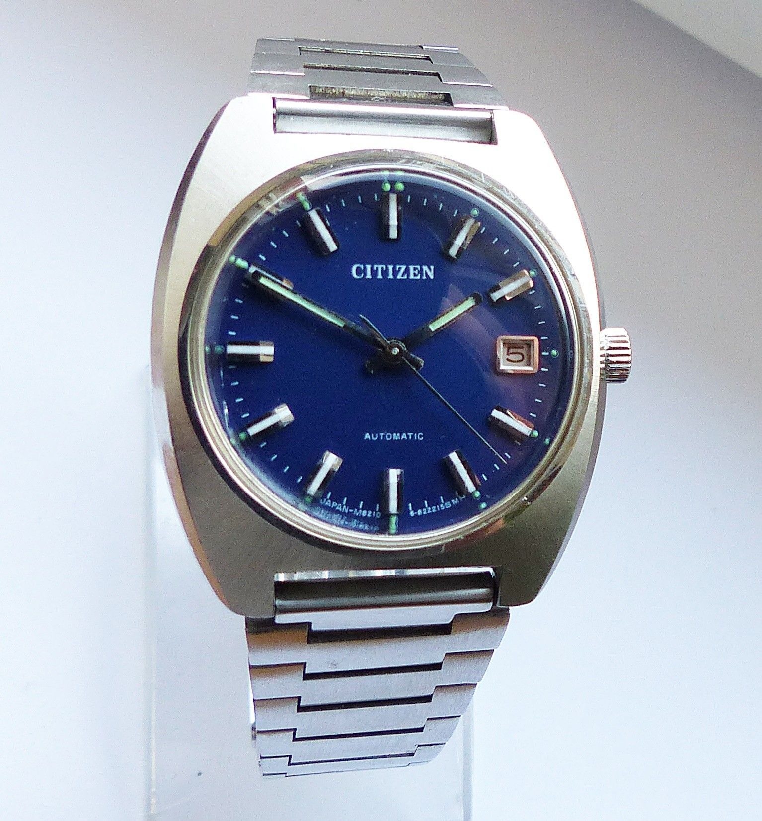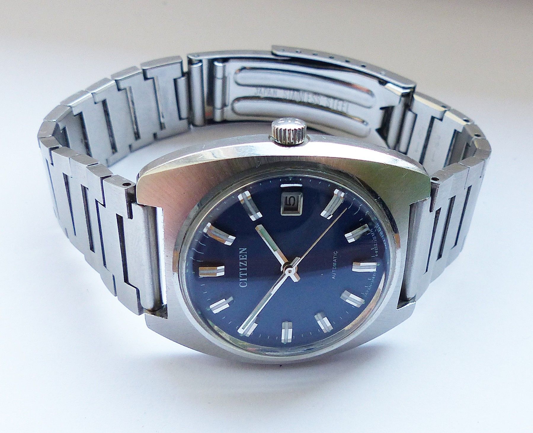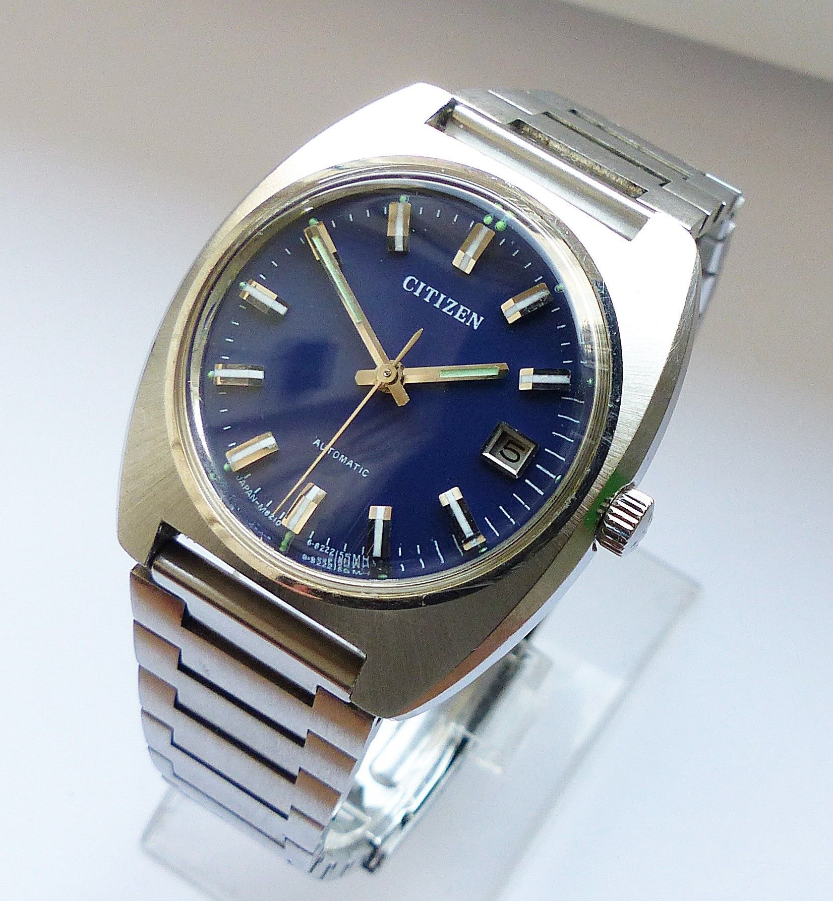 Schöne Citizen Automatic Calendar Herren Vintage Armbanduhr mit Blauen Zifferblatt und aufgesetzten Silber-Weissen Strichindexen, grosser zentraler Sekunde, Datum bei 3.00 Uhr, fluoreszierenden Zeigern und Indizes. Die Uhr ist voll funktionsfähig und in Top Zustand s. Fotos Uhrwerk : Kaliber Citizen
