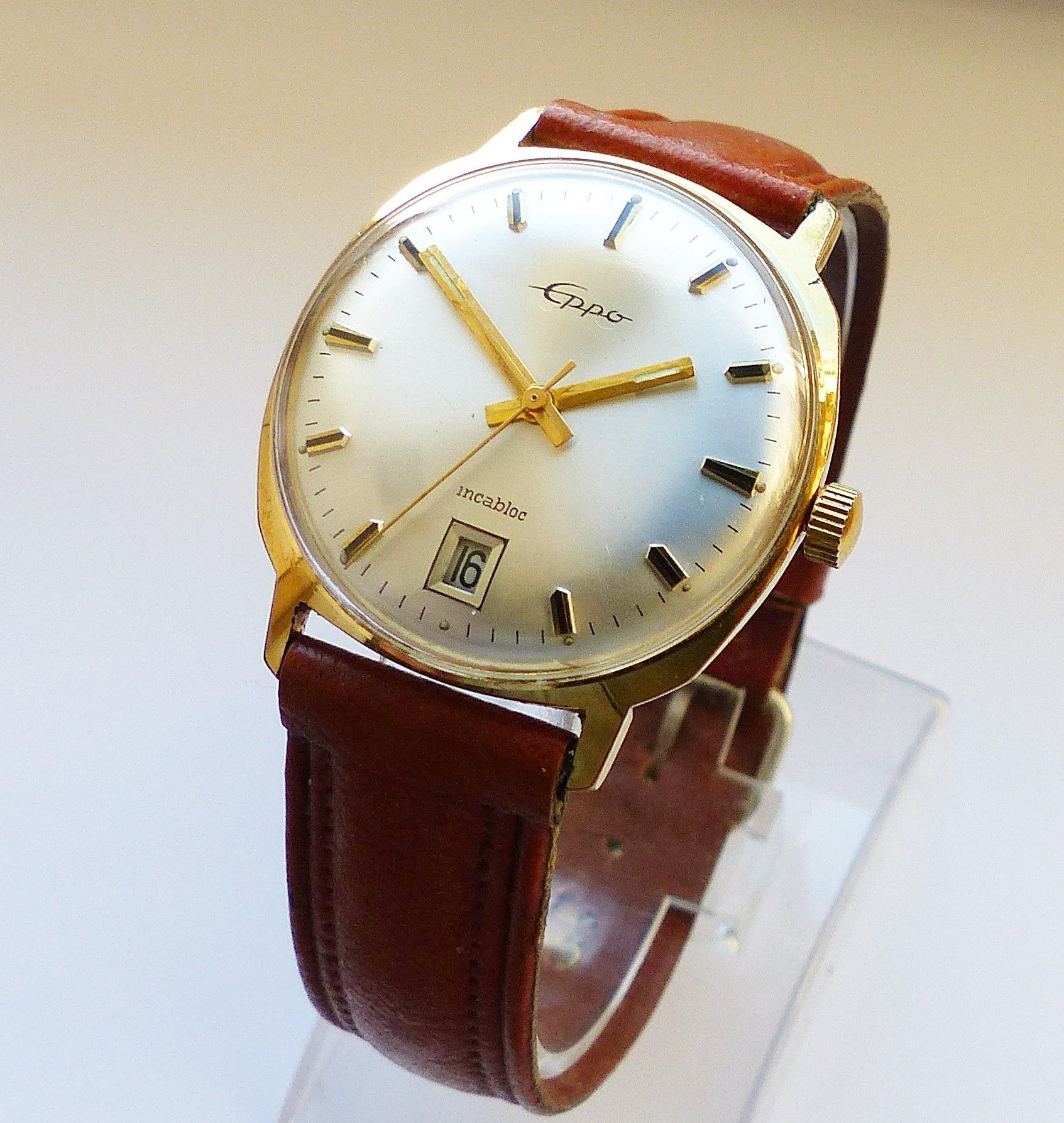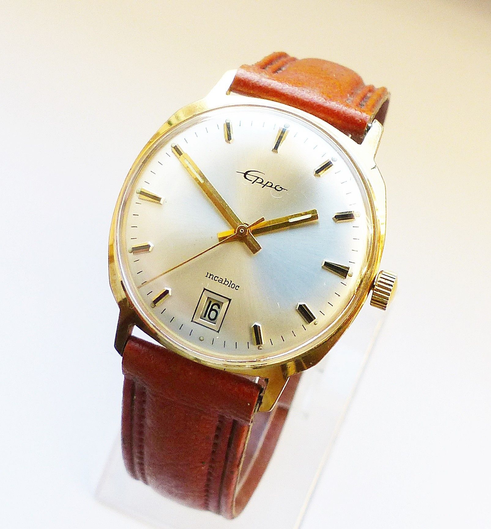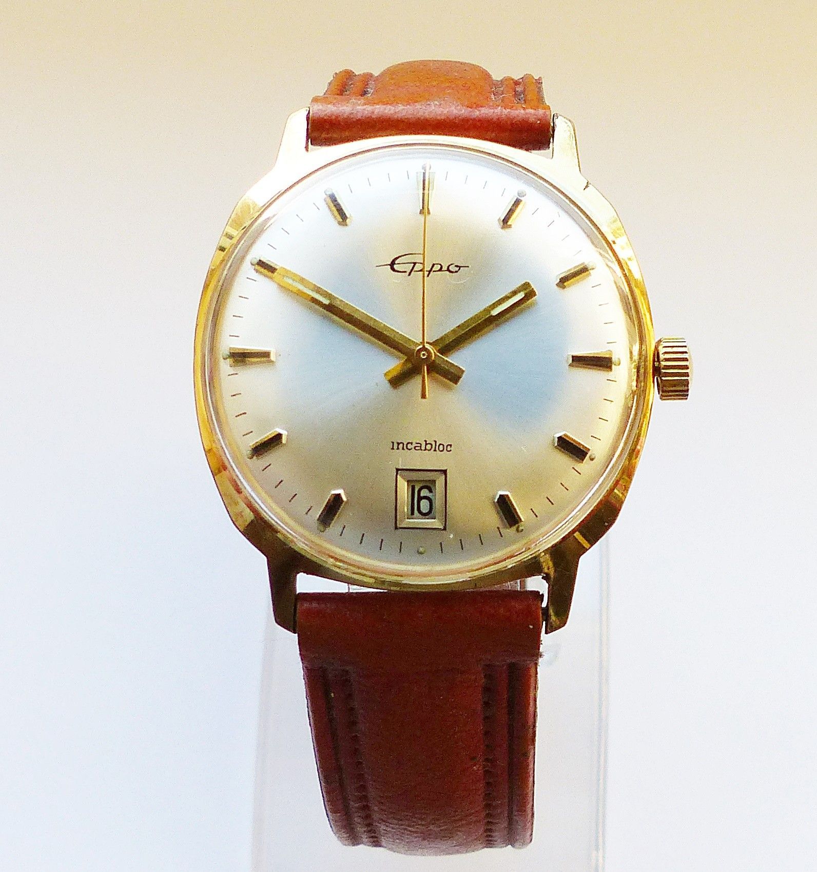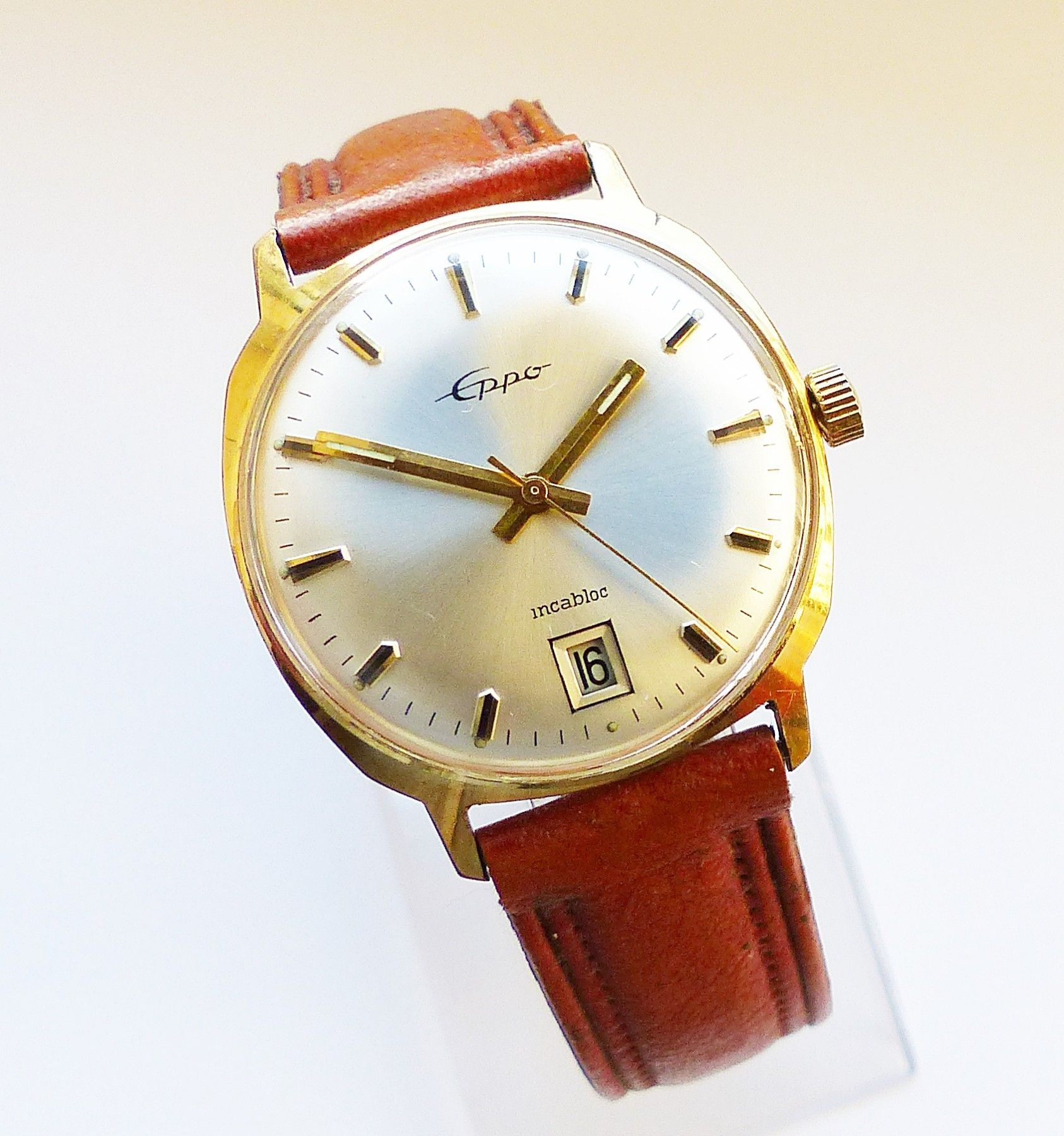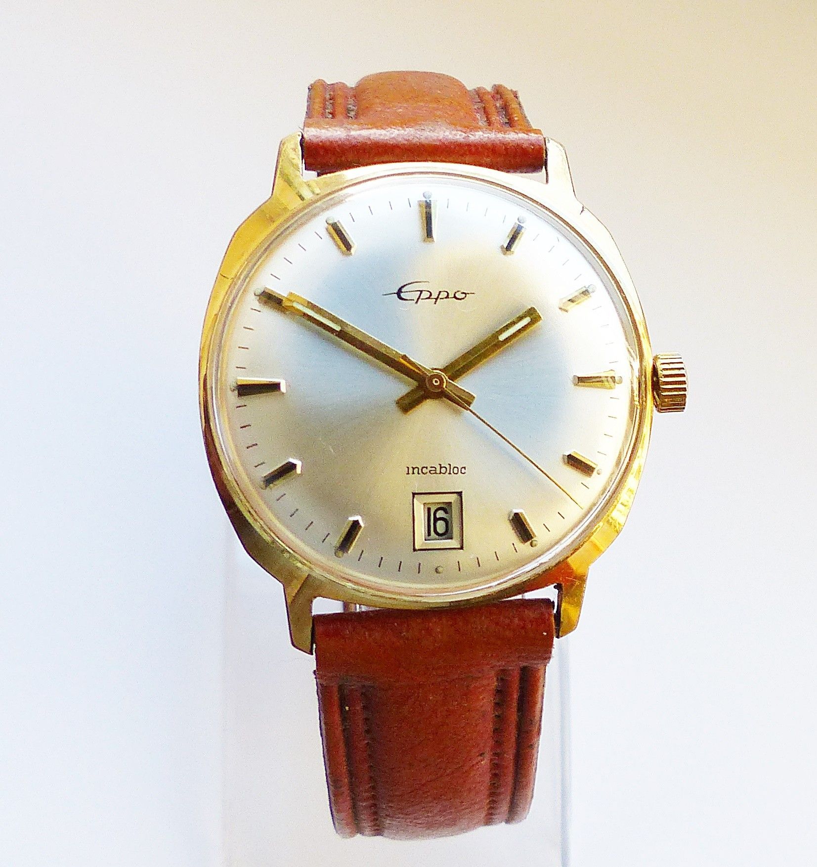 Schöne Eppo Classic Calendar Herren Vintage Armbanduhr mit Goldenem Zifferblatt im Sonnenschliff und aufgesetzten Gold-Schwarzen Strichindizes, grosser zentraler Sekunde, Datum bei 6.00 Uhr, fluoreszierenden Zeigern und Indexpunkten. Die Uhr ist voll funktionsfähig und in guten getragenen Zustand s.... Mehr