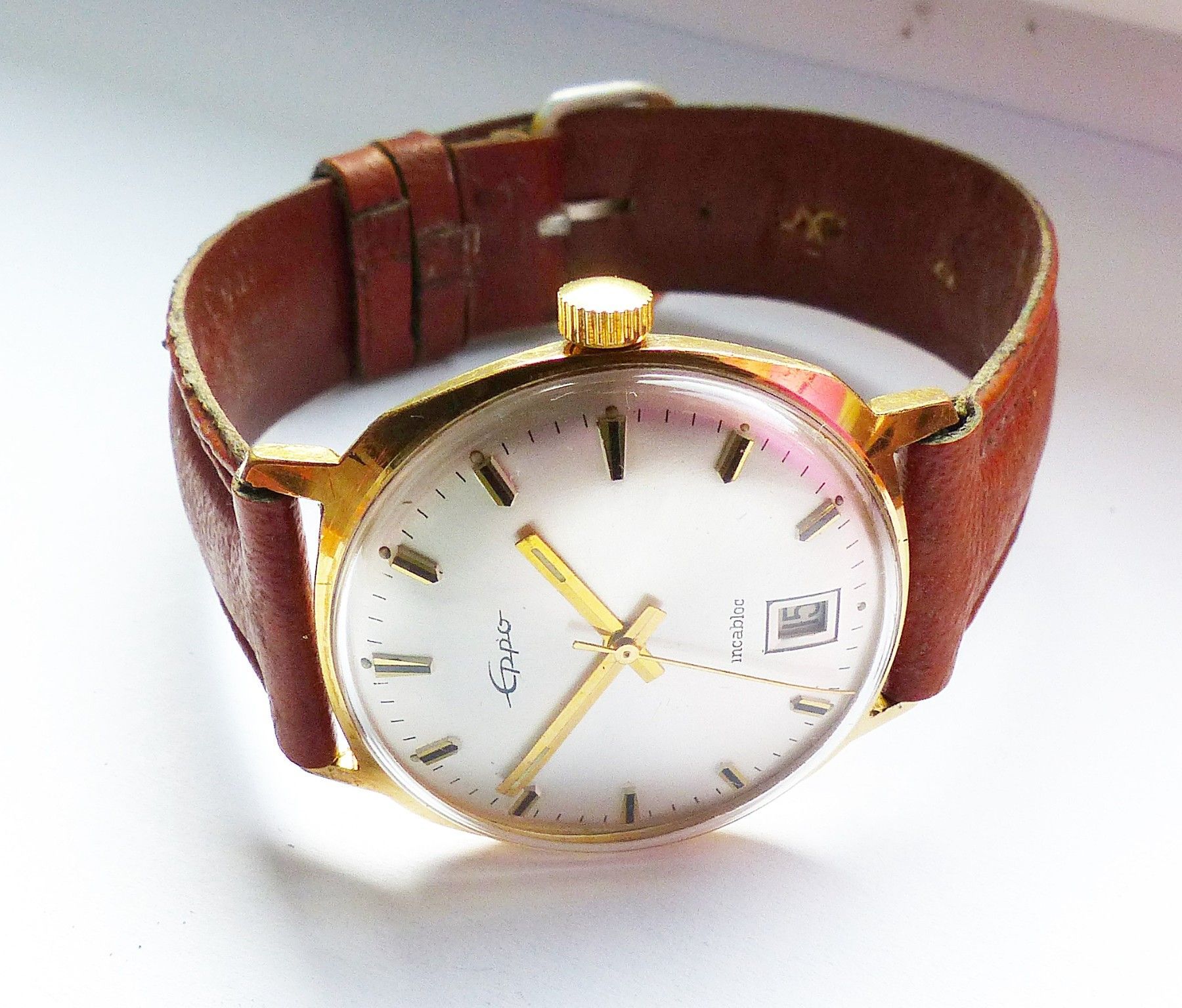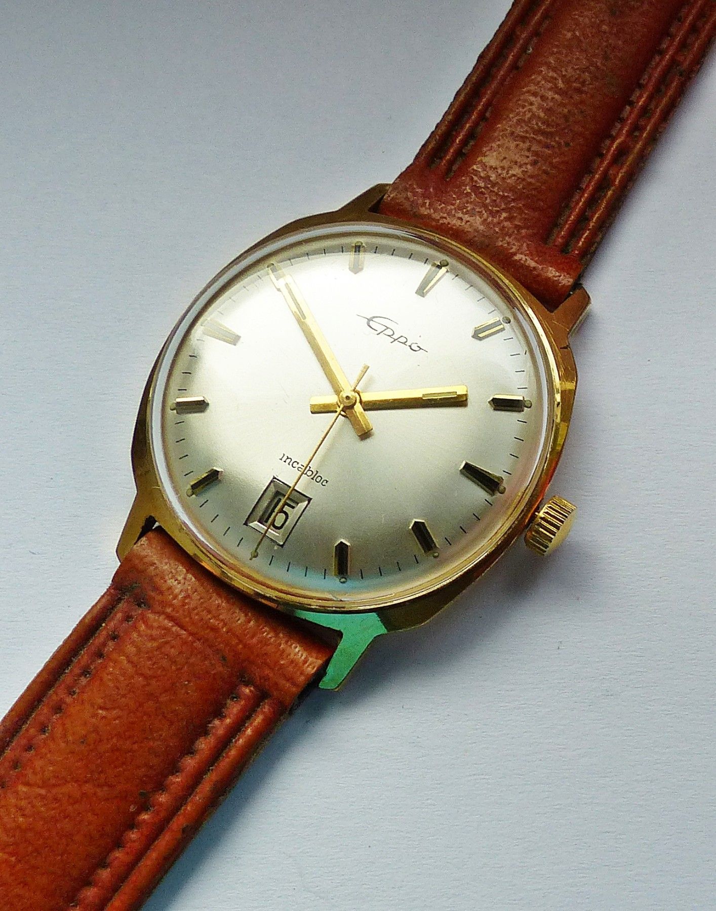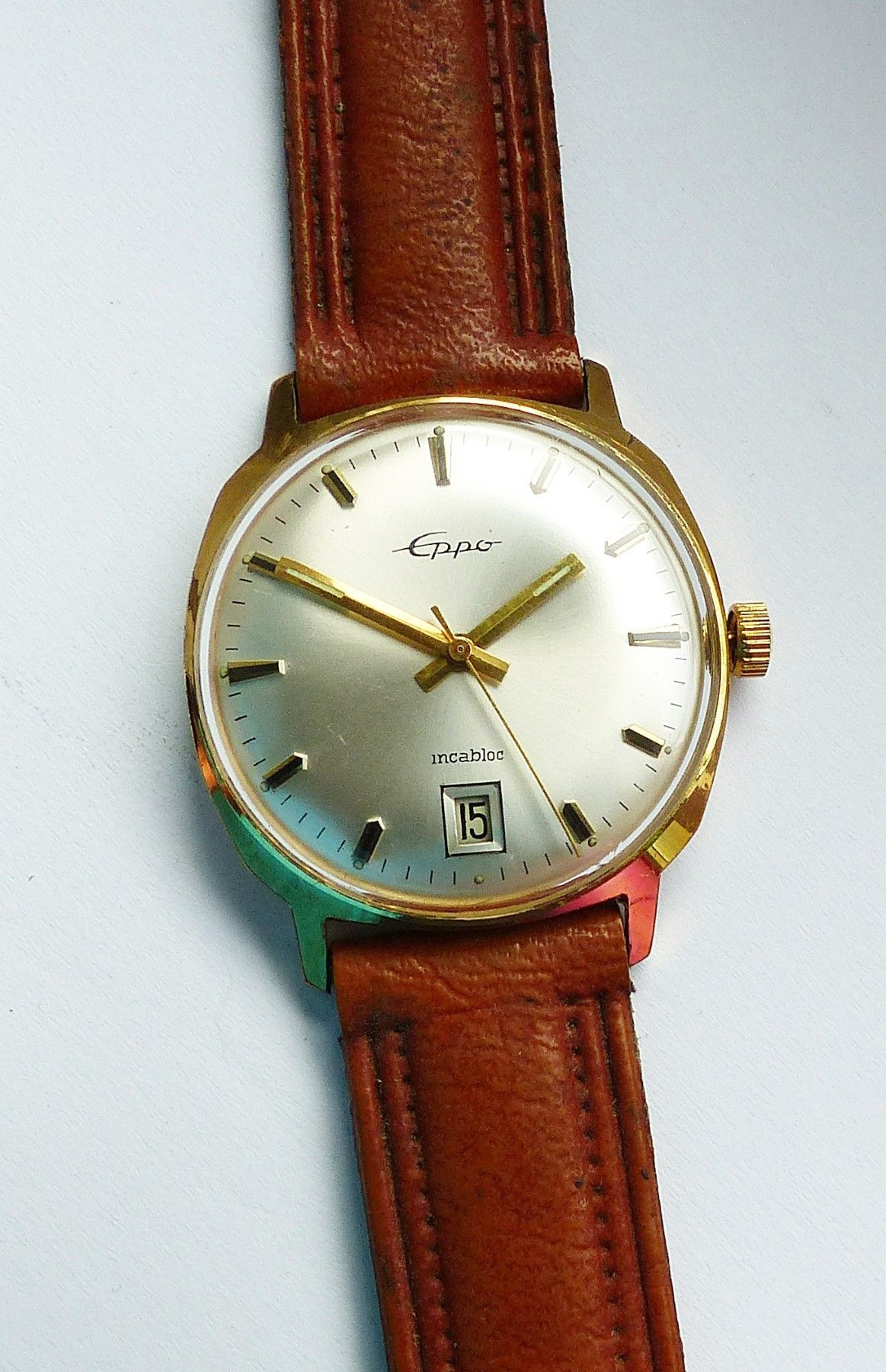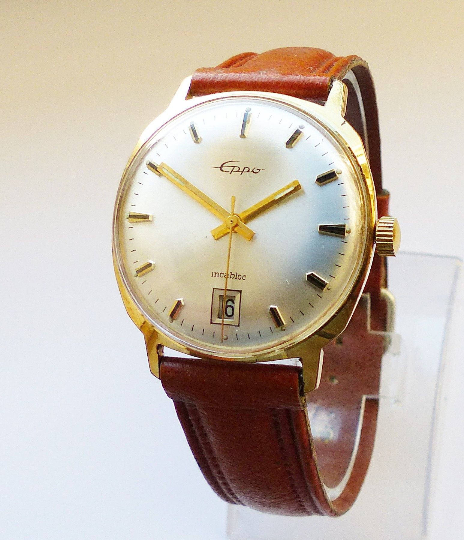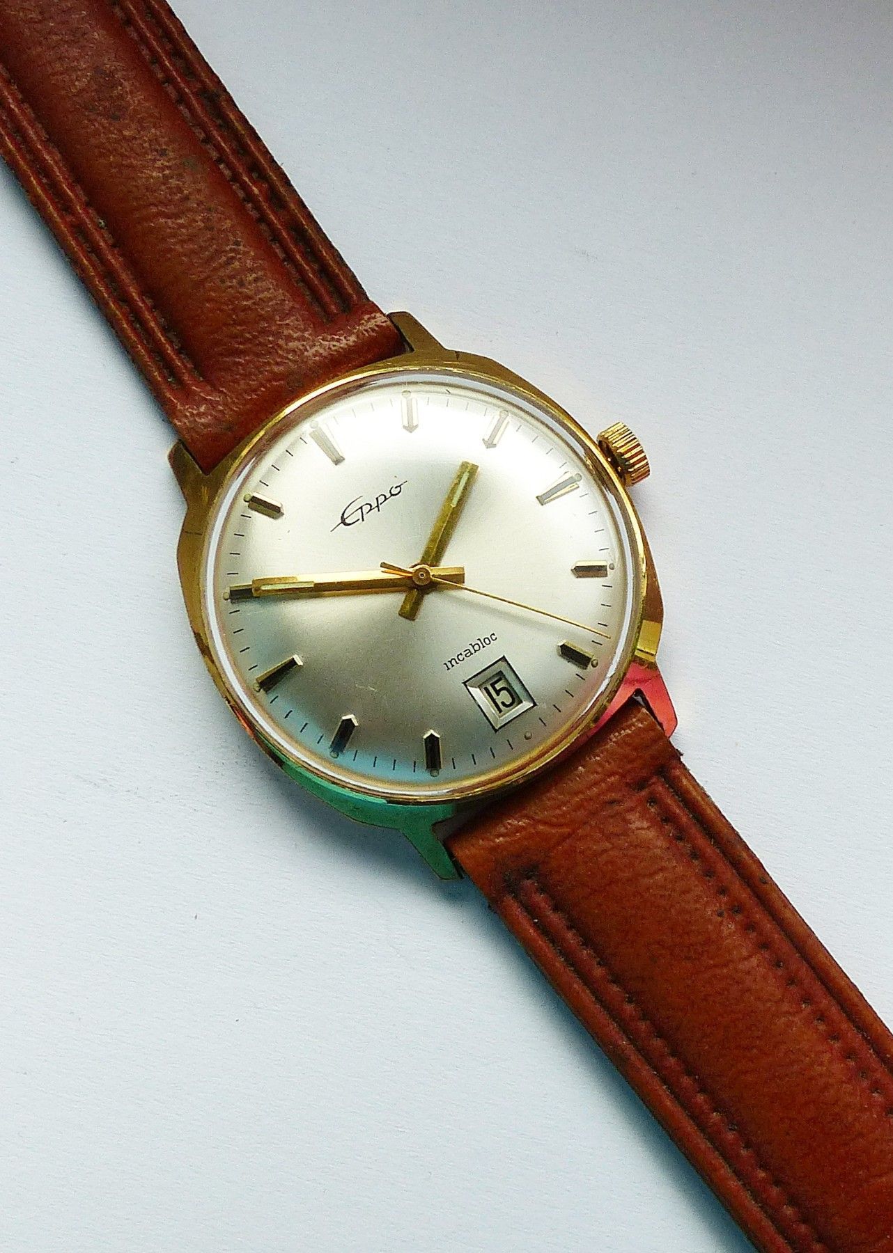 Schöne Eppo Classic Calendar Herren Vintage Armbanduhr mit Goldenem Zifferblatt im Sonnenschliff und aufgesetzten Gold-Schwarzen Strichindizes, grosser zentraler Sekunde, Datum bei 6.00 Uhr, fluoreszierenden Zeigern und Indexpunkten. Die Uhr ist voll funktionsfähig und in guten getragenen Zustand s.... Mehr