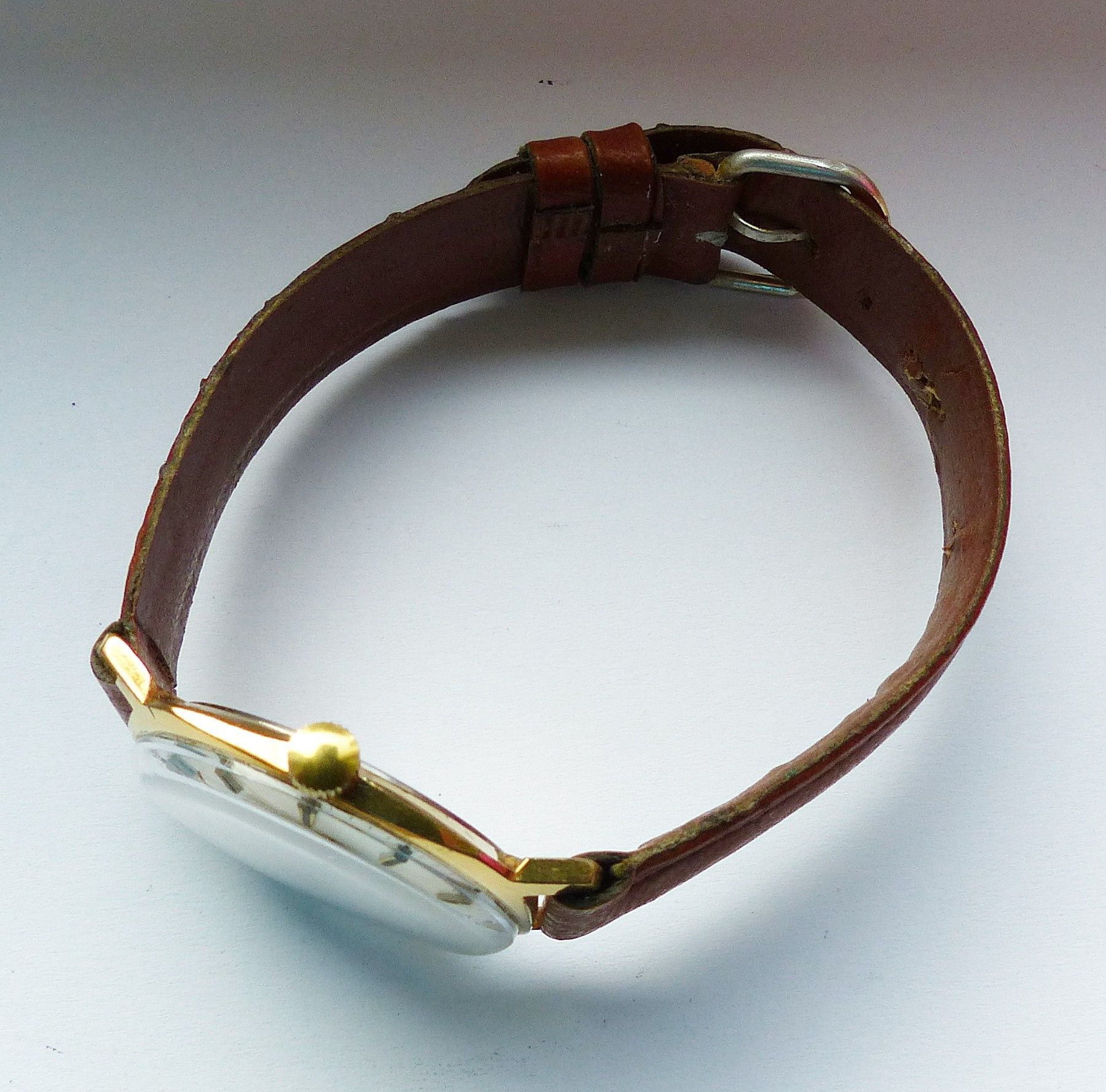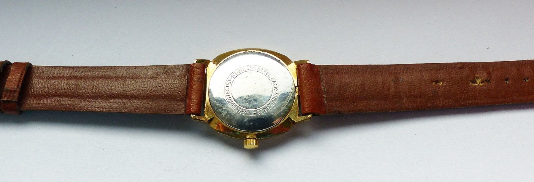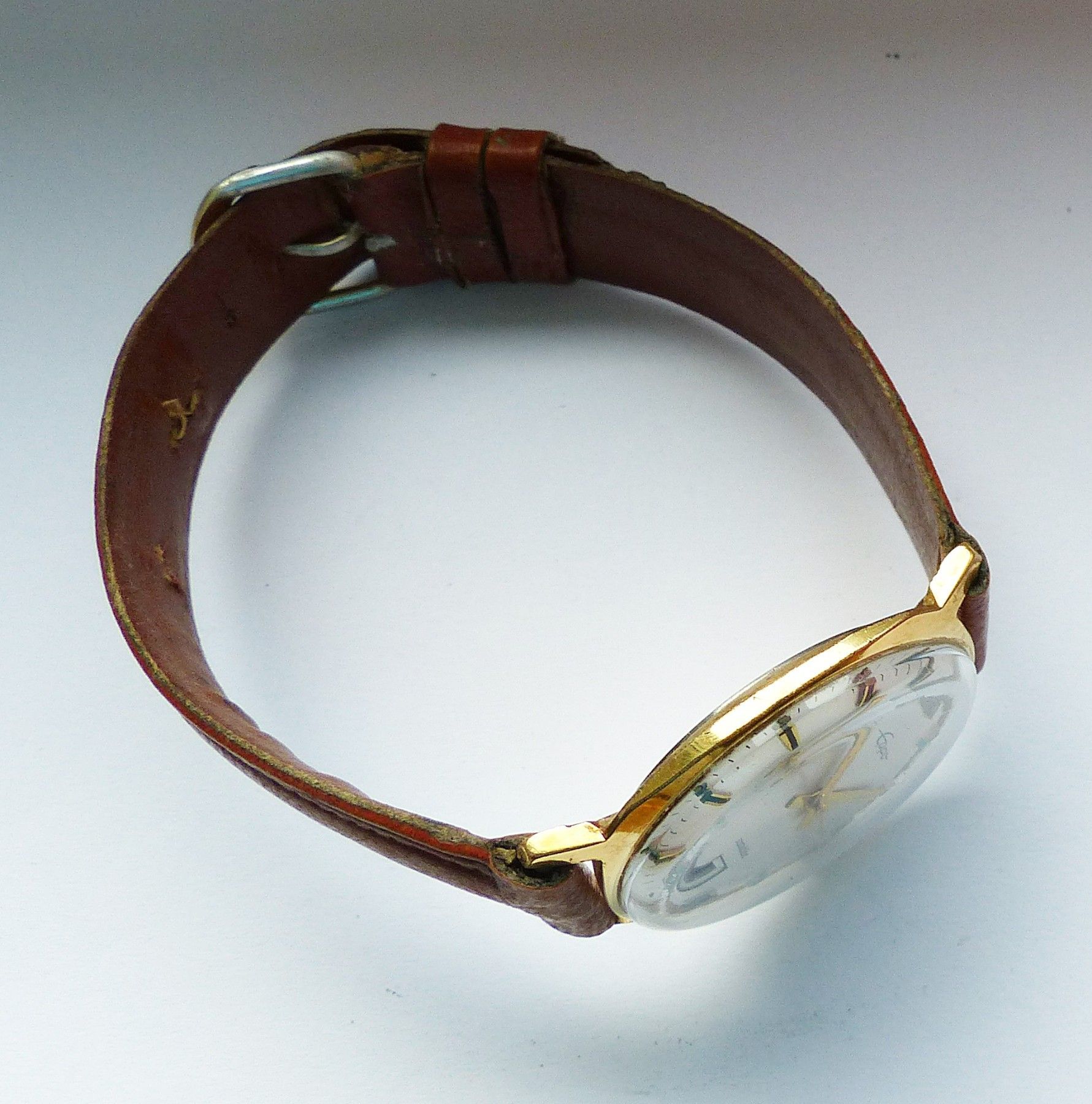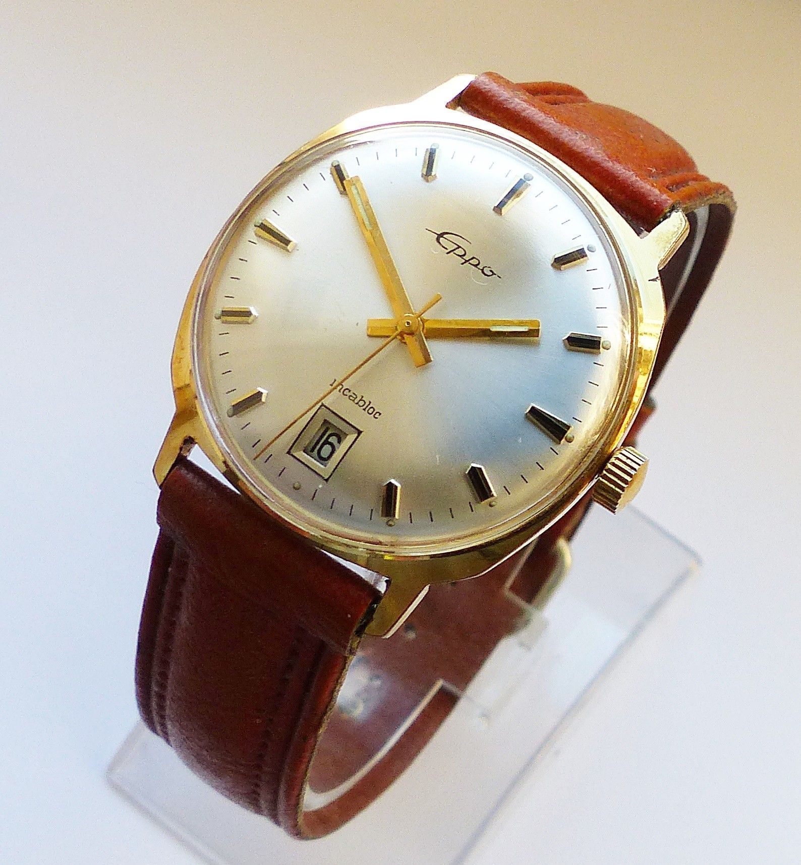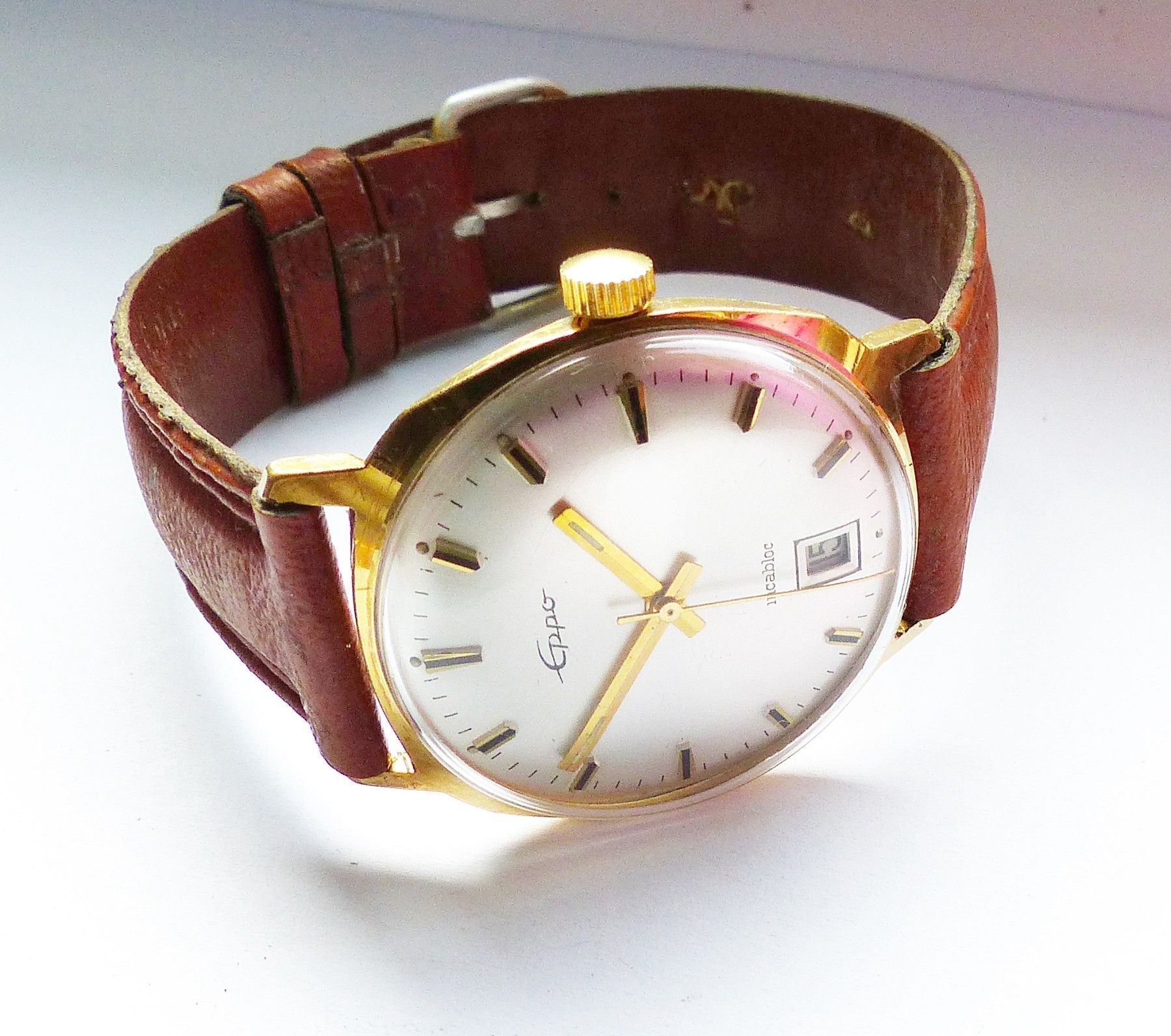 Schöne Eppo Classic Calendar Herren Vintage Armbanduhr mit Goldenem Zifferblatt im Sonnenschliff und aufgesetzten Gold-Schwarzen Strichindizes, grosser zentraler Sekunde, Datum bei 6.00 Uhr, fluoreszierenden Zeigern und Indexpunkten. Die Uhr ist voll funktionsfähig und in guten getragenen Zustand s.... Mehr