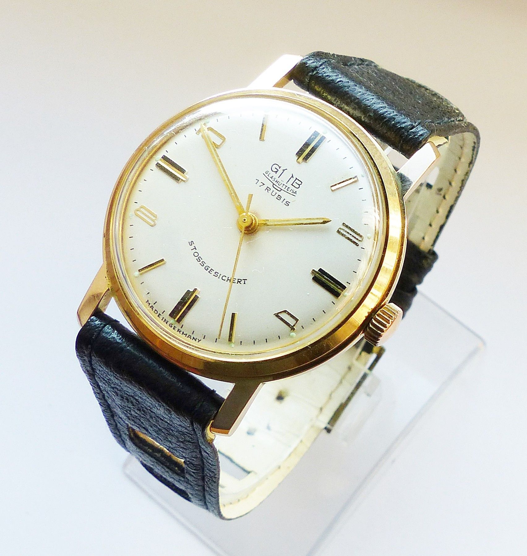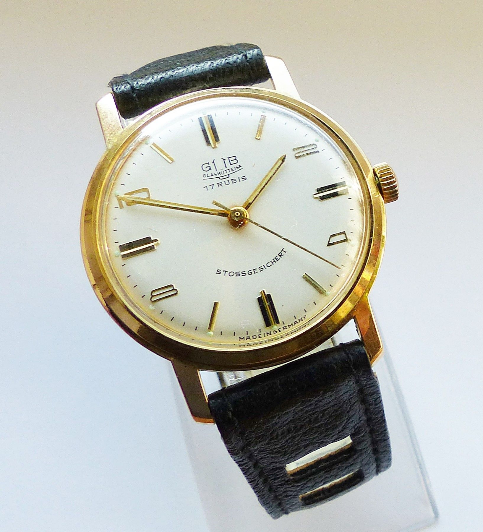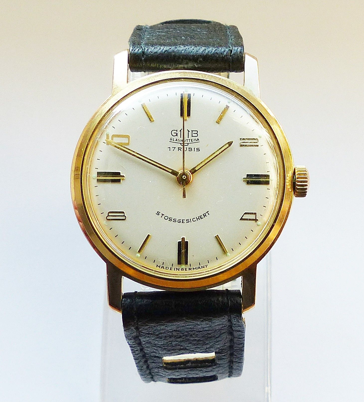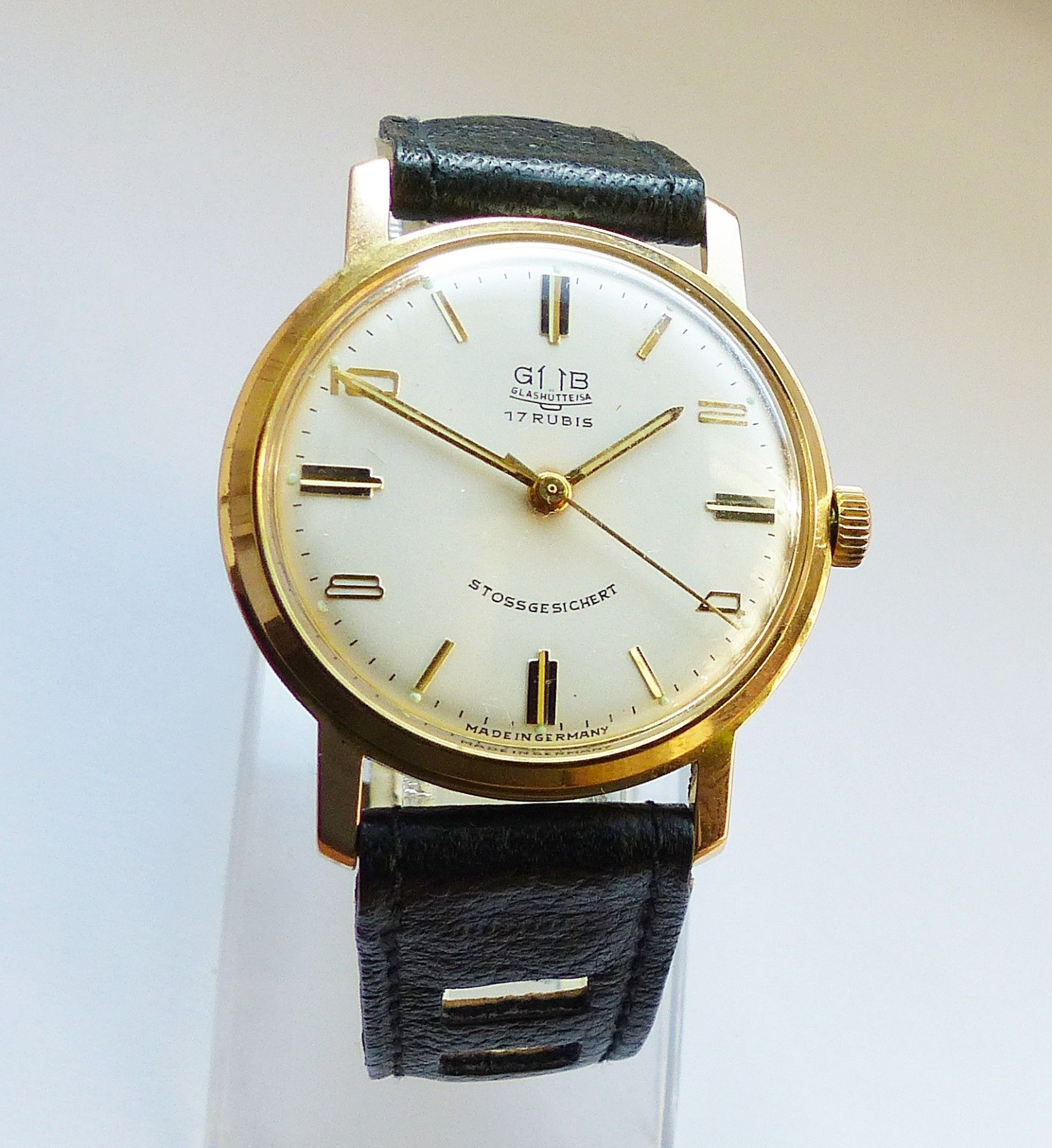 Schöne GUB Glashütte Classic Herren Vintage Armbanduhr mit Elfenbeinfarbenem Zifferblatt und aufgesetzten Goldenen Zahlen und Strichindizes, grosser zentraler Sekunde, fluoreszierenden Zeigern und Indexpunkten. Die Uhr ist voll funktionsfähig und in ungetragenem neuwertigen Zustand, s. Fotos Herstel... Mehr