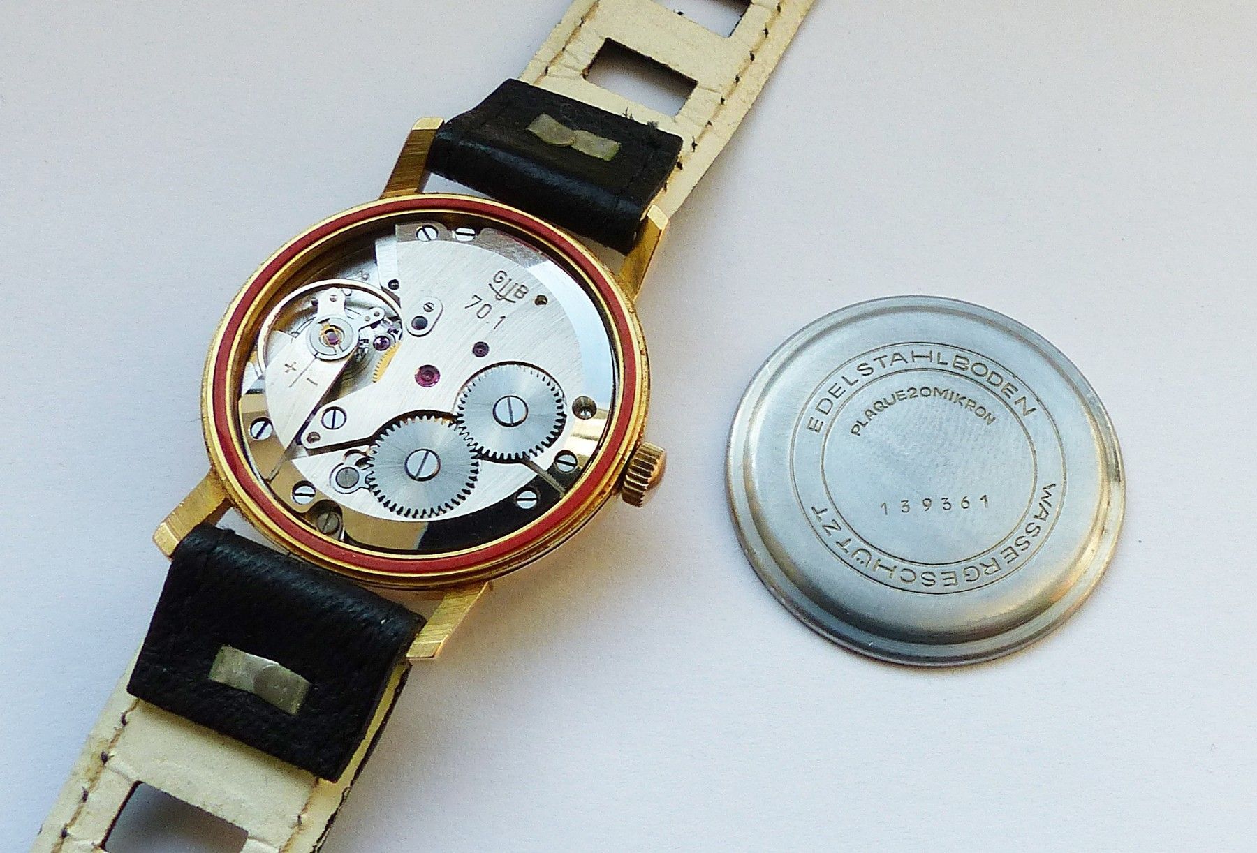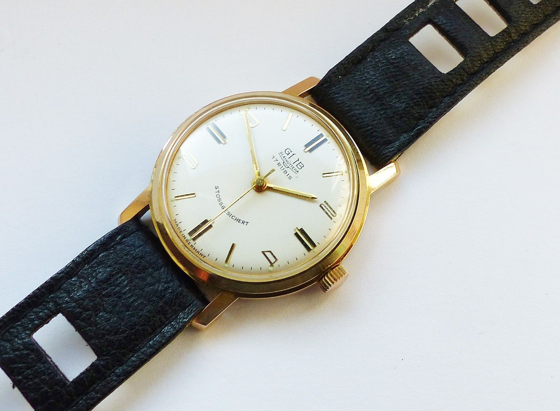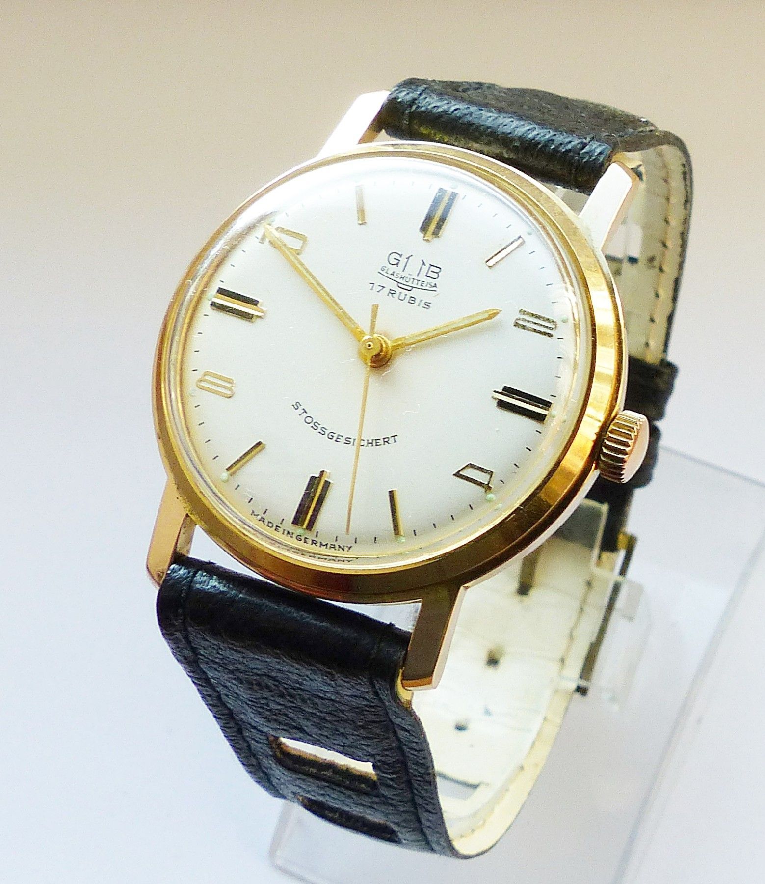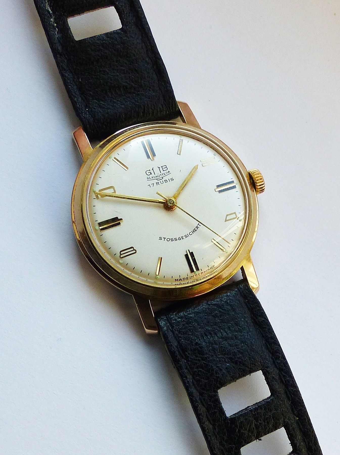 Schöne GUB Glashütte Classic Herren Vintage Armbanduhr mit Elfenbeinfarbenem Zifferblatt und aufgesetzten Goldenen Zahlen und Strichindizes, grosser zentraler Sekunde, fluoreszierenden Zeigern und Indexpunkten. Die Uhr ist voll funktionsfähig und in ungetragenem neuwertigen Zustand, s. Fotos Herstel... Mehr