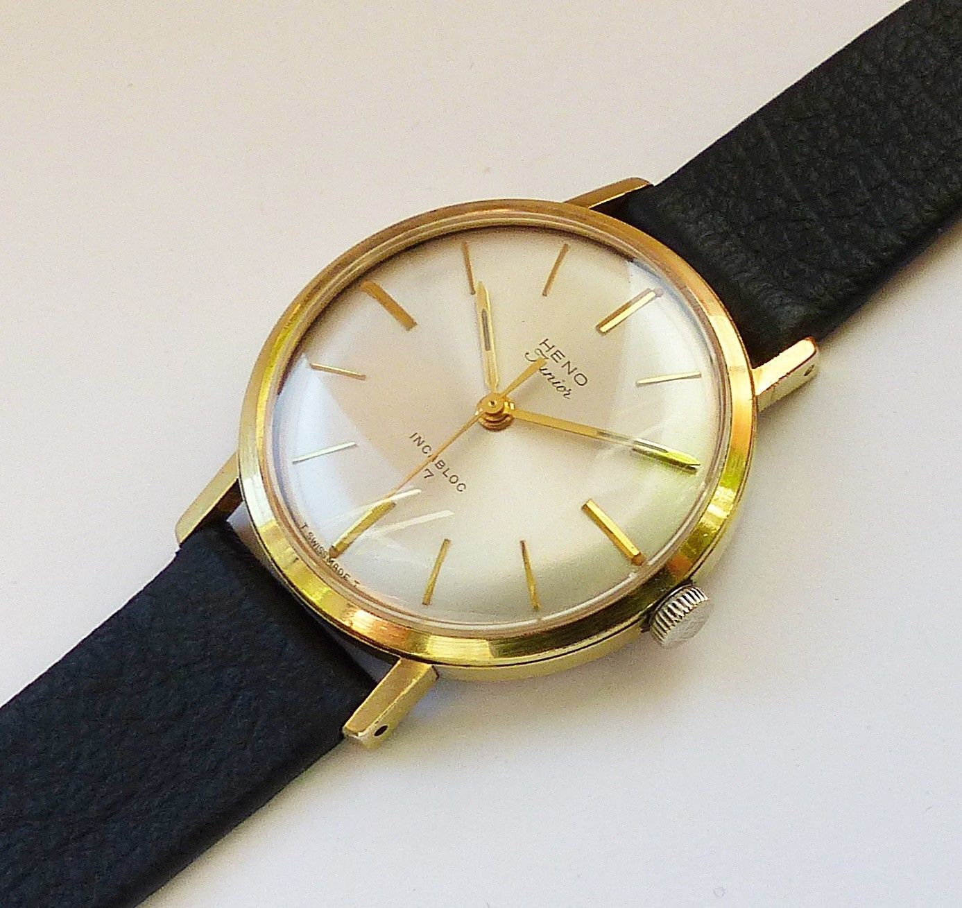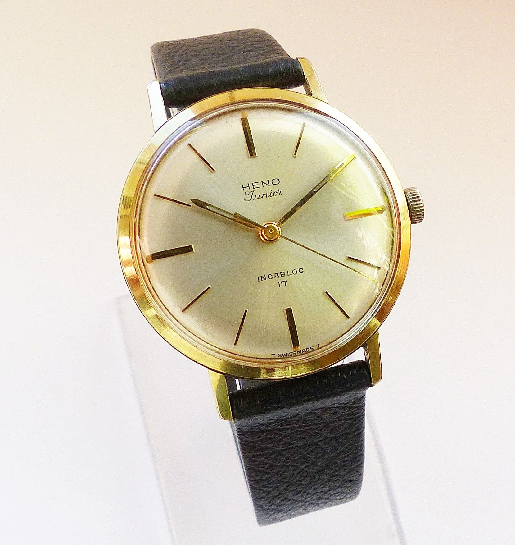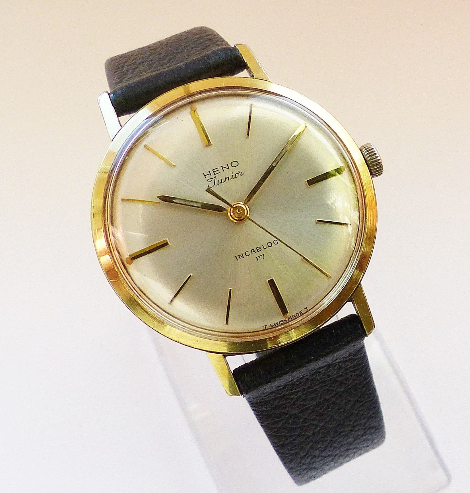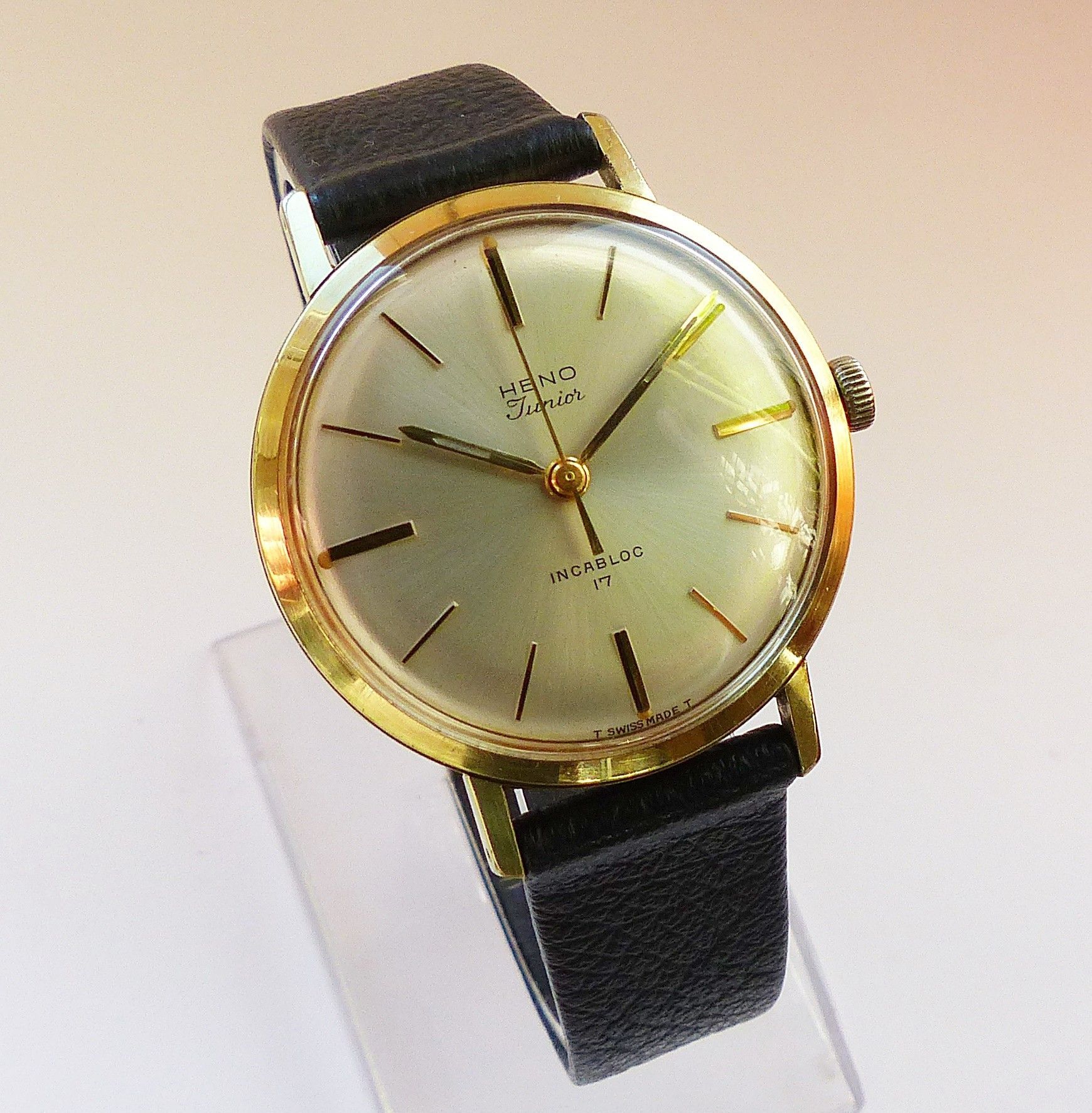 Schöne Heno watch Co. Schweiz Herren Vintage Armbanduhr mit Goldenem Zifferblatt im Sonnenschliff und aufgesetzten Goldenen Strichindizes, grosser zentraler Sekunde, fluoreszierenden Zeigern und Indexpunkten. Die Uhr ist voll funktionsfähig und in Top Zustand s. Fotos Hersteller : Heno Watch Co. Sch... Mehr