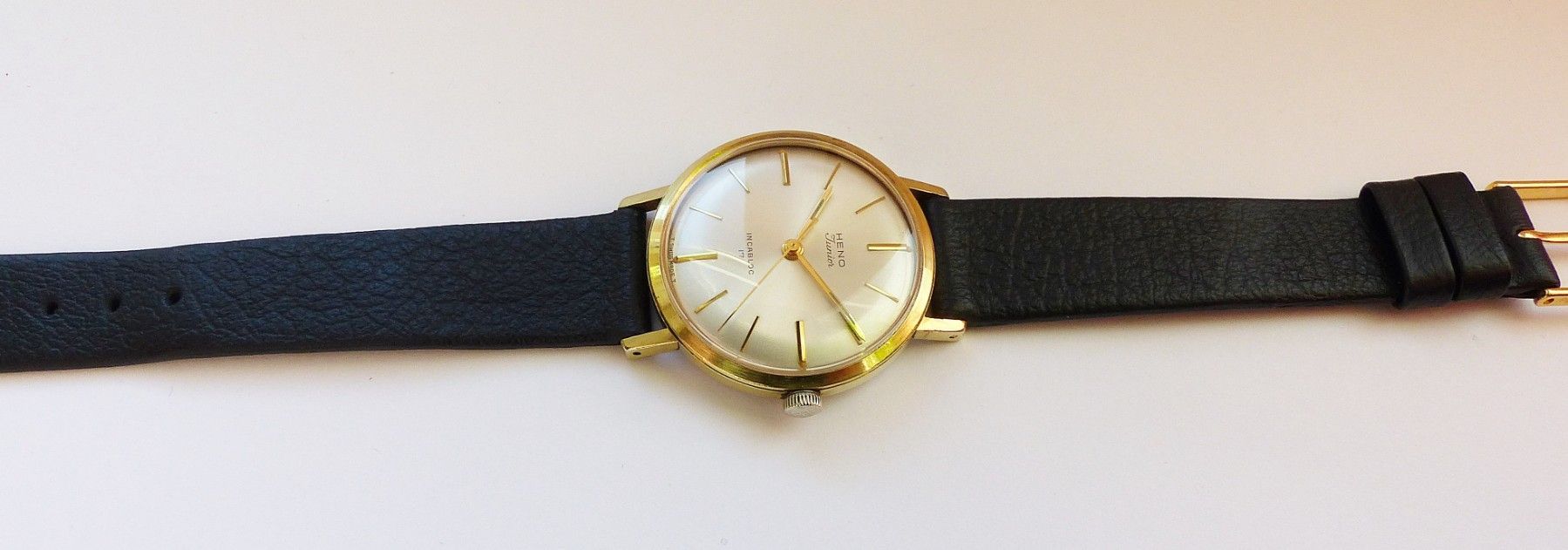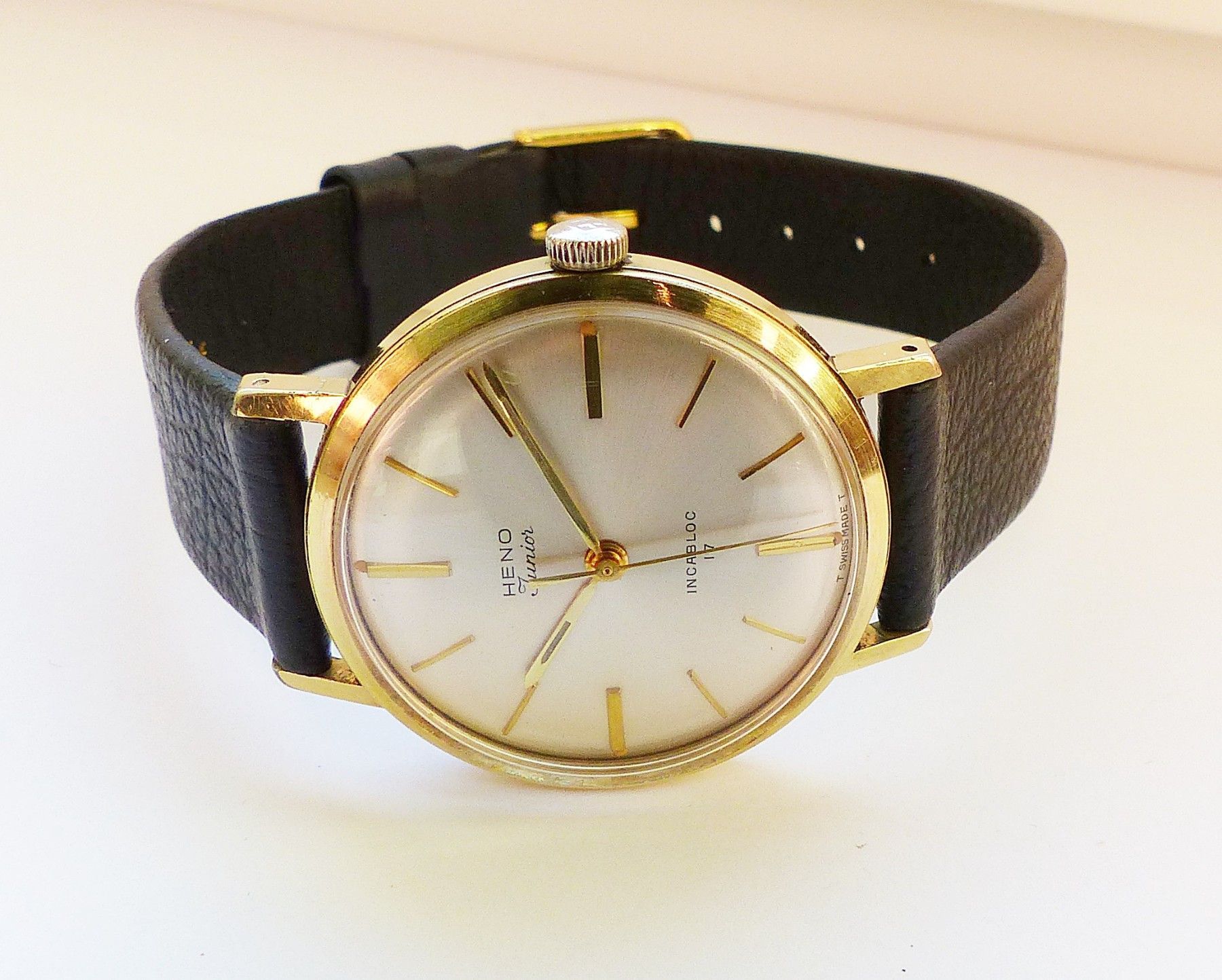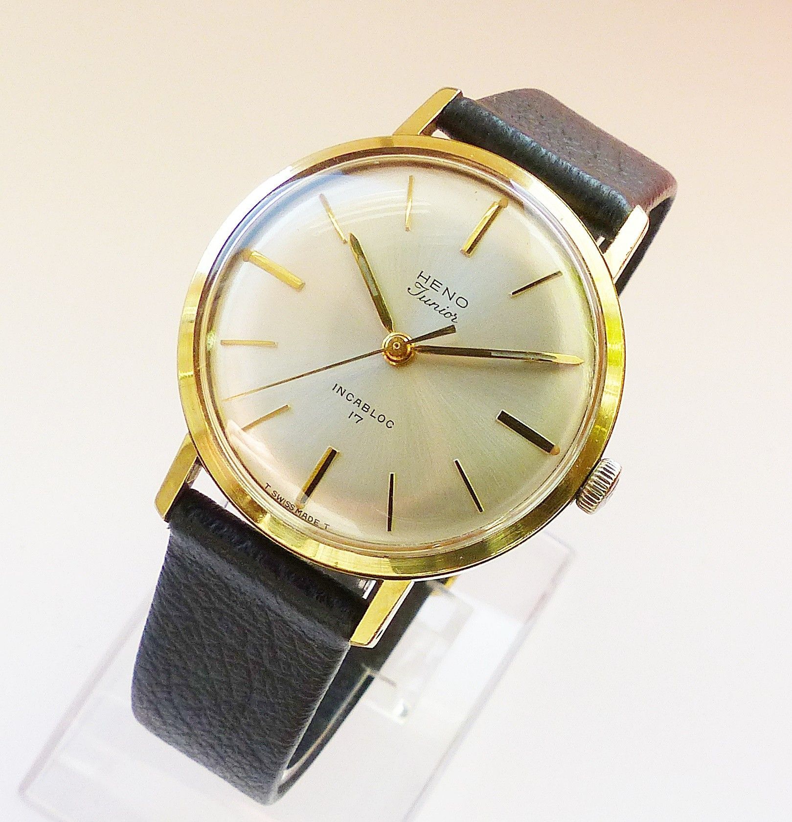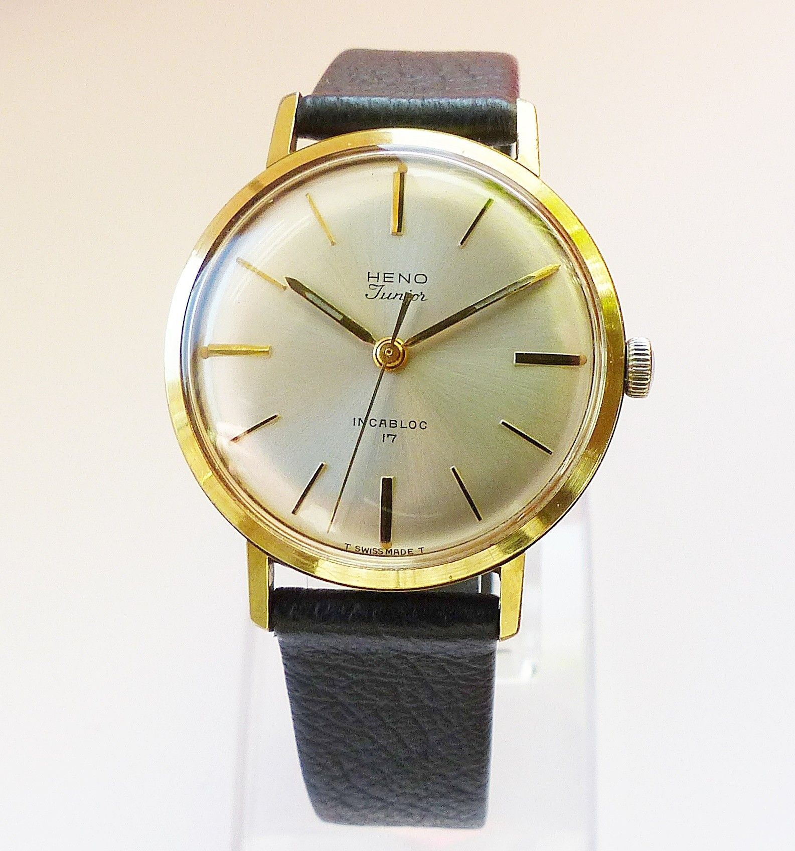 Schöne Heno watch Co. Schweiz Herren Vintage Armbanduhr mit Goldenem Zifferblatt im Sonnenschliff und aufgesetzten Goldenen Strichindizes, grosser zentraler Sekunde, fluoreszierenden Zeigern und Indexpunkten. Die Uhr ist voll funktionsfähig und in Top Zustand s. Fotos Hersteller : Heno Watch Co. Sch... Mehr