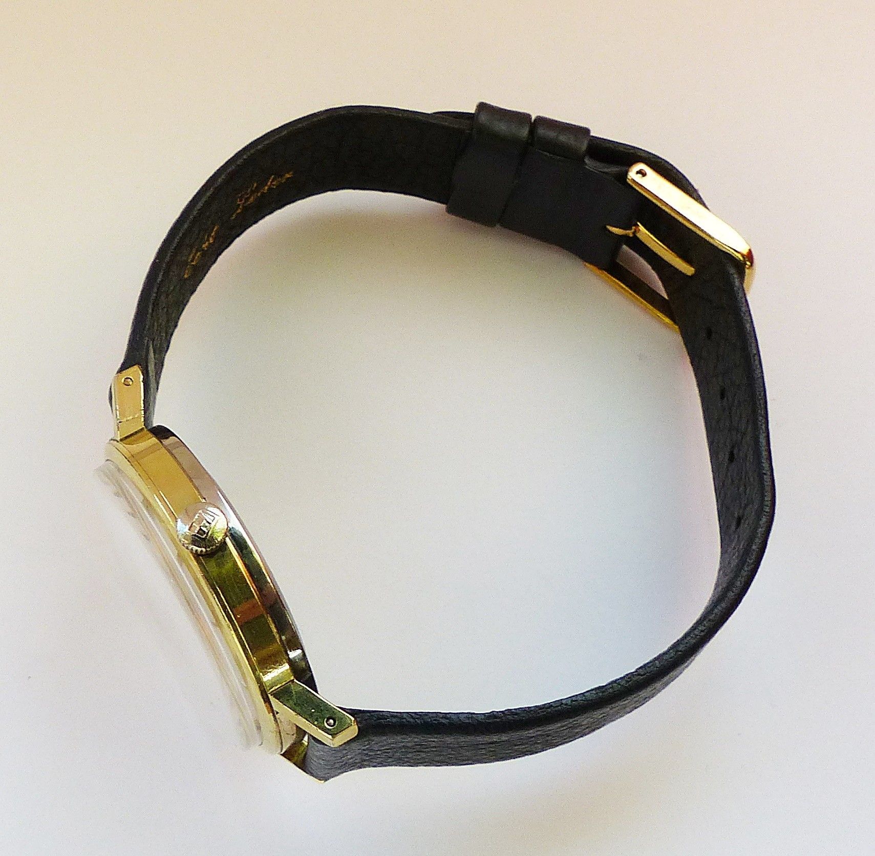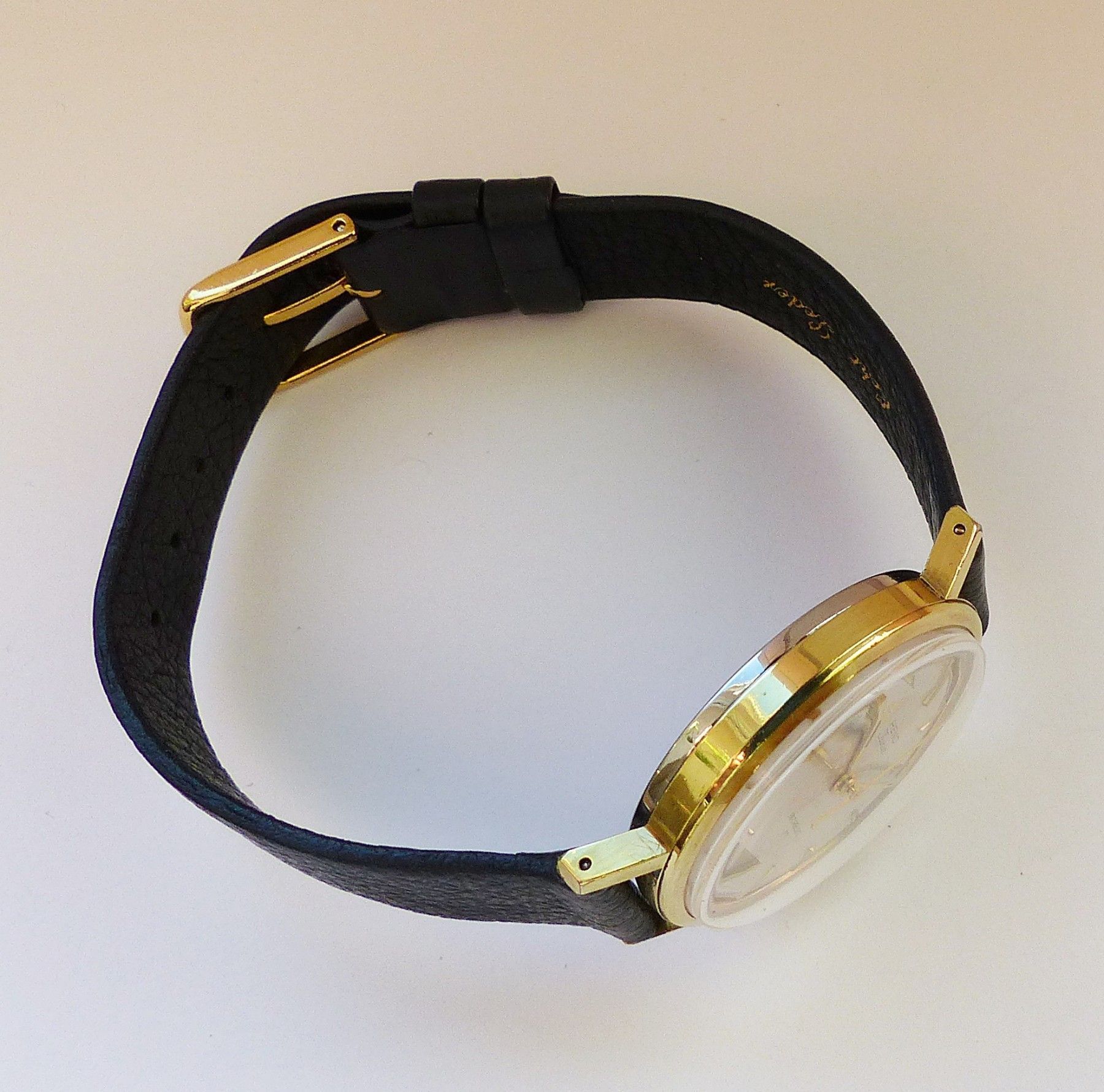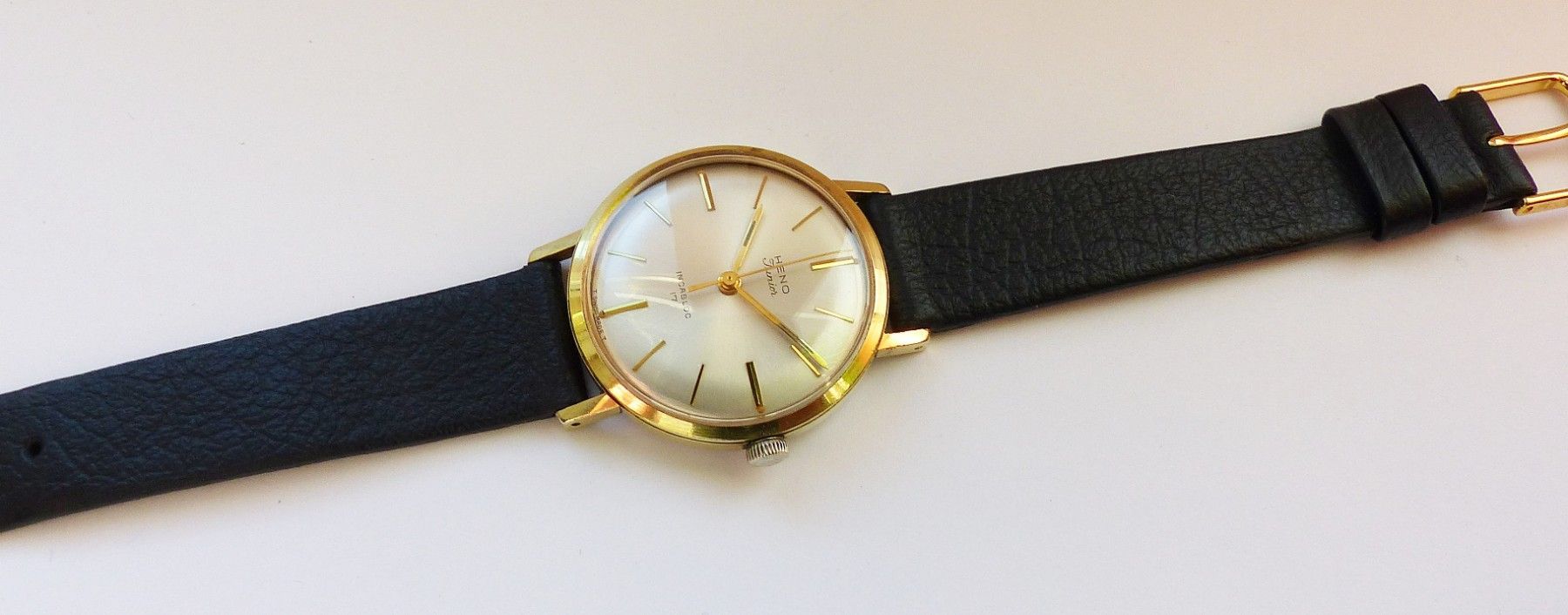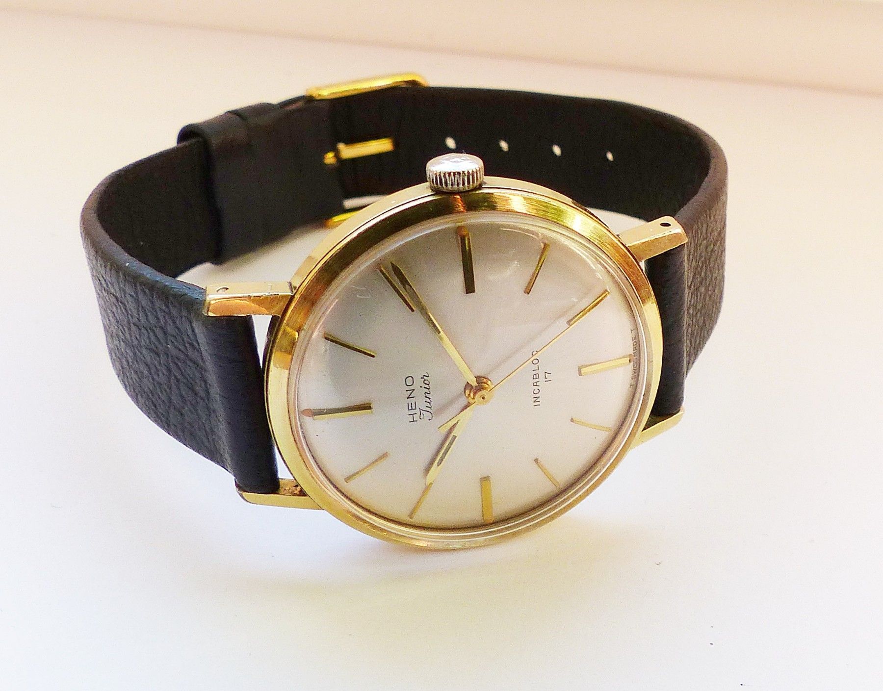 Schöne Heno watch Co. Schweiz Herren Vintage Armbanduhr mit Goldenem Zifferblatt im Sonnenschliff und aufgesetzten Goldenen Strichindizes, grosser zentraler Sekunde, fluoreszierenden Zeigern und Indexpunkten. Die Uhr ist voll funktionsfähig und in Top Zustand s. Fotos Hersteller : Heno Watch Co. Sch... Mehr