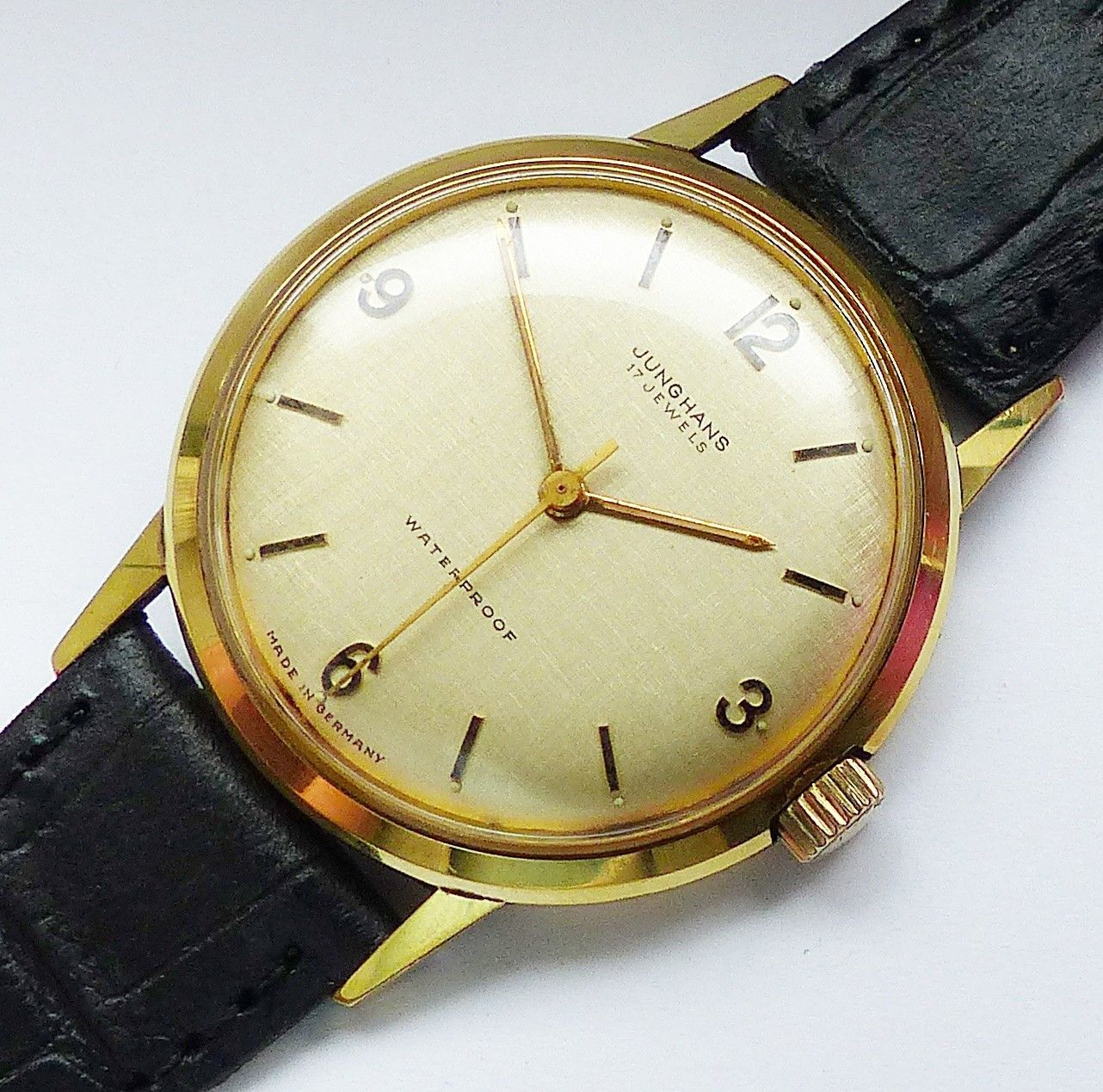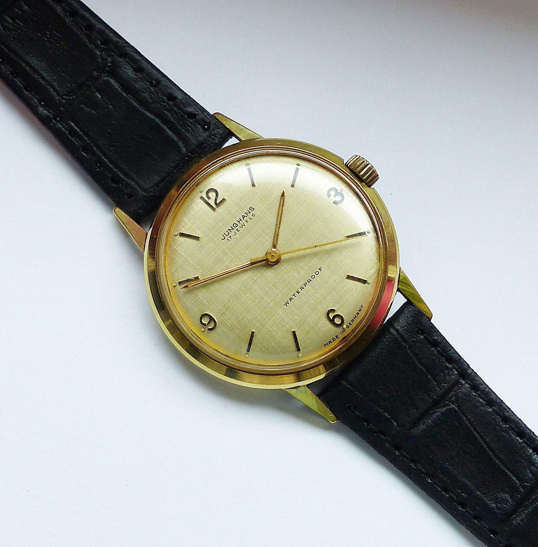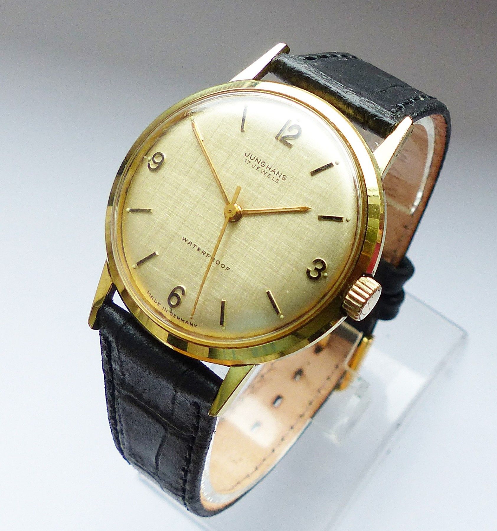 Schöne Junghans Classic Herren Vintage Armbanduhr mit Goldenem Zifferblatt und aufgesetzten Goldenen Zahlen und Strichindizes, grosser zentraler Sekunde, fluoreszierenden Zeigern und Indexpunkten. Die Uhr ist voll funktionsfähig und in Top Zustand s. Fotos Hersteller : Junghans Deutschland Modell Cl... Mehr