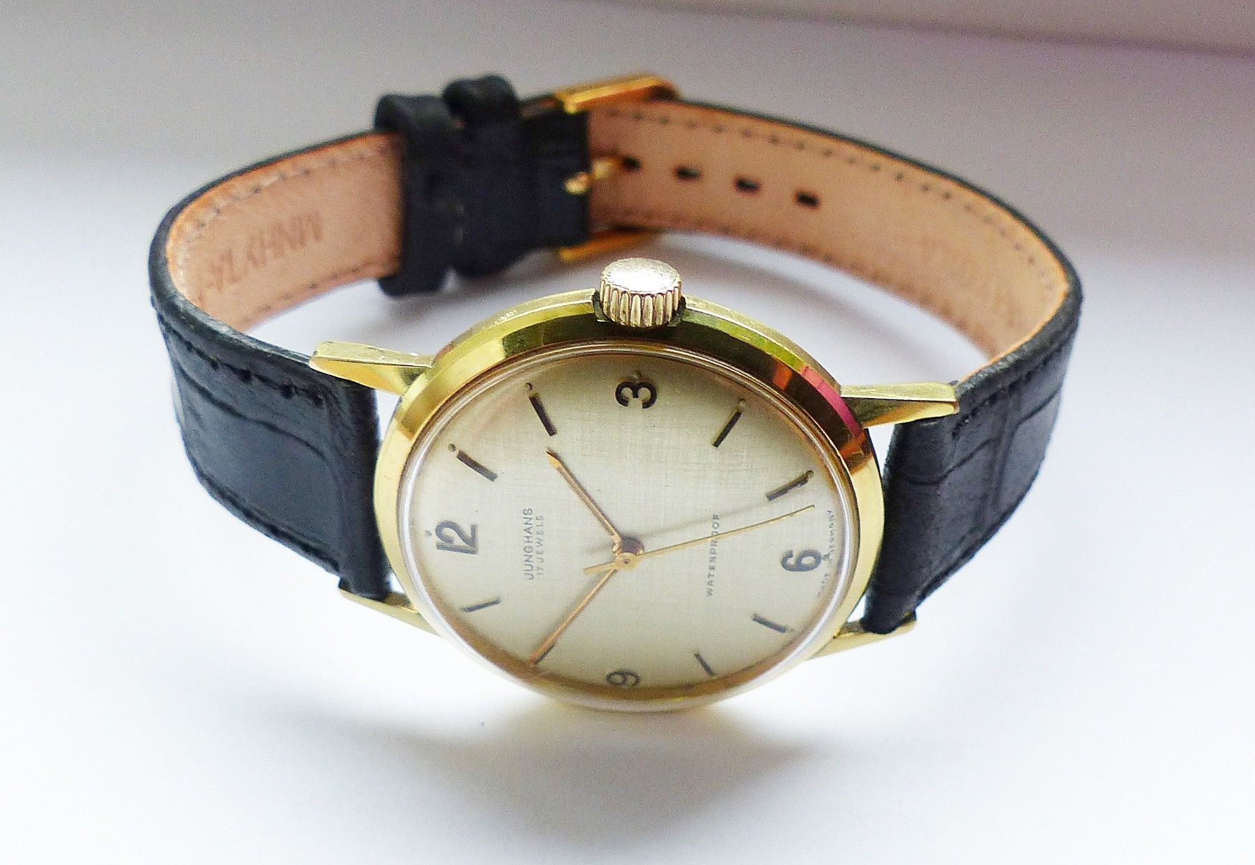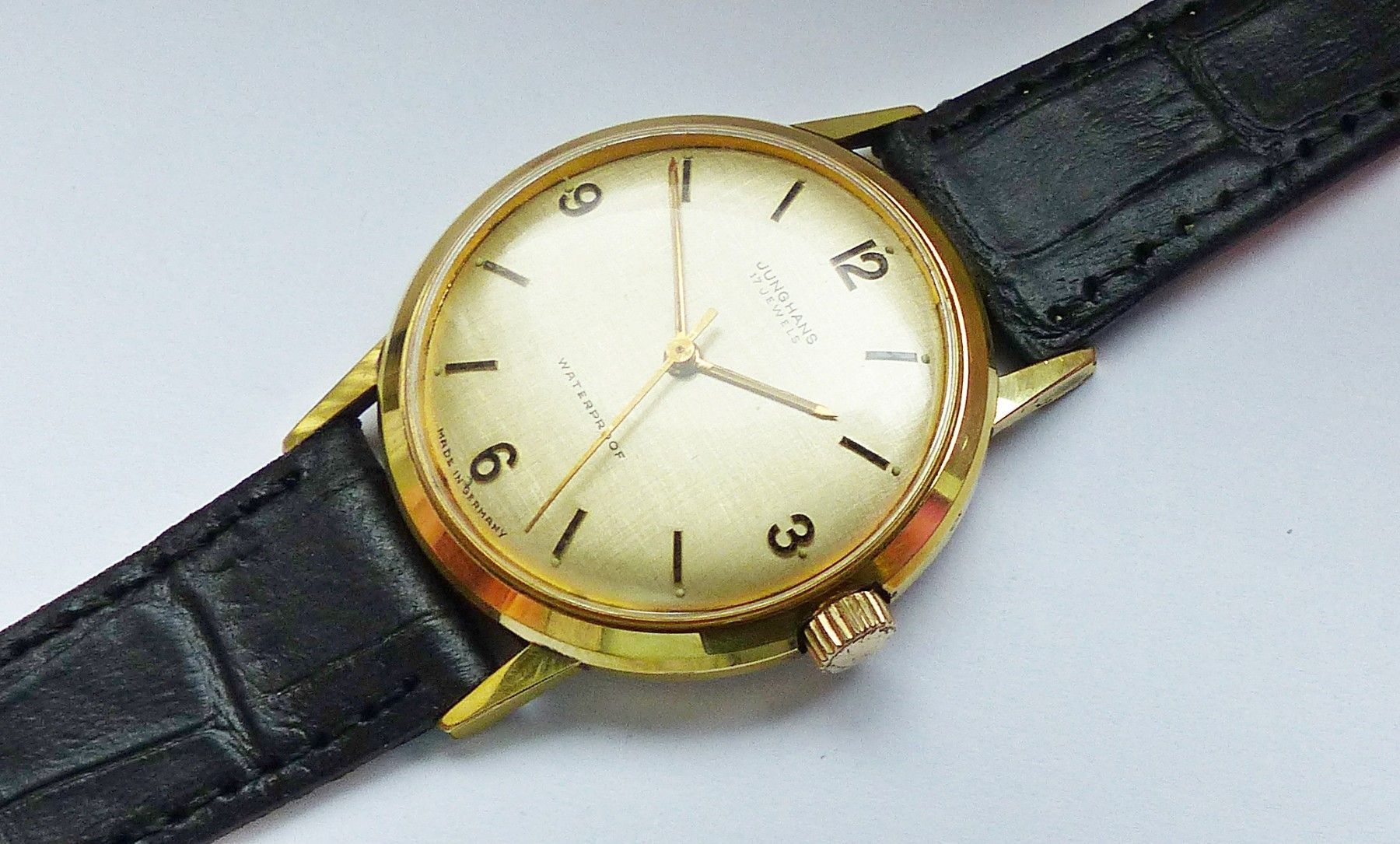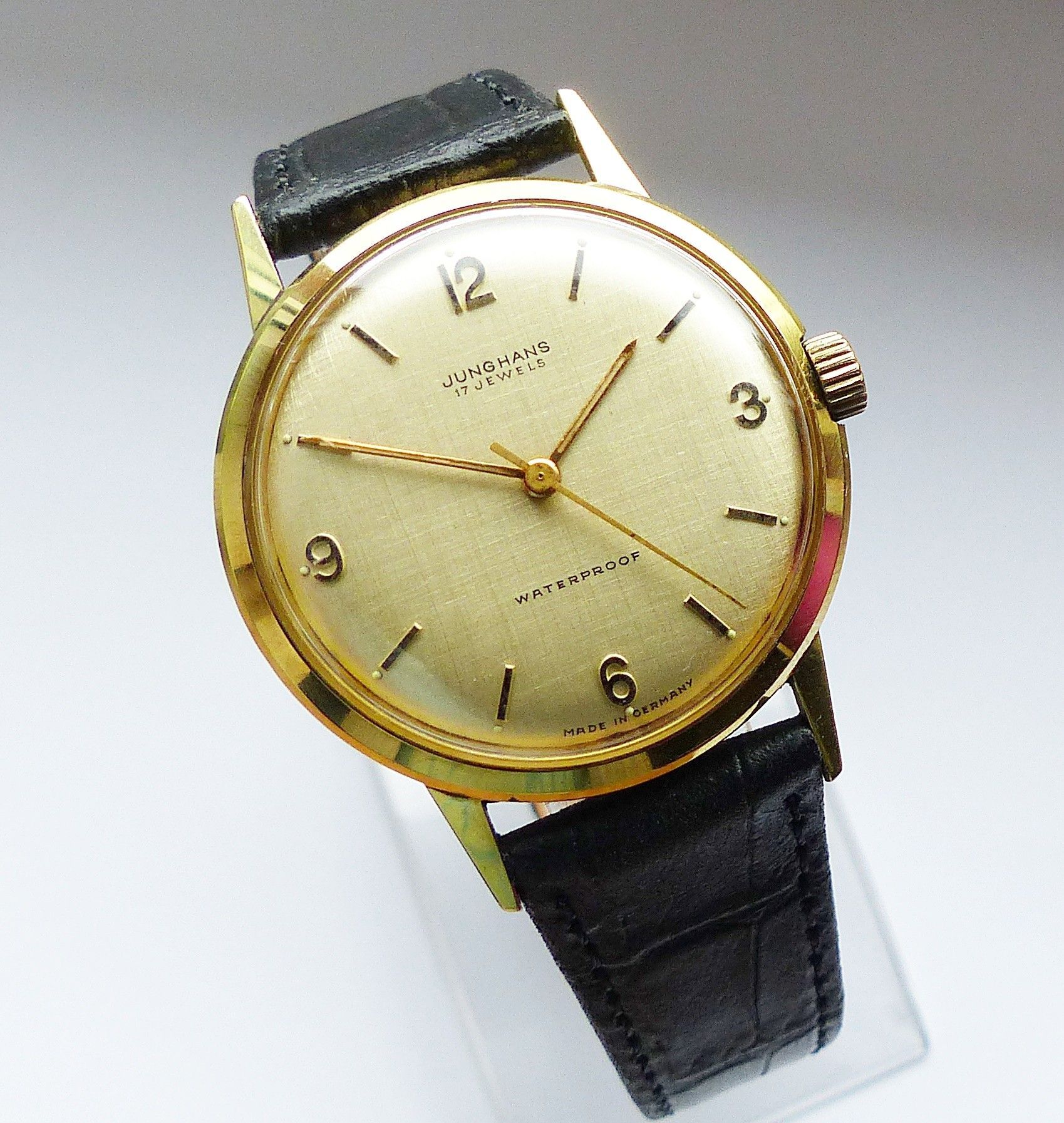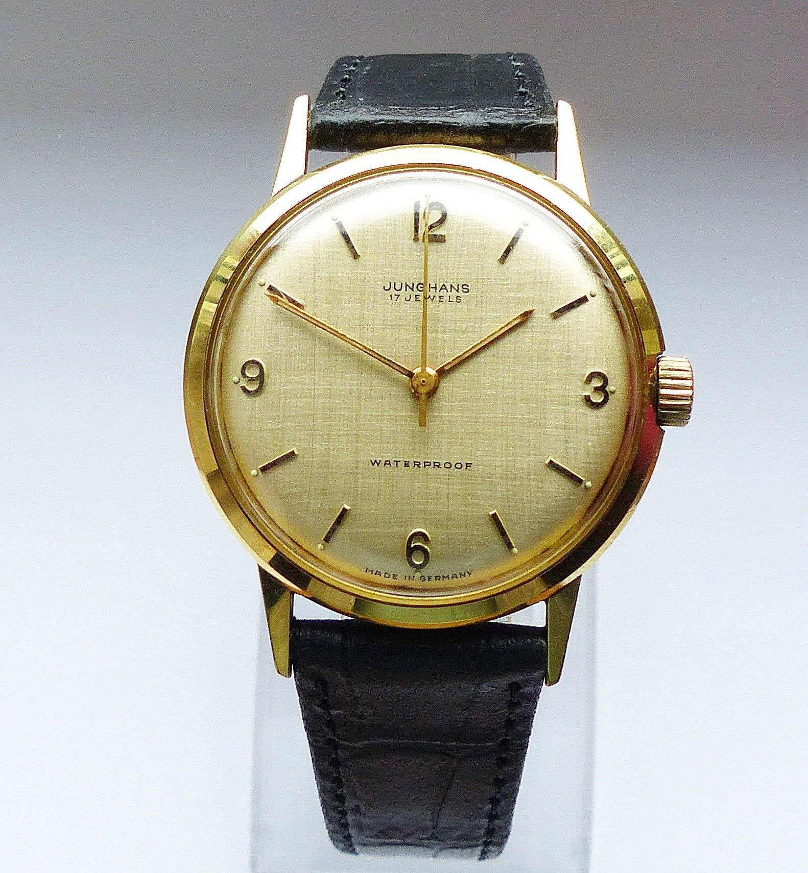 Schöne Junghans Classic Herren Vintage Armbanduhr mit Goldenem Zifferblatt und aufgesetzten Goldenen Zahlen und Strichindizes, grosser zentraler Sekunde, fluoreszierenden Zeigern und Indexpunkten. Die Uhr ist voll funktionsfähig und in Top Zustand s. Fotos Hersteller : Junghans Deutschland Modell Cl... Mehr
