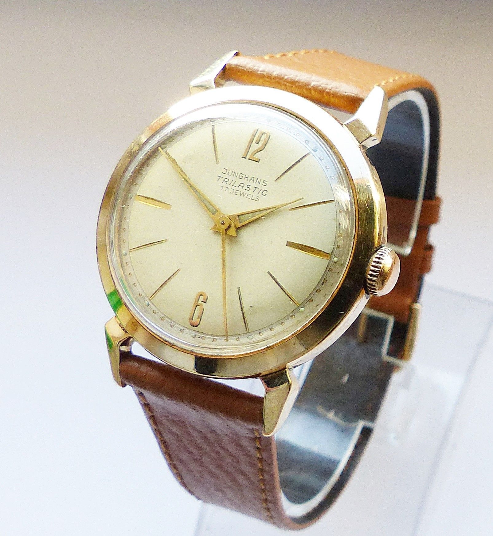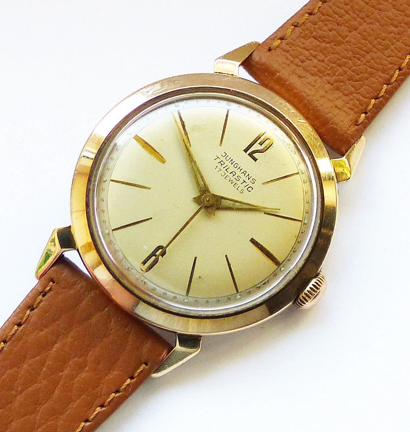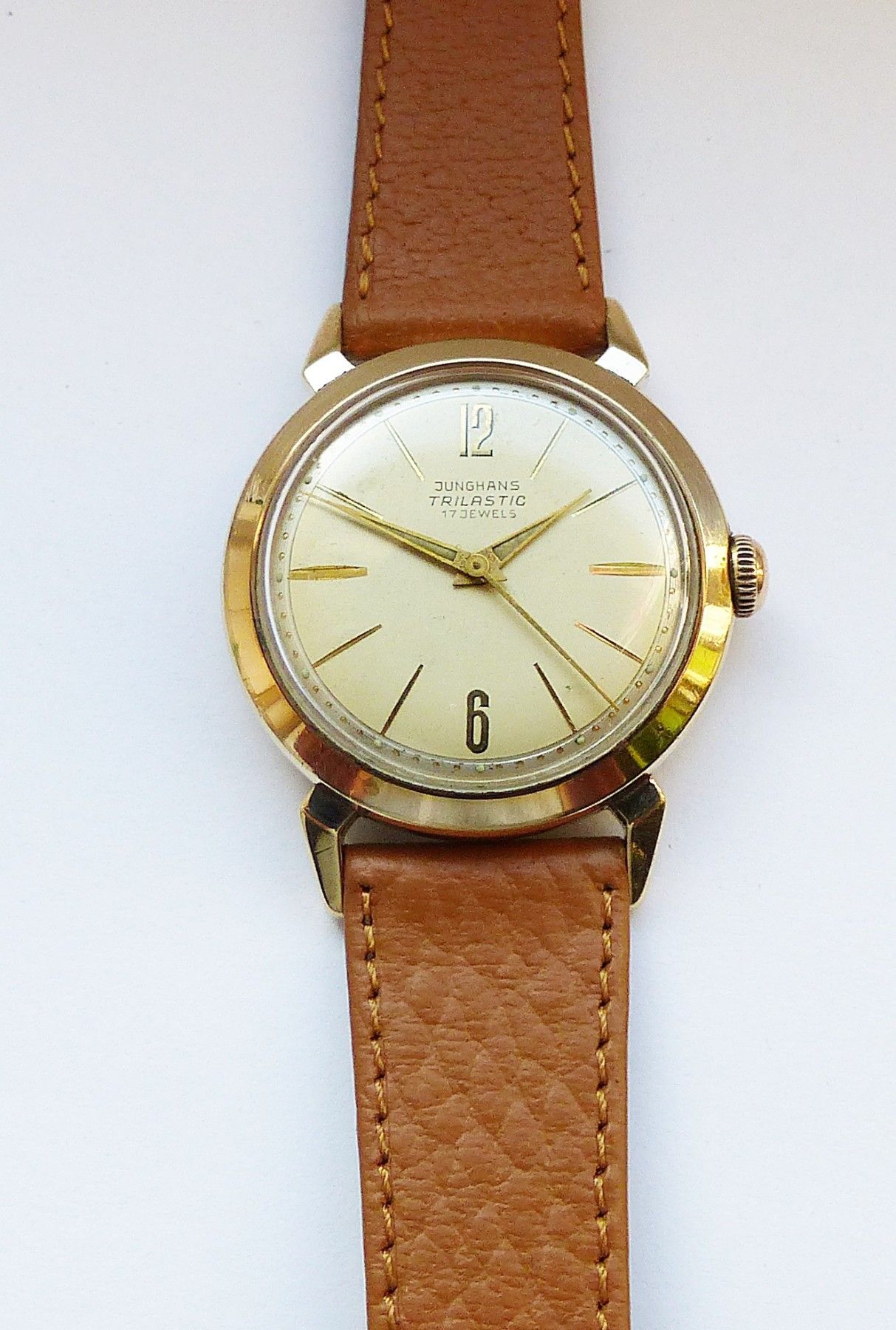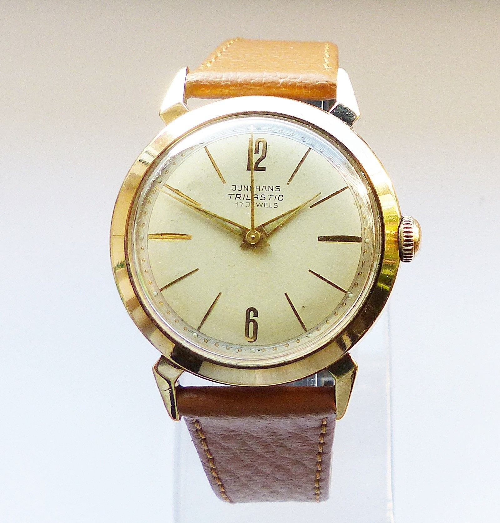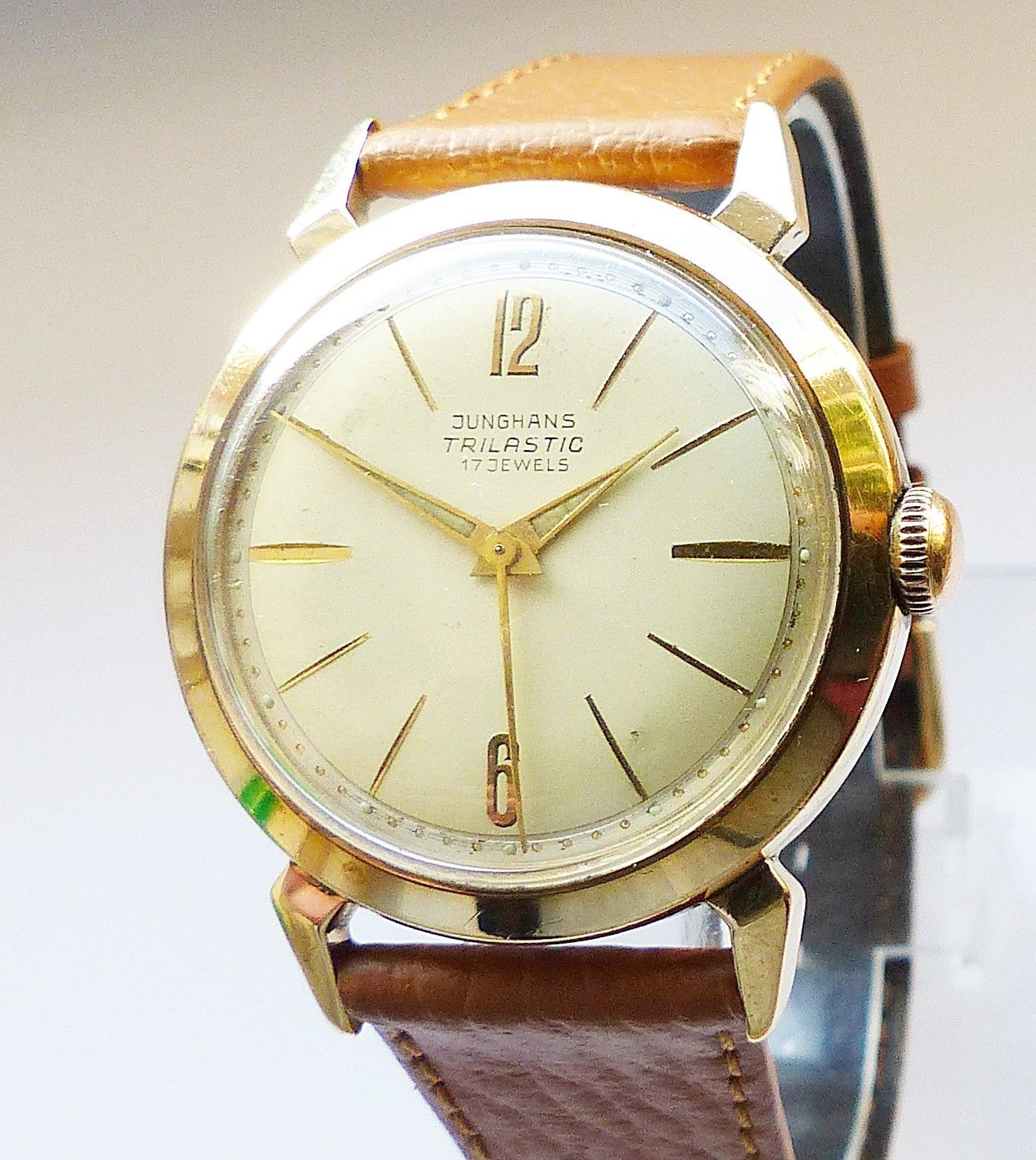 Schöne seltene Junghans Classic Trilastic Herren Vintage Armbanduhr mit Goldenem Zifferblatt und aufgesetzten Zahlen und Strichindizes, grosser zentraler Sekunde, fluoreszierenden Zeigern und Indexpunkten. Die Uhr ist voll funktionsfähig und in sehr guten Zustand s. Fotos Hersteller : Junghans Deuts... Mehr