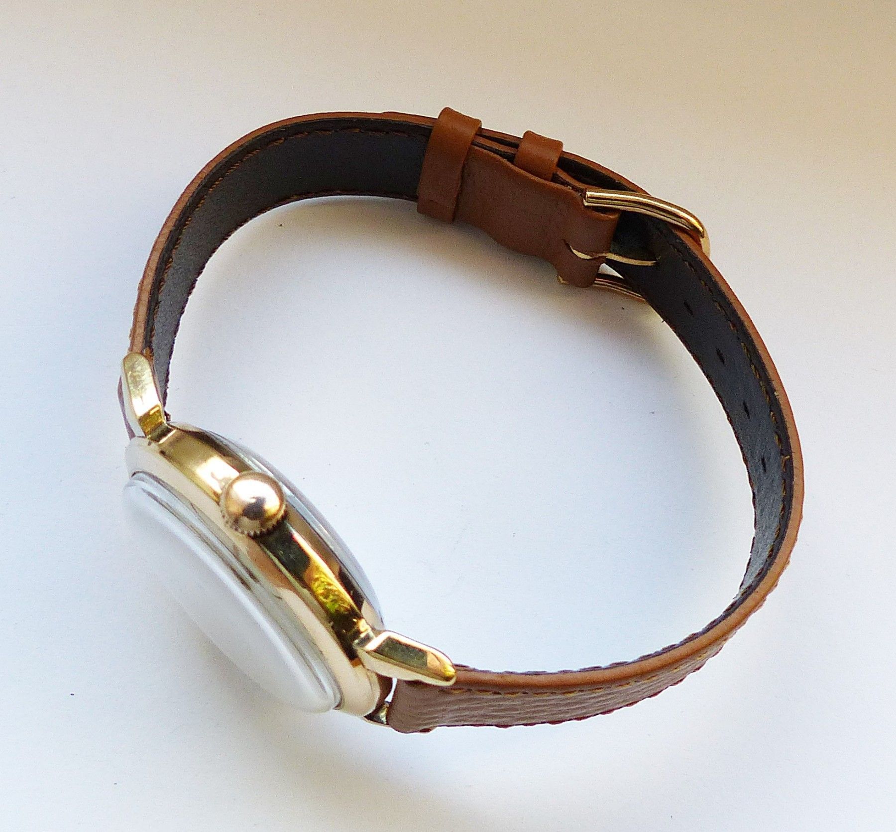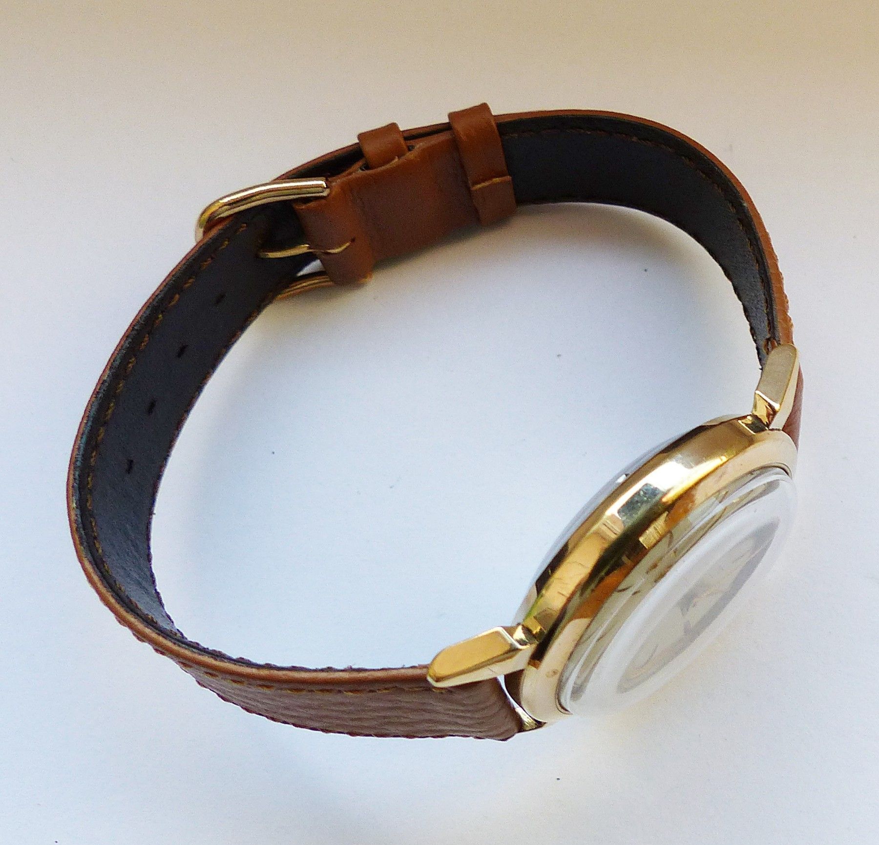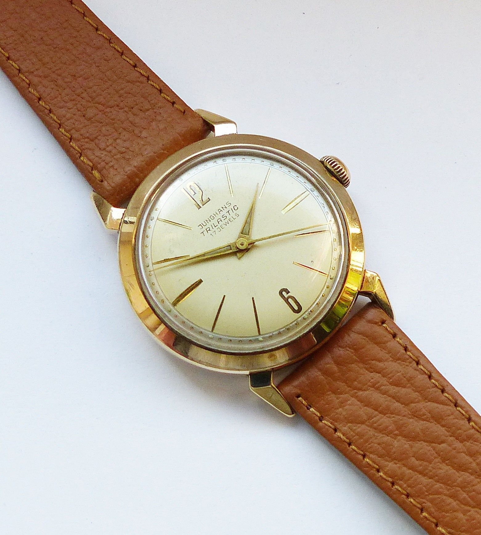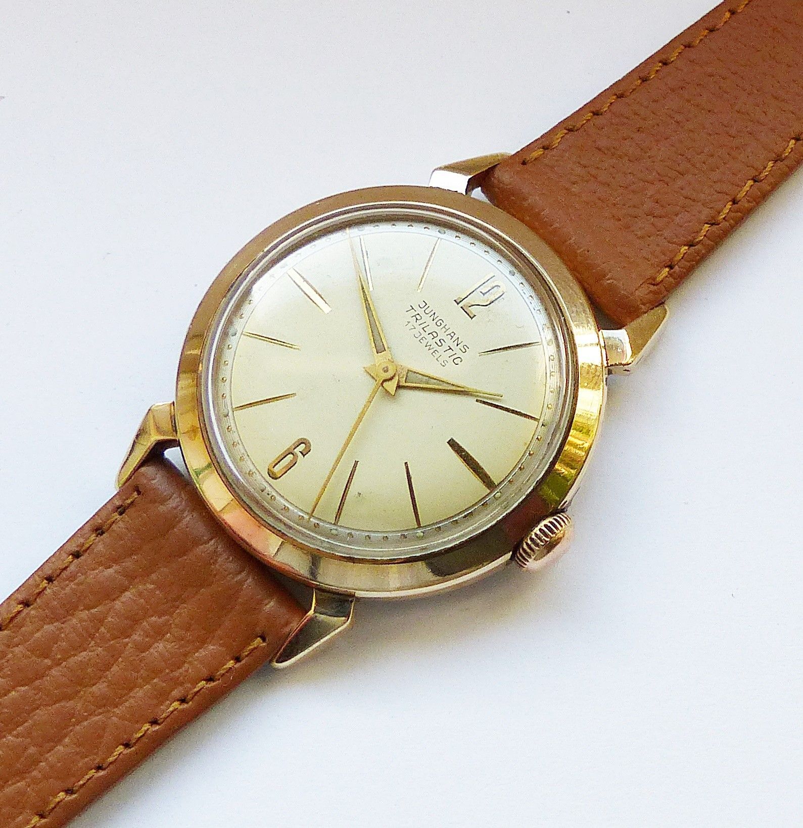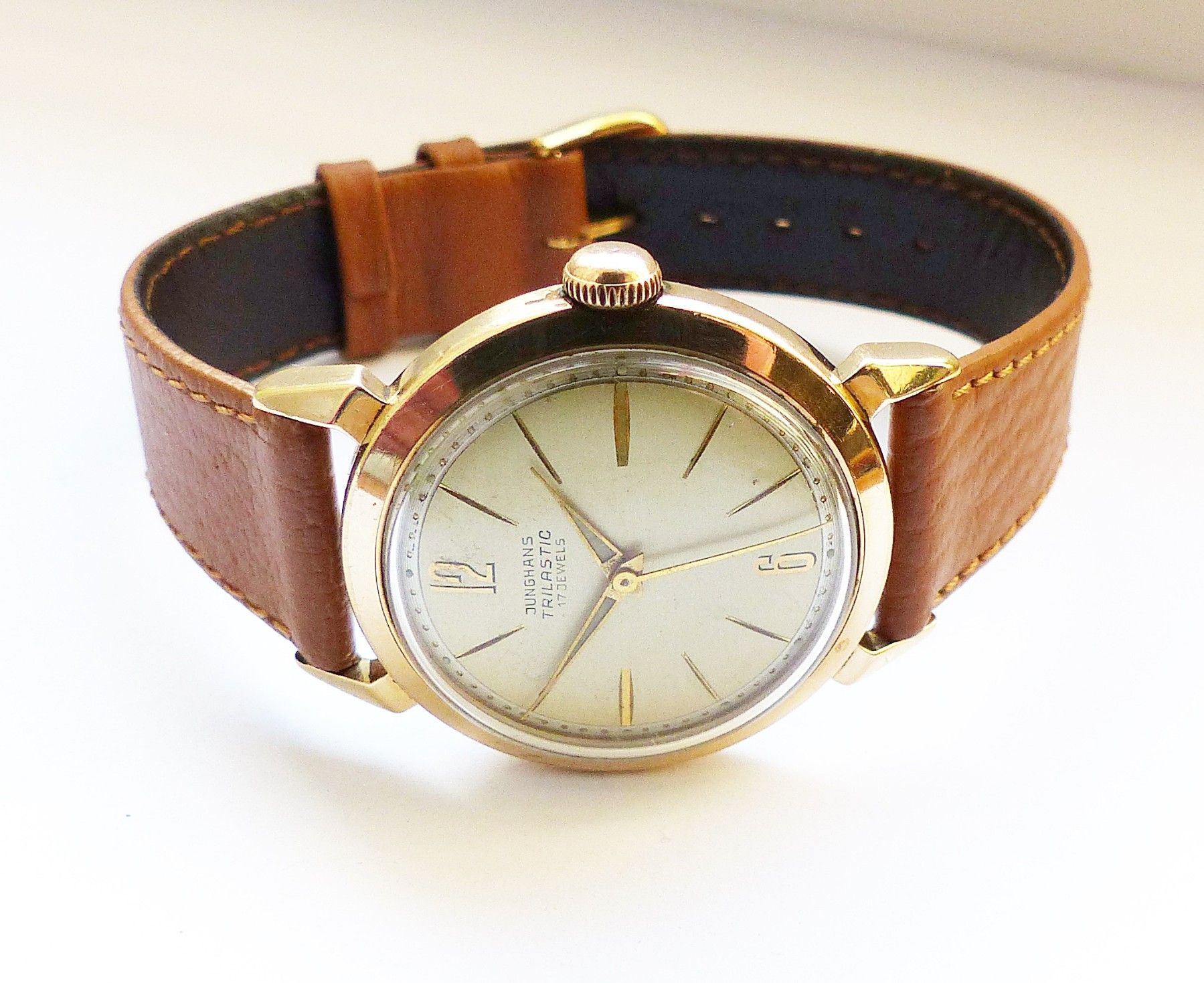 Schöne seltene Junghans Classic Trilastic Herren Vintage Armbanduhr mit Goldenem Zifferblatt und aufgesetzten Zahlen und Strichindizes, grosser zentraler Sekunde, fluoreszierenden Zeigern und Indexpunkten. Die Uhr ist voll funktionsfähig und in sehr guten Zustand s. Fotos Hersteller : Junghans Deuts... Mehr