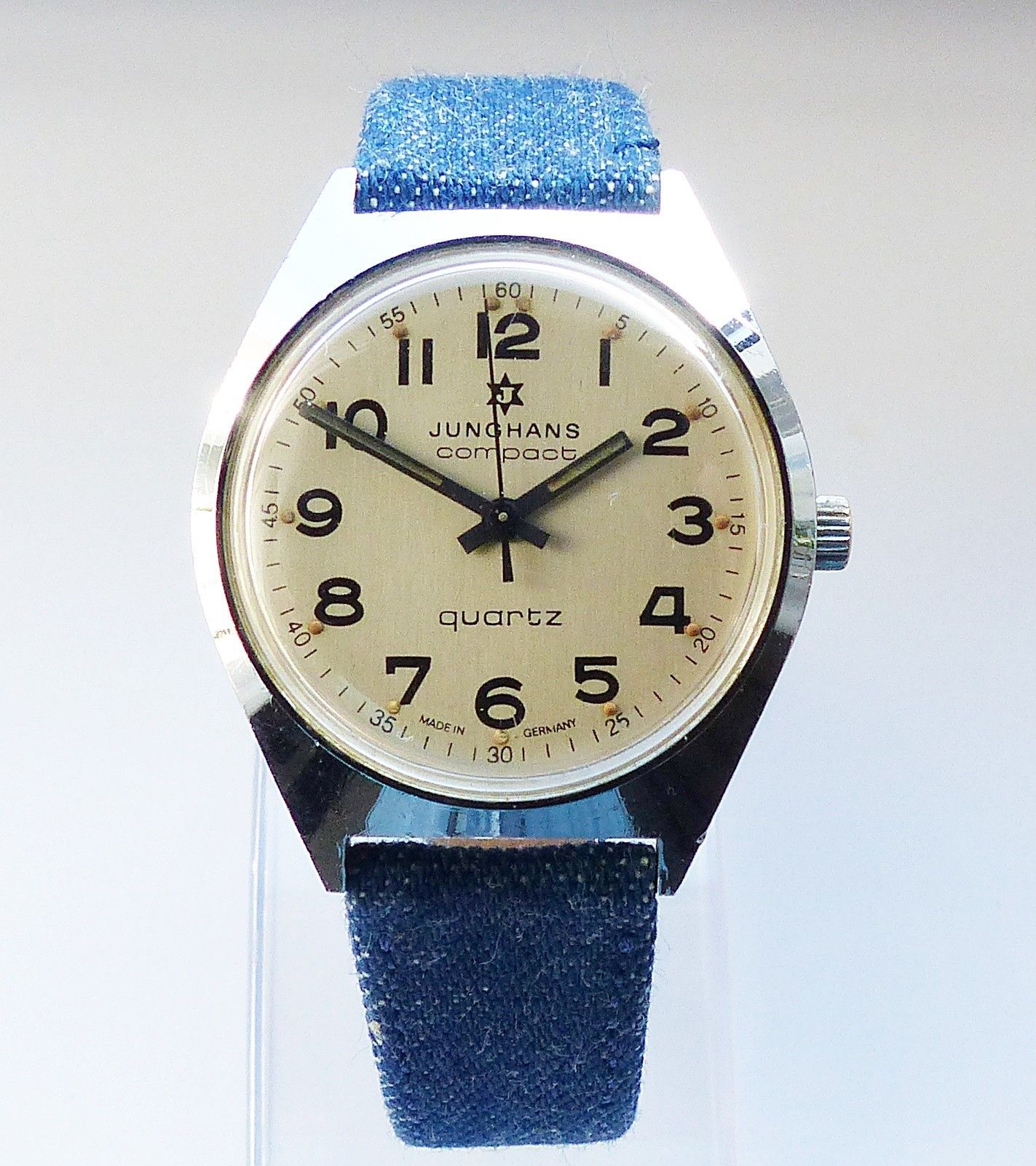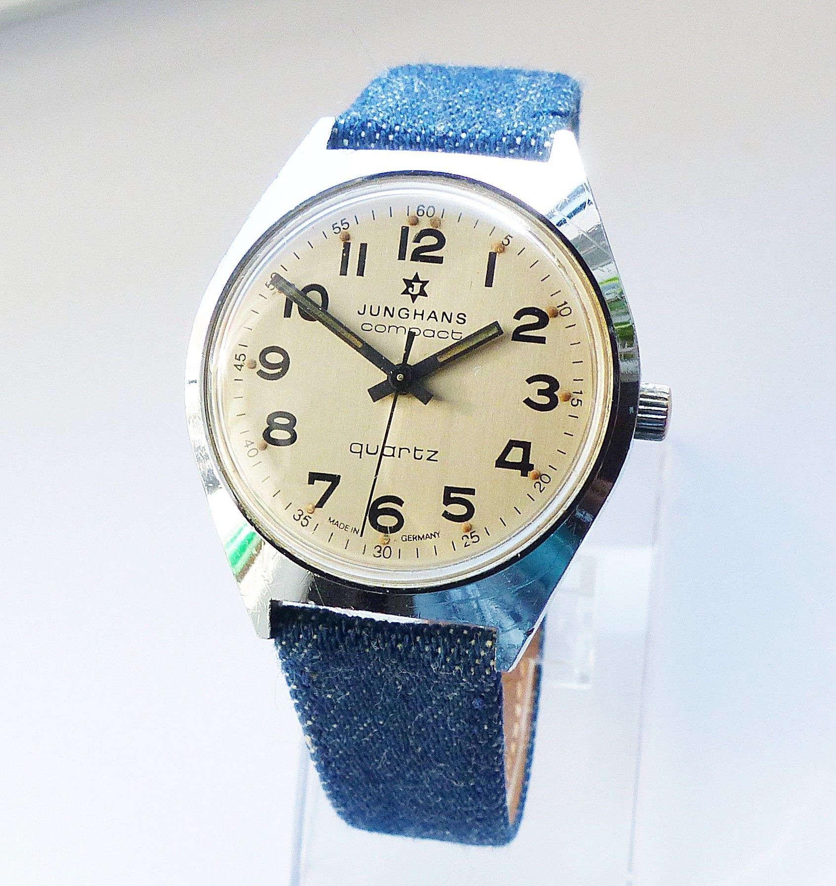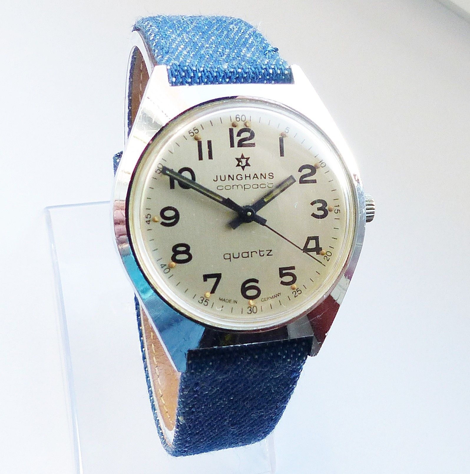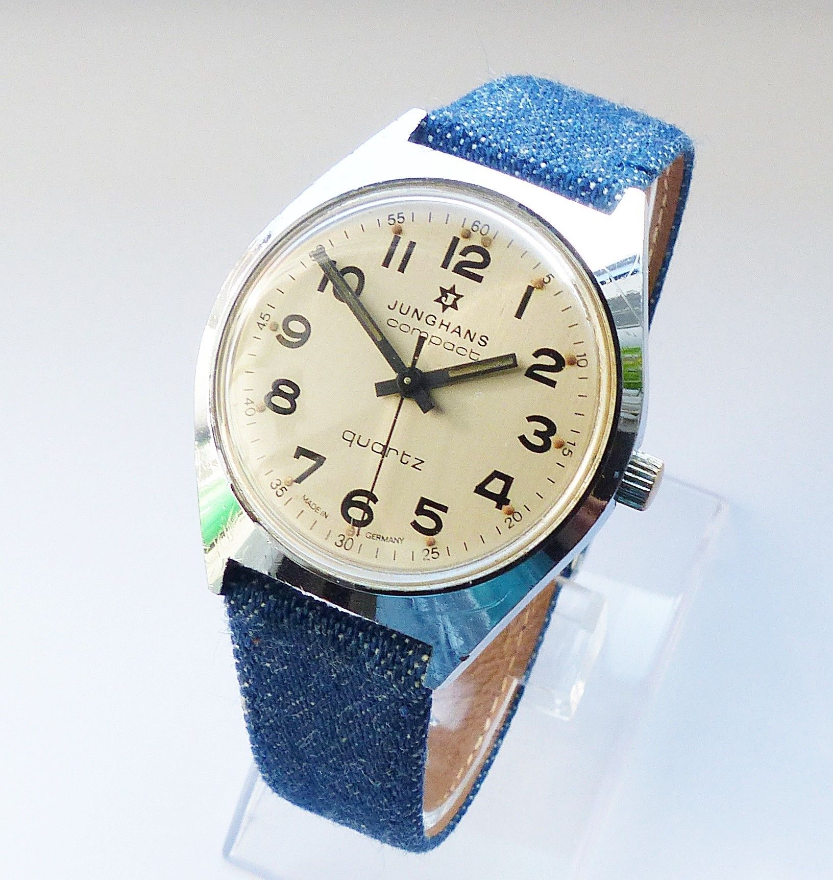 Schöne Junghans Compact Classic Herren Vintage Armbanduhr mit Silbernem Zifferblatt und Schwarzen arabischen Zahlenindizes, grosser zentraler Sekunde, fluoreszierenden Zeigern und Indexpunkten. Die Uhr ist voll funktionsfähig und in sehr guten Zustand s. Fotos Hersteller : Junghans Deutschland Model... Mehr
