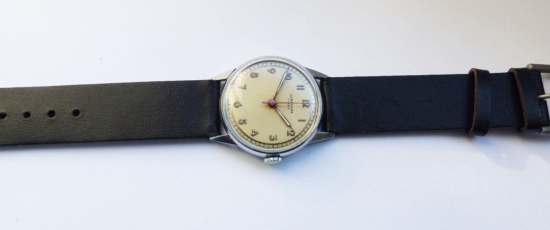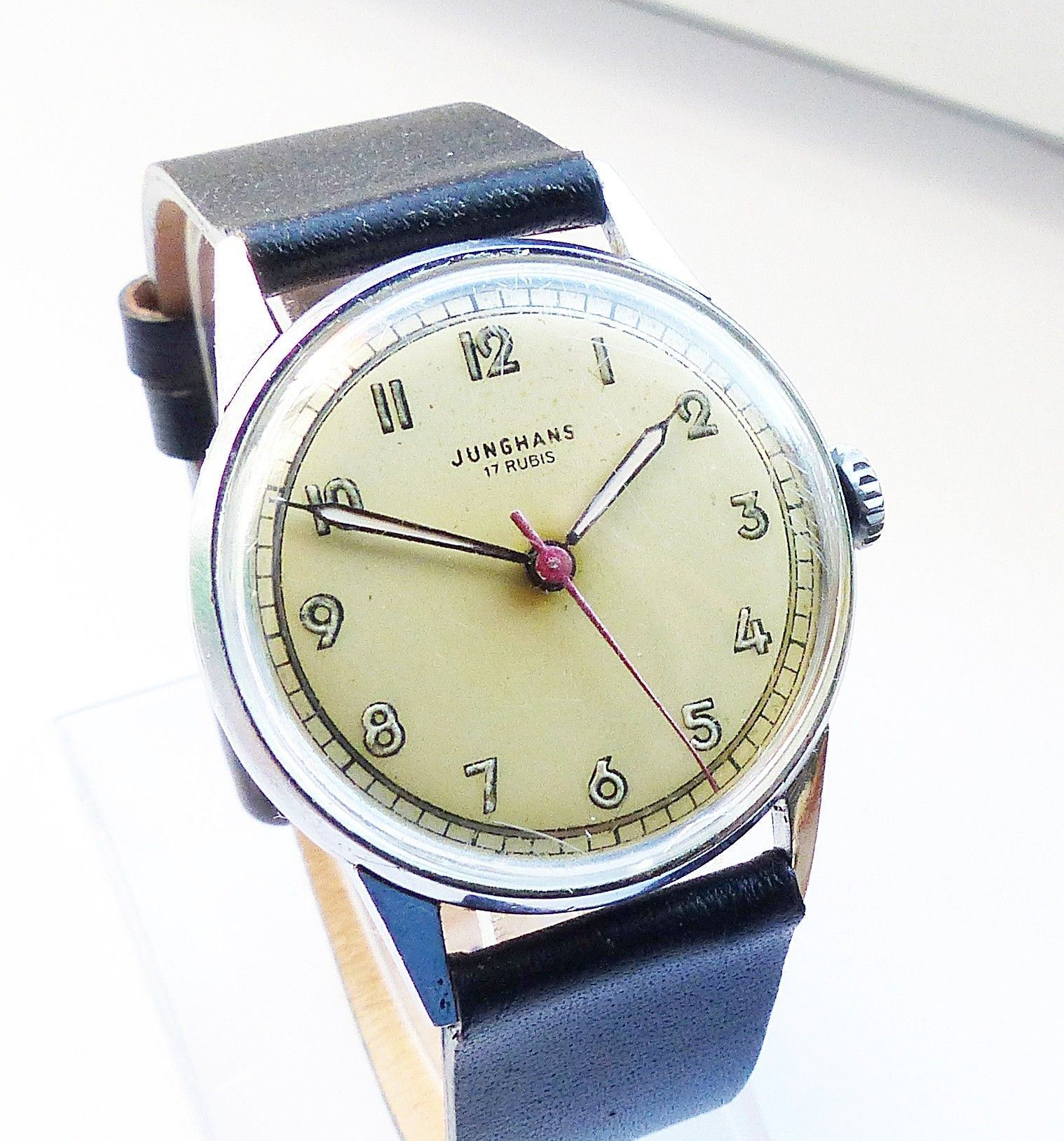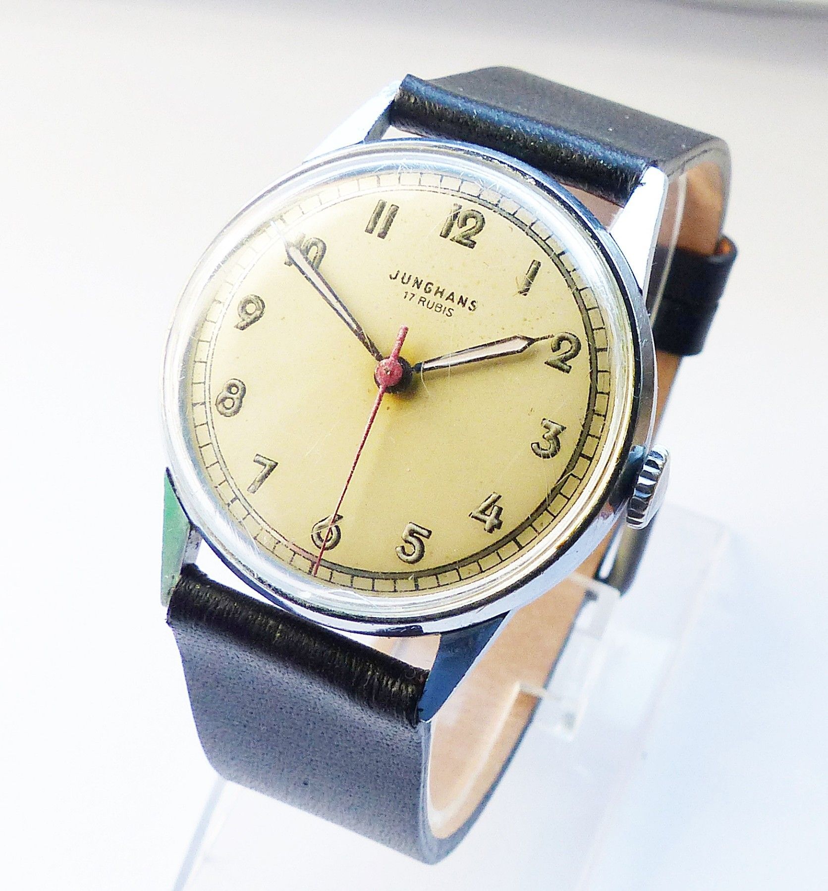 Schöne und sehr seltene Junghans Meister-Military Herren Vintage Armbanduhr mit Champagnerfarbenem Zifferblatt und arabischen aufgesetzten Zahlenindizes, grosser zentraler Sekunde. Die Uhr ist voll funktionsfähig und in sehr guten Zustand s. Fotos Hersteller : Junghans Deutschland Modell Meister-Mil... Mehr