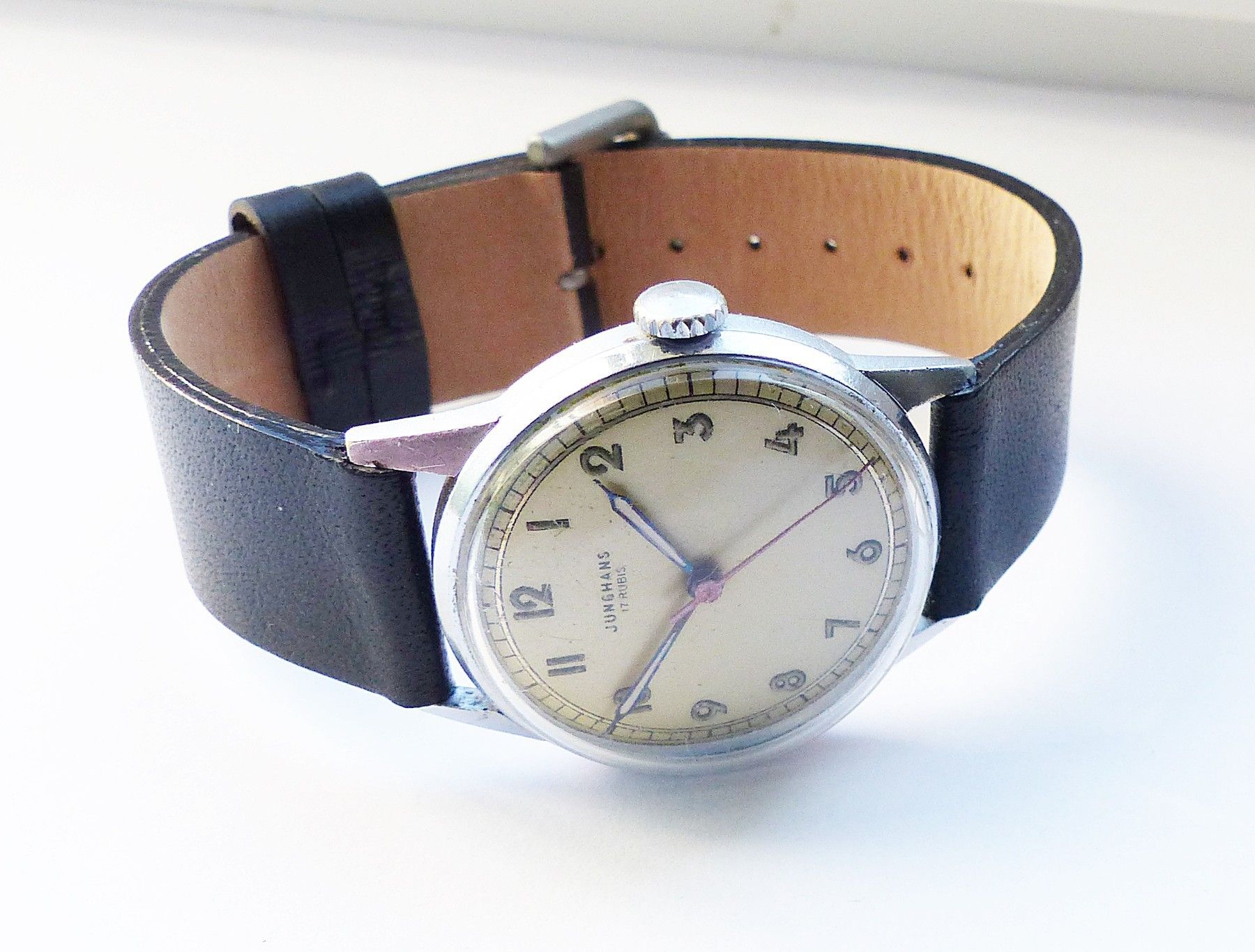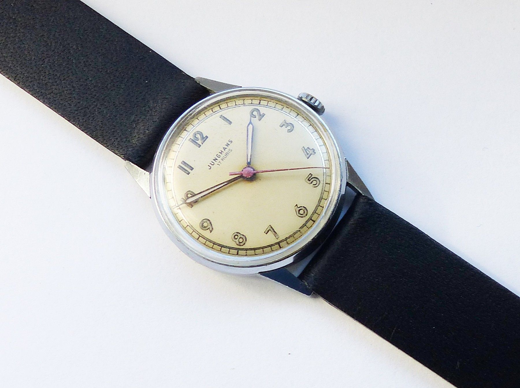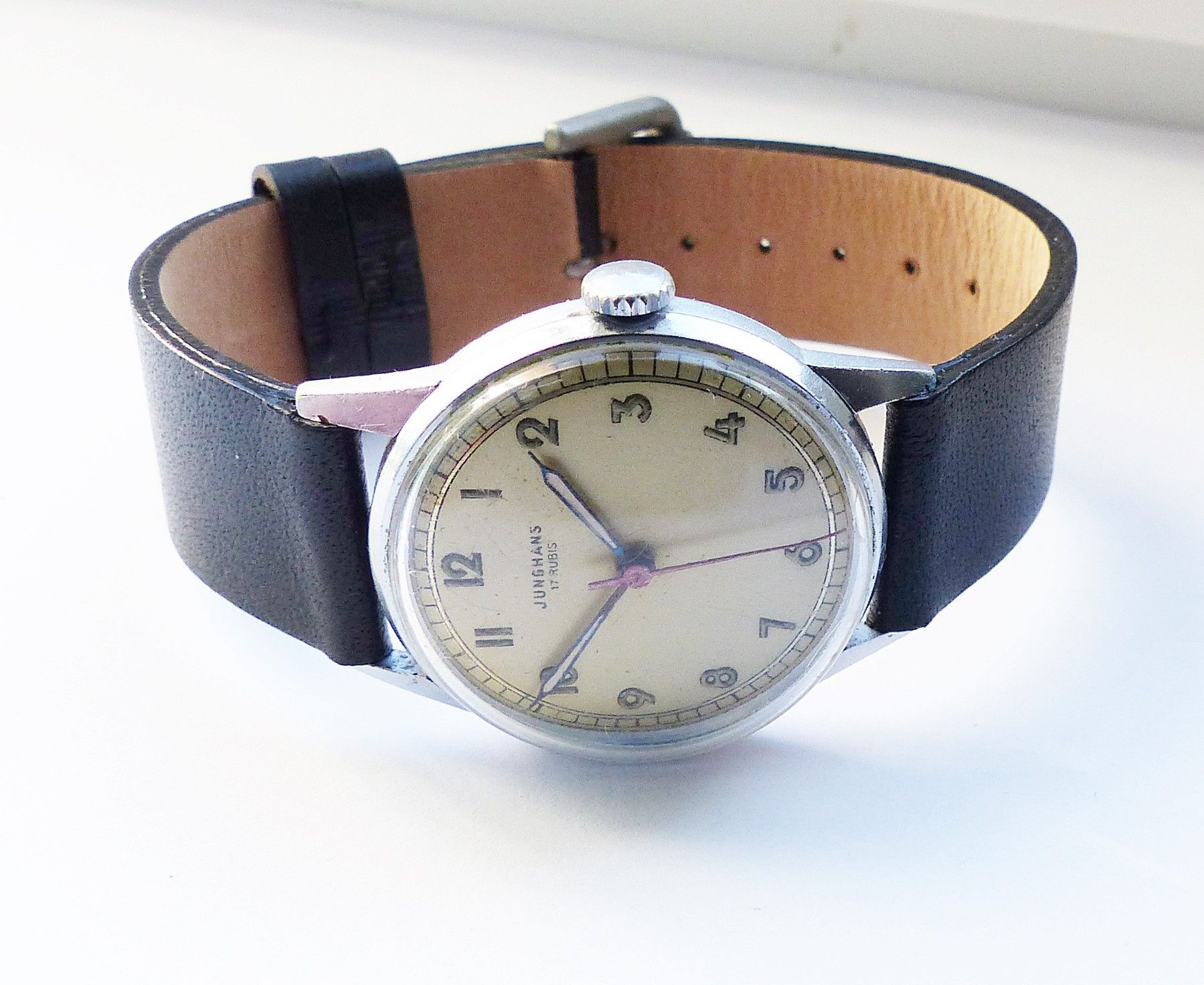 Schöne und sehr seltene Junghans Meister-Military Herren Vintage Armbanduhr mit Champagnerfarbenem Zifferblatt und arabischen aufgesetzten Zahlenindizes, grosser zentraler Sekunde. Die Uhr ist voll funktionsfähig und in sehr guten Zustand s. Fotos Hersteller : Junghans Deutschland Modell Meister-Mil... Mehr