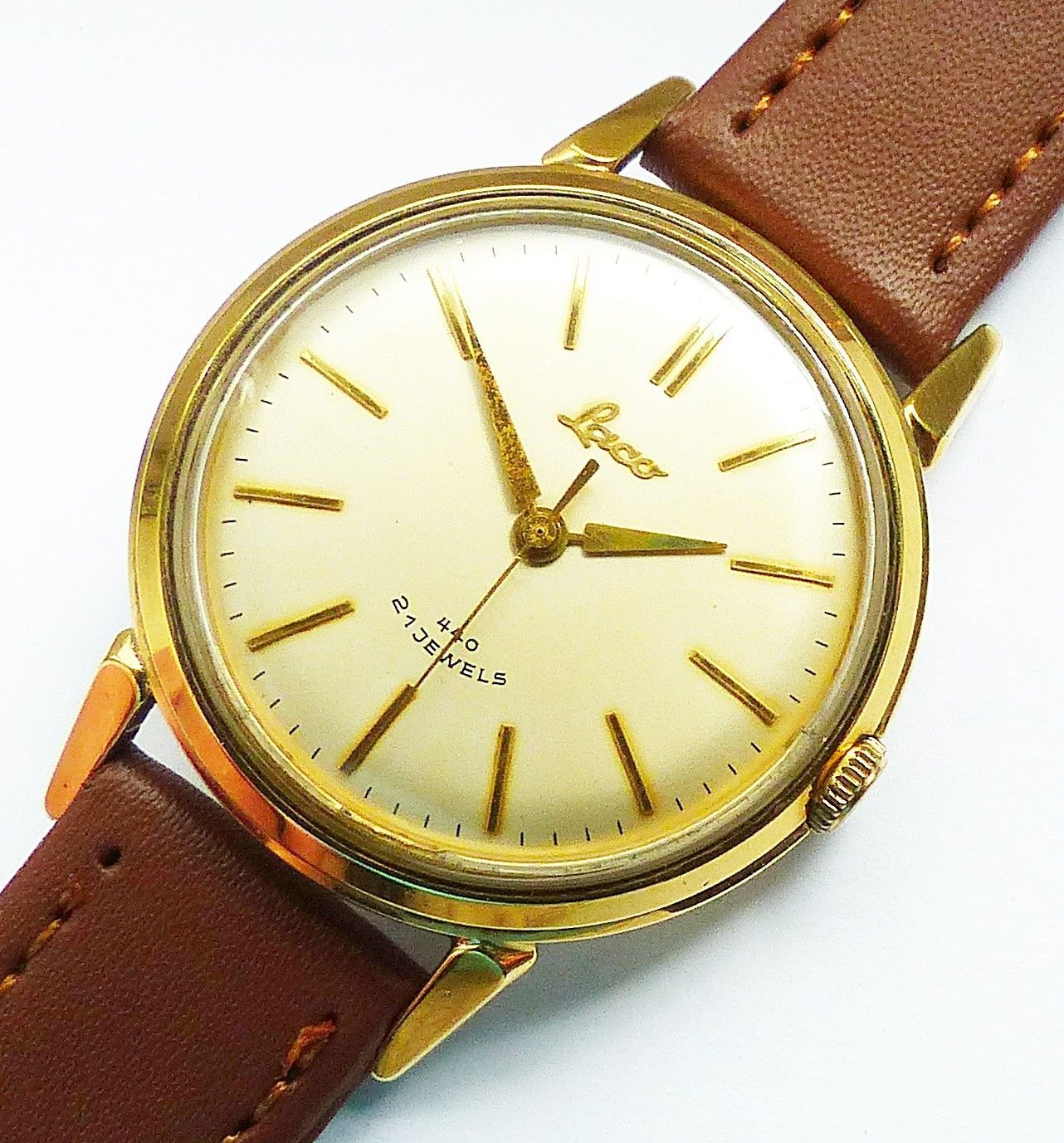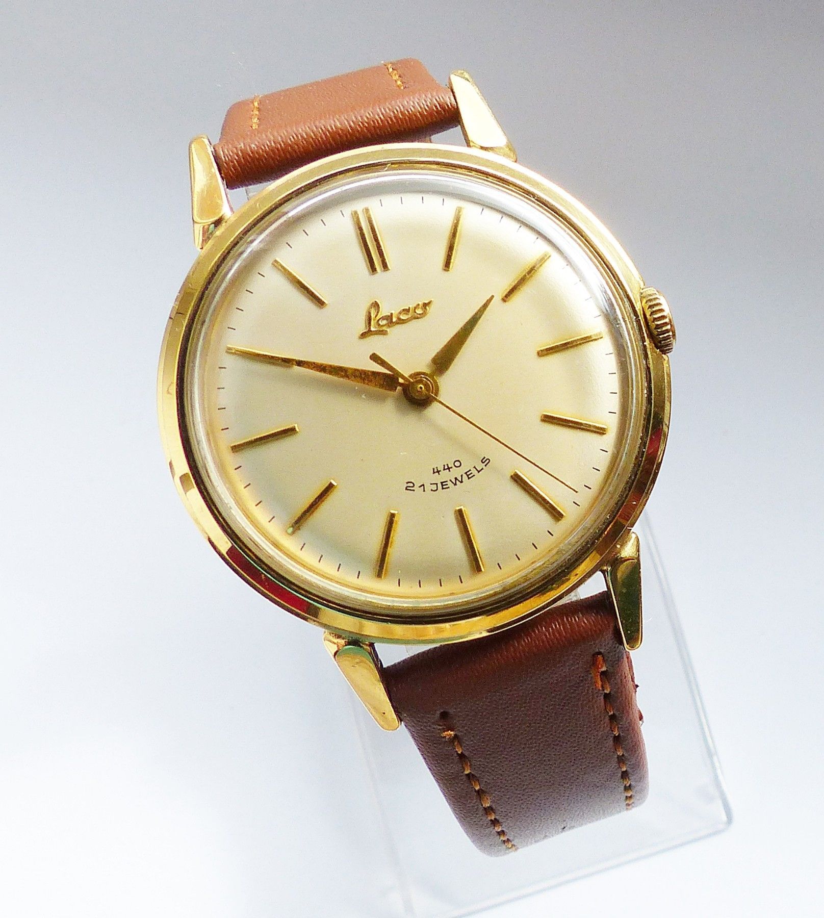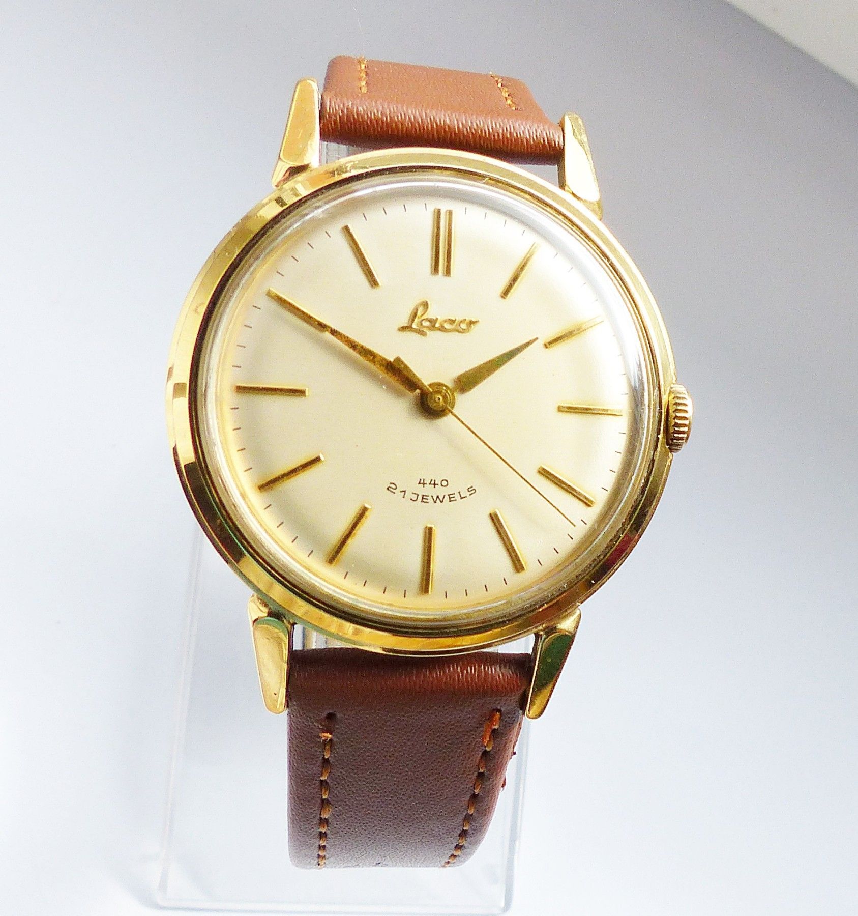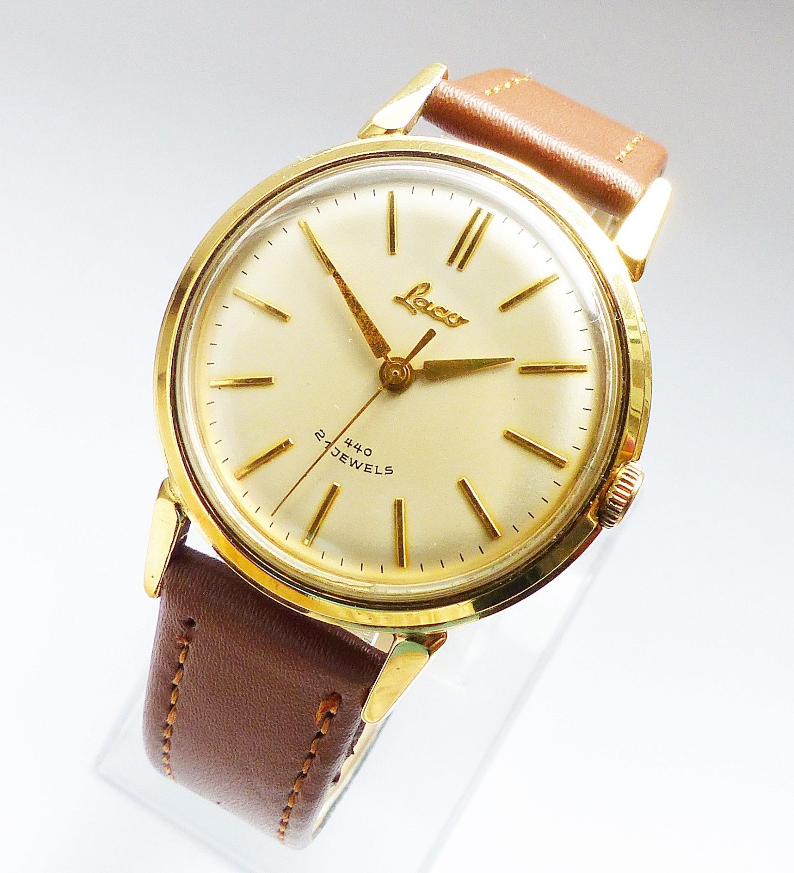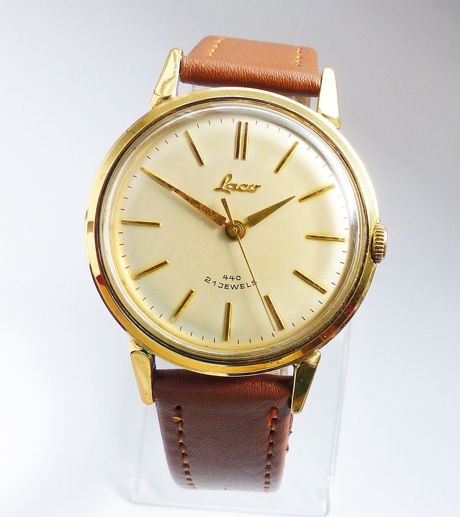 Schöne Laco Classic Herren Vintage Armbanduhr mit Goldenem Zifferblatt und aufgesetzten Goldenen Strichindizes, grosser Zentraler Sekunde und schönen Goldenen Lanzenzeigern. Die Uhr ist voll funktionsfähig und in Top Zustand s. Fotos Hersteller : Laco Deutschland Modell Classic Superflat. Uhrwerk : ... Mehr
