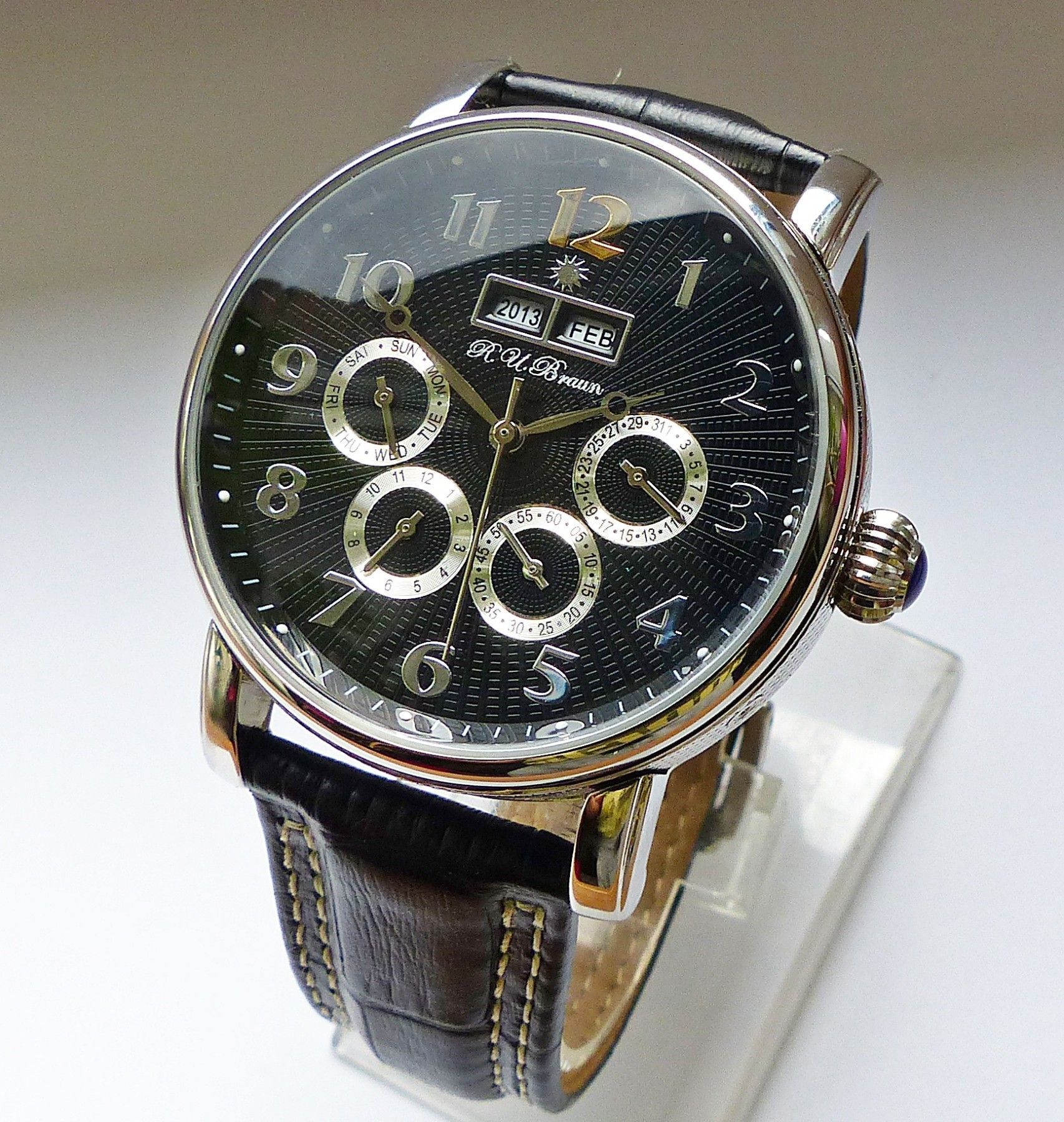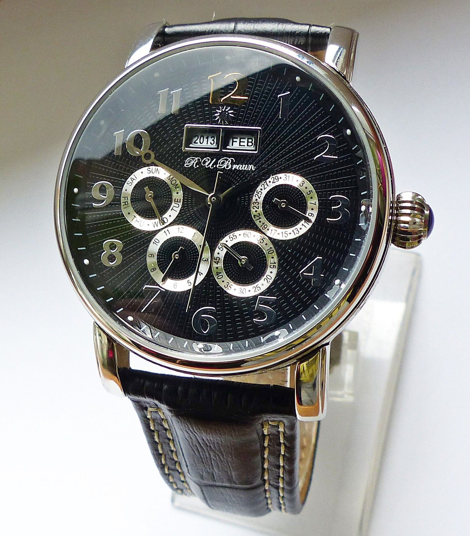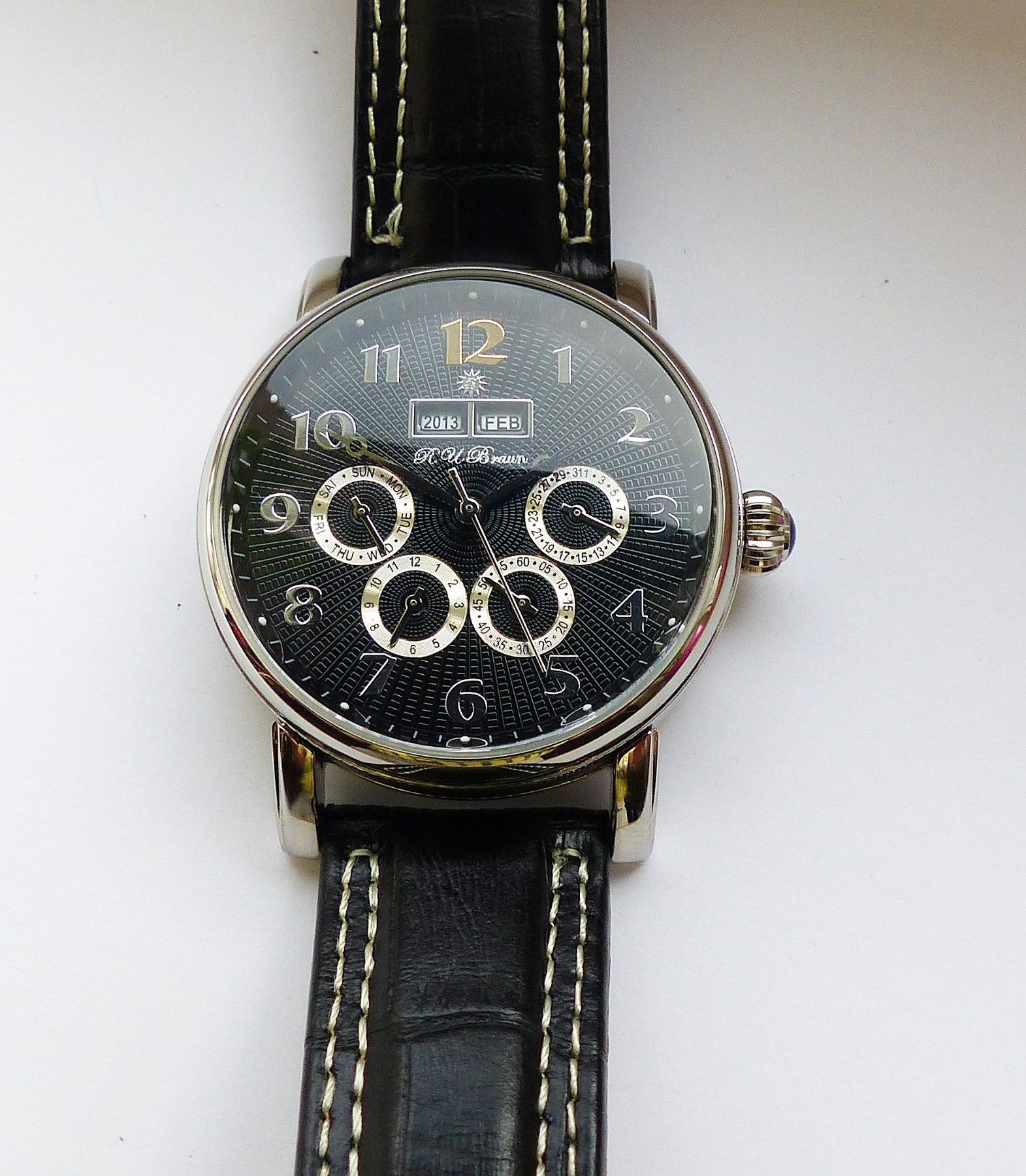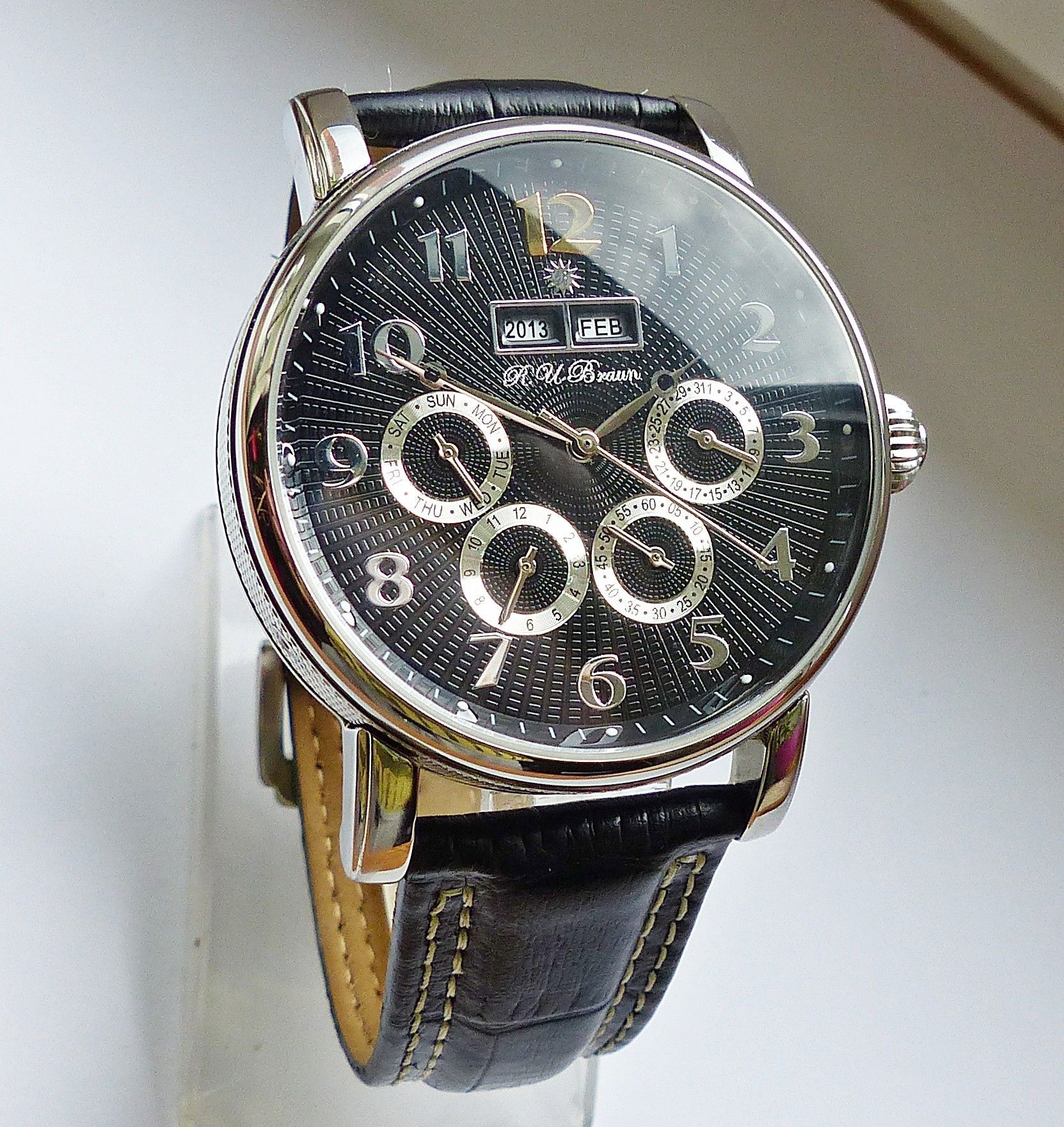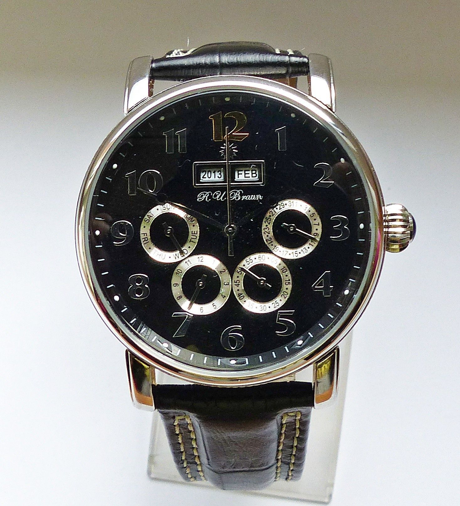Schöne R. U. Braun Sport Datograph Herren Armbanduhr mit Schwarzen Zifferblatt und aufgesetzten arabischen Zahlenindizes, Datum-Wochentag-Monat-Jahresanzeigen, grosser zentraler Sekunde, sichtbaren Automatik Uhrwerk, Glasboden etc. Die Uhr ist voll funktionsfähig und in ungetragenen neuwertigen Zust