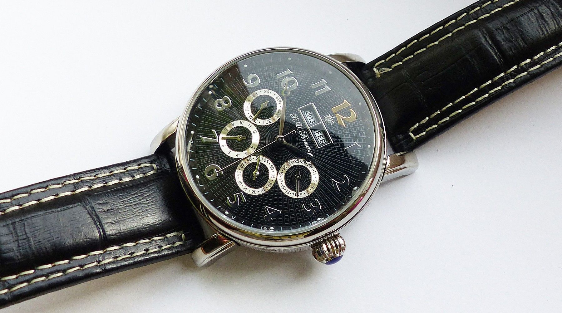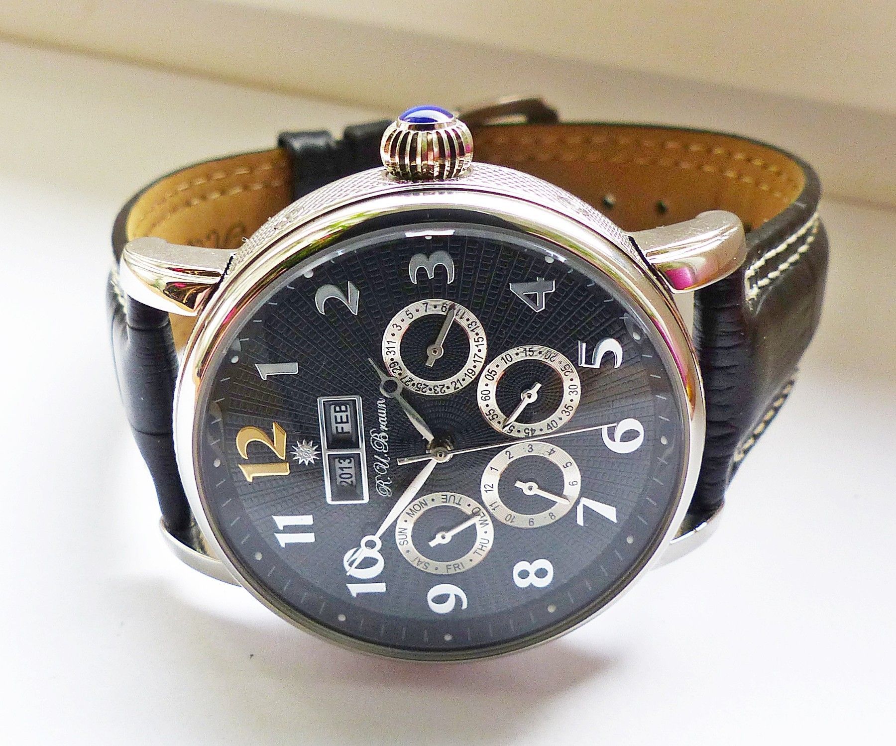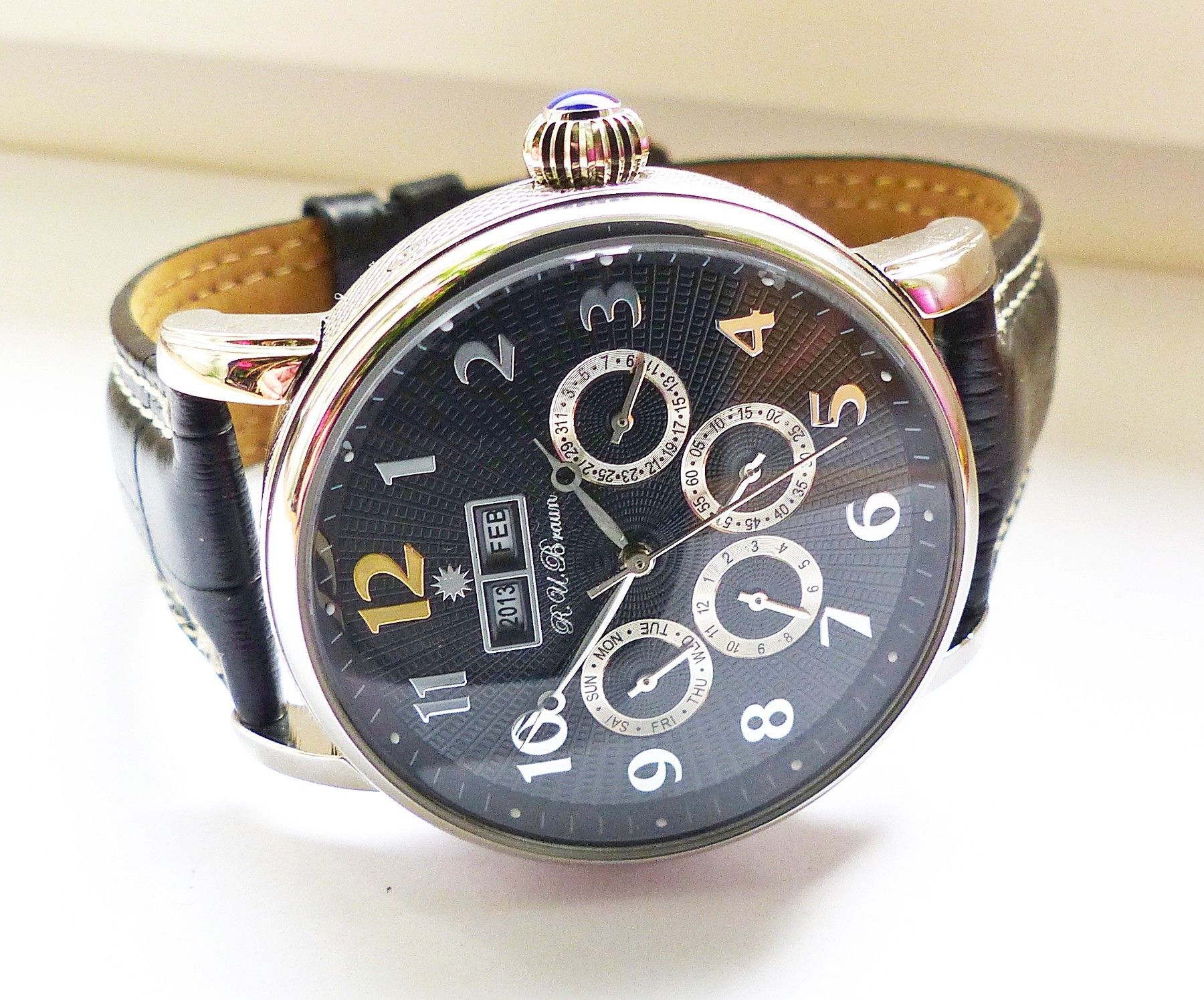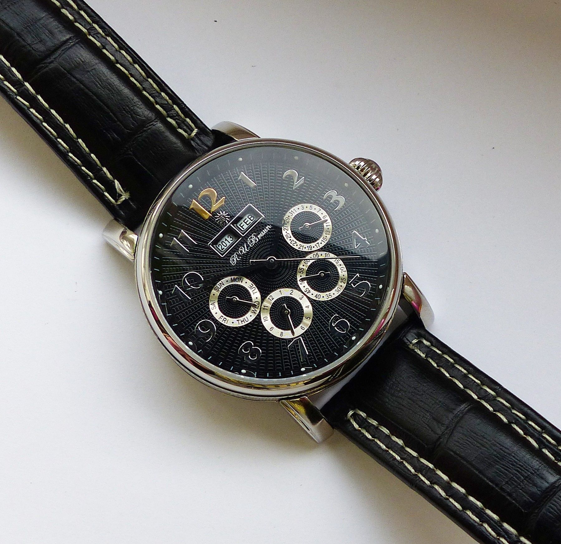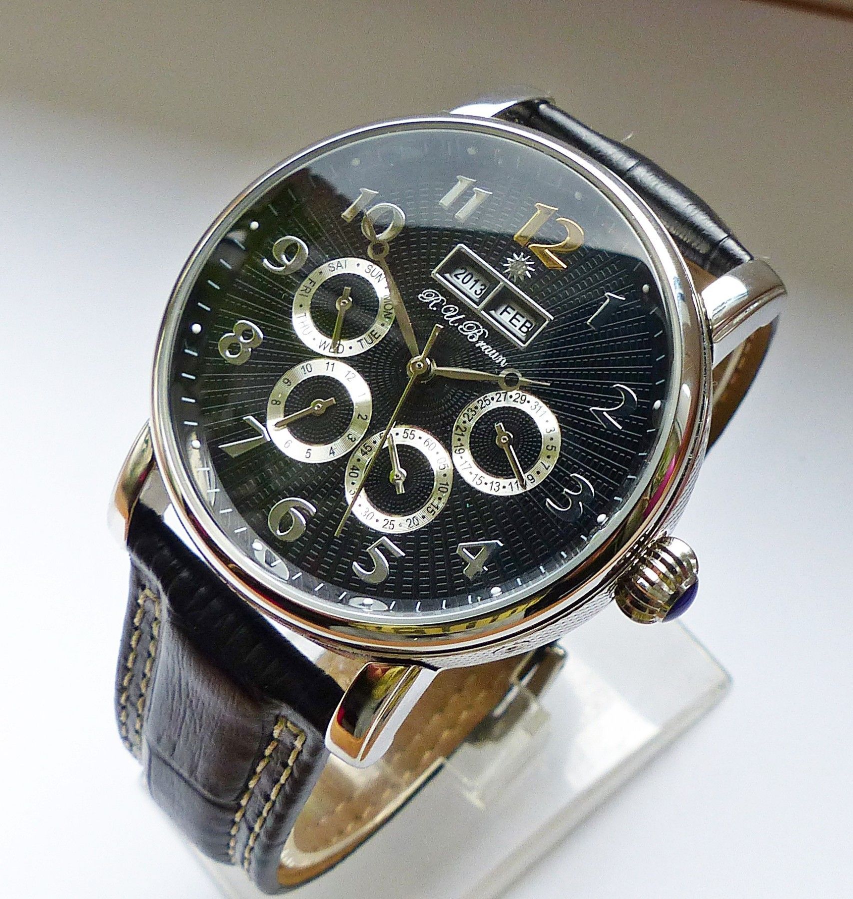 Schöne R. U. Braun Sport Datograph Herren Armbanduhr mit Schwarzen Zifferblatt und aufgesetzten arabischen Zahlenindizes, Datum-Wochentag-Monat-Jahresanzeigen, grosser zentraler Sekunde, sichtbaren Automatik Uhrwerk, Glasboden etc. Die Uhr ist voll funktionsfähig und in ungetragenen neuwertigen Zust