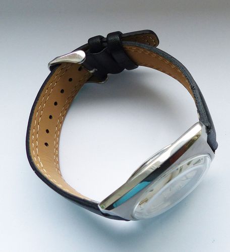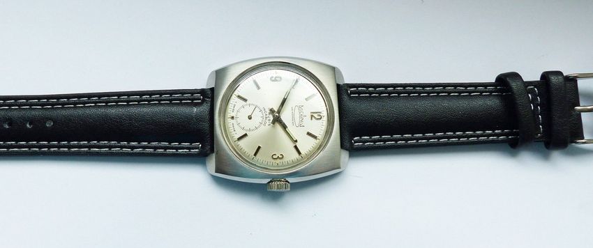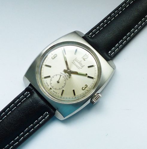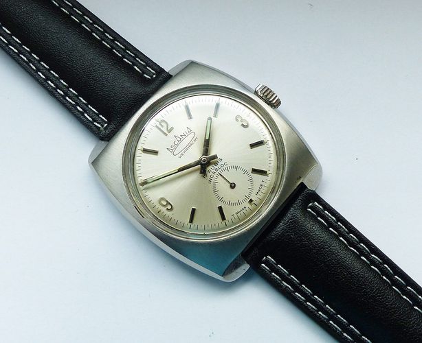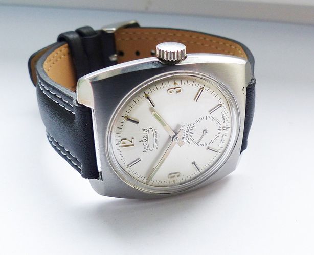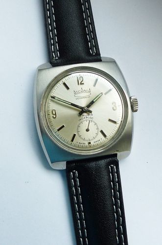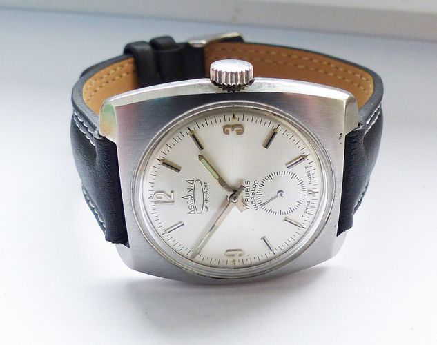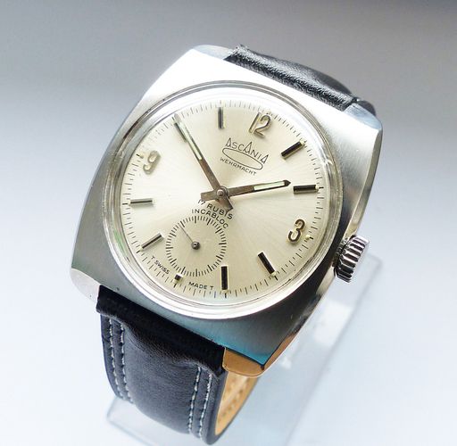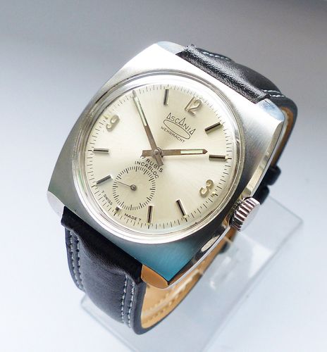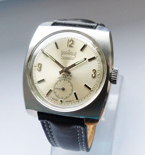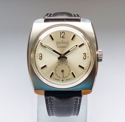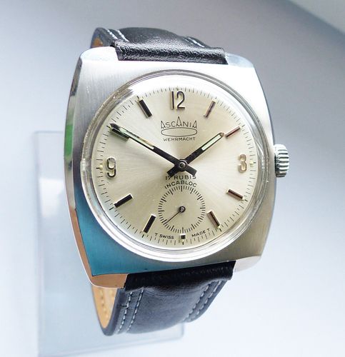 Schöne und sehr seltene Askania Wehrmacht Herren Luxus Vintage Armbanduhr mit Silbernem Zifferblatt im Sonnenschlifft und aufgesetzten Schwarz-Silbernen Strichindizes, dezentraler kleiner Sekunde bei 6.00 Uhr, fluoreszierenden Zeigern und Indexpunkten. Die Uhr ist voll funktionsfähig und in Top Zust... Mehr