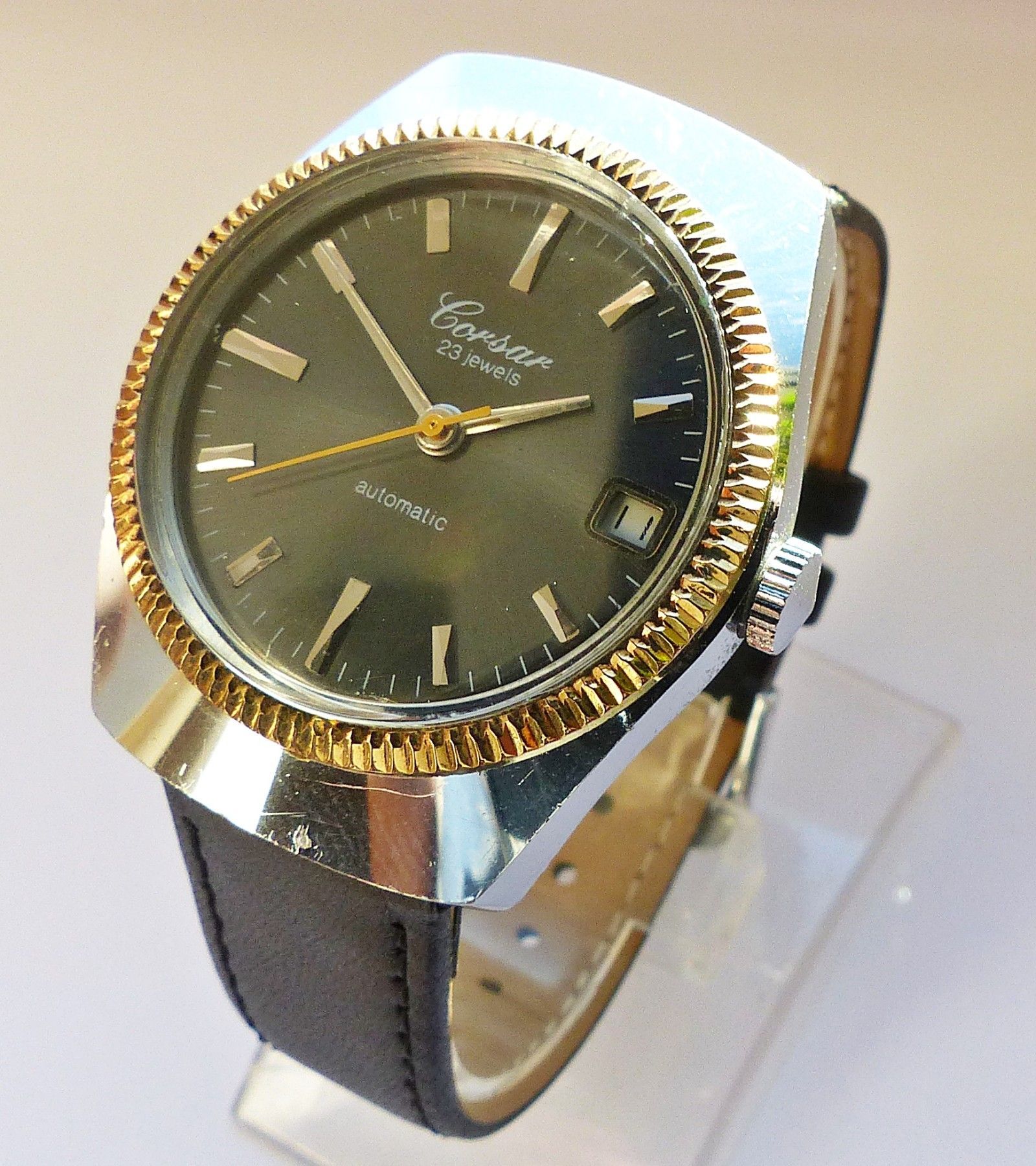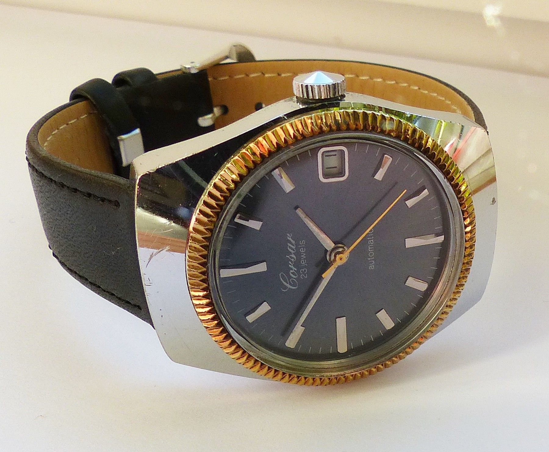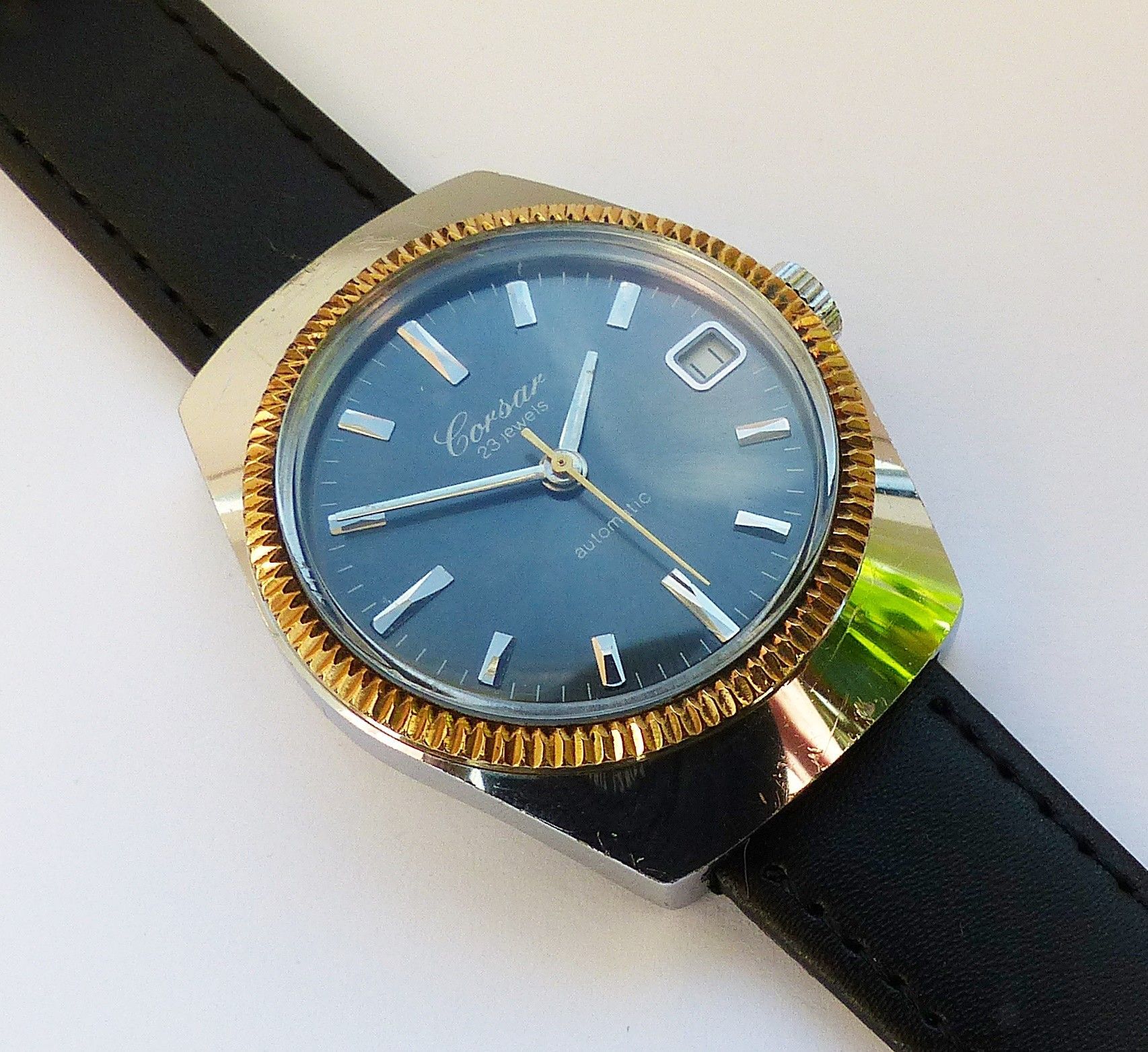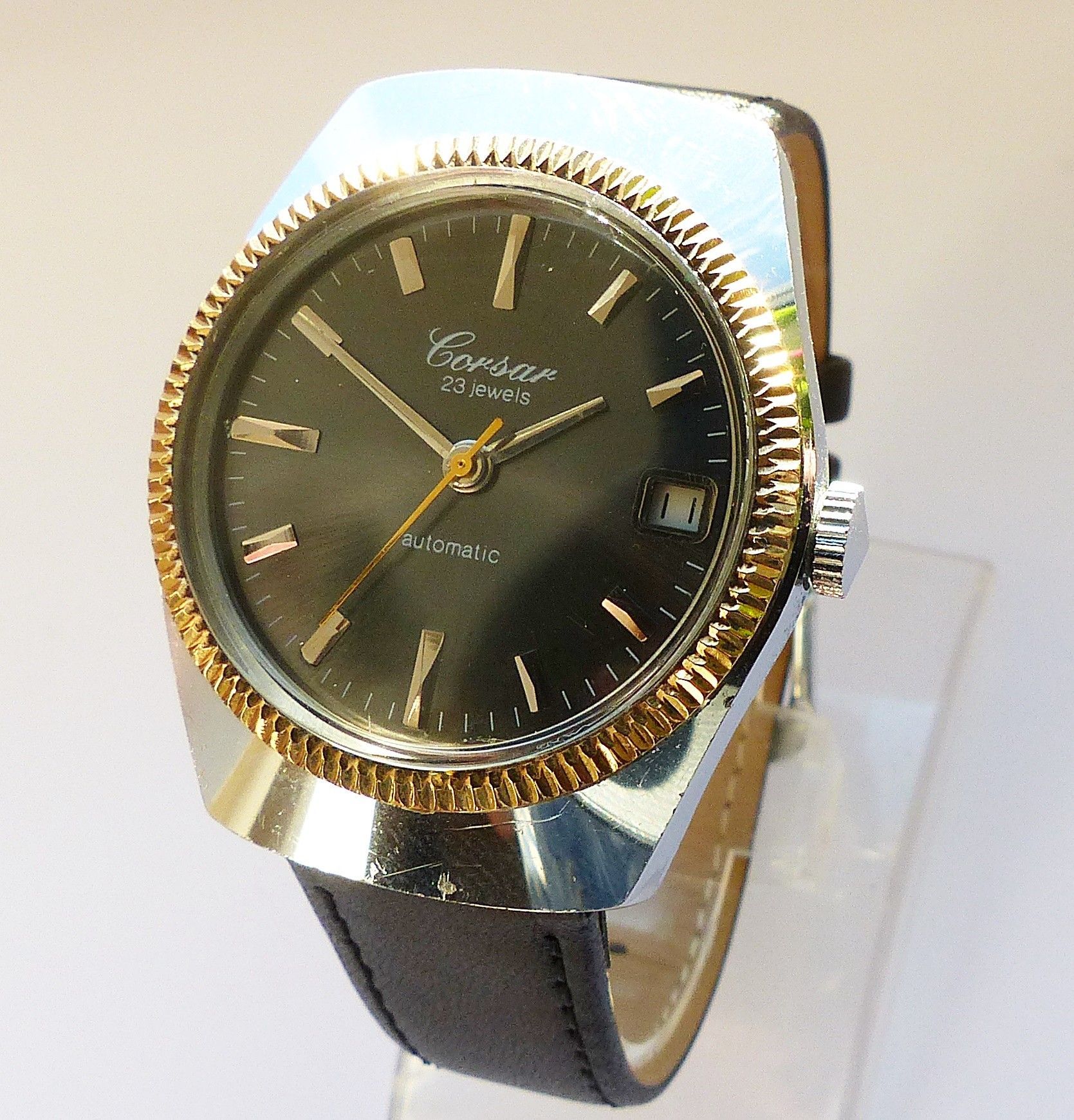 Schöne Corsar Classic Calendar Herren Vintage Armbanduhr mit Schwarzen Zifferblatt und aufgesetzten Silbernen Strichindexen, grosser zentraler Sekunde, Datum bei 3.00 Uhr, vergoldeter grändelter Lünette. Die Uhr ist voll funktionsfähig und in Top Zustand s. Fotos Uhrwerk : Mechanisch-Automatisch mit