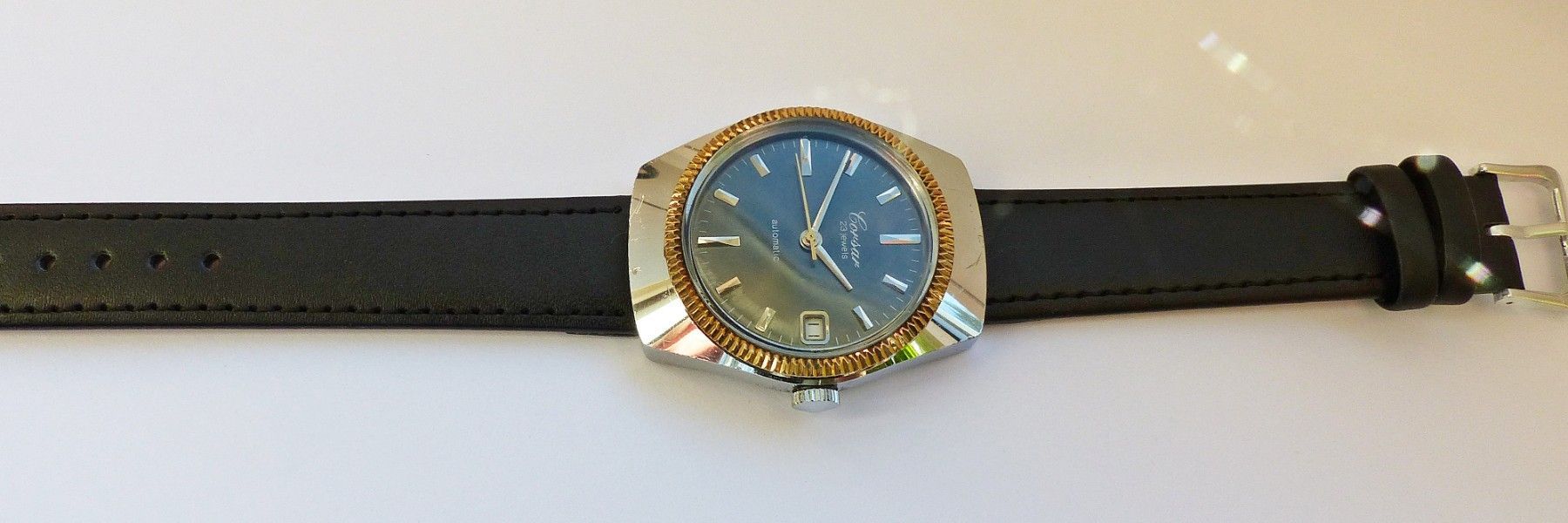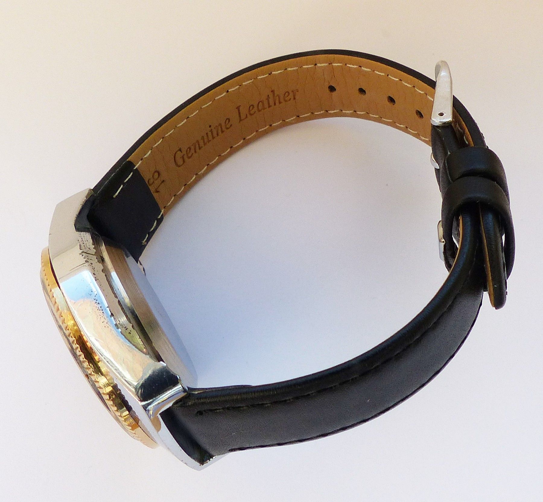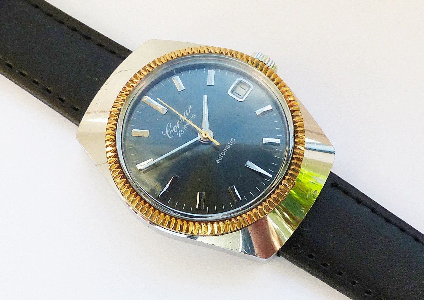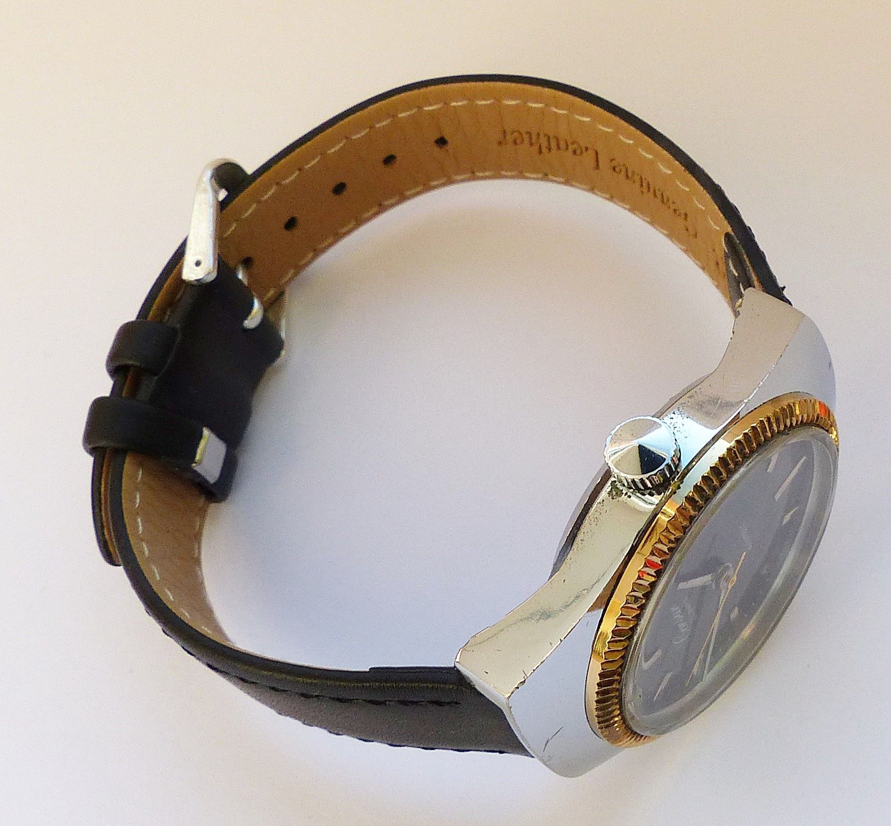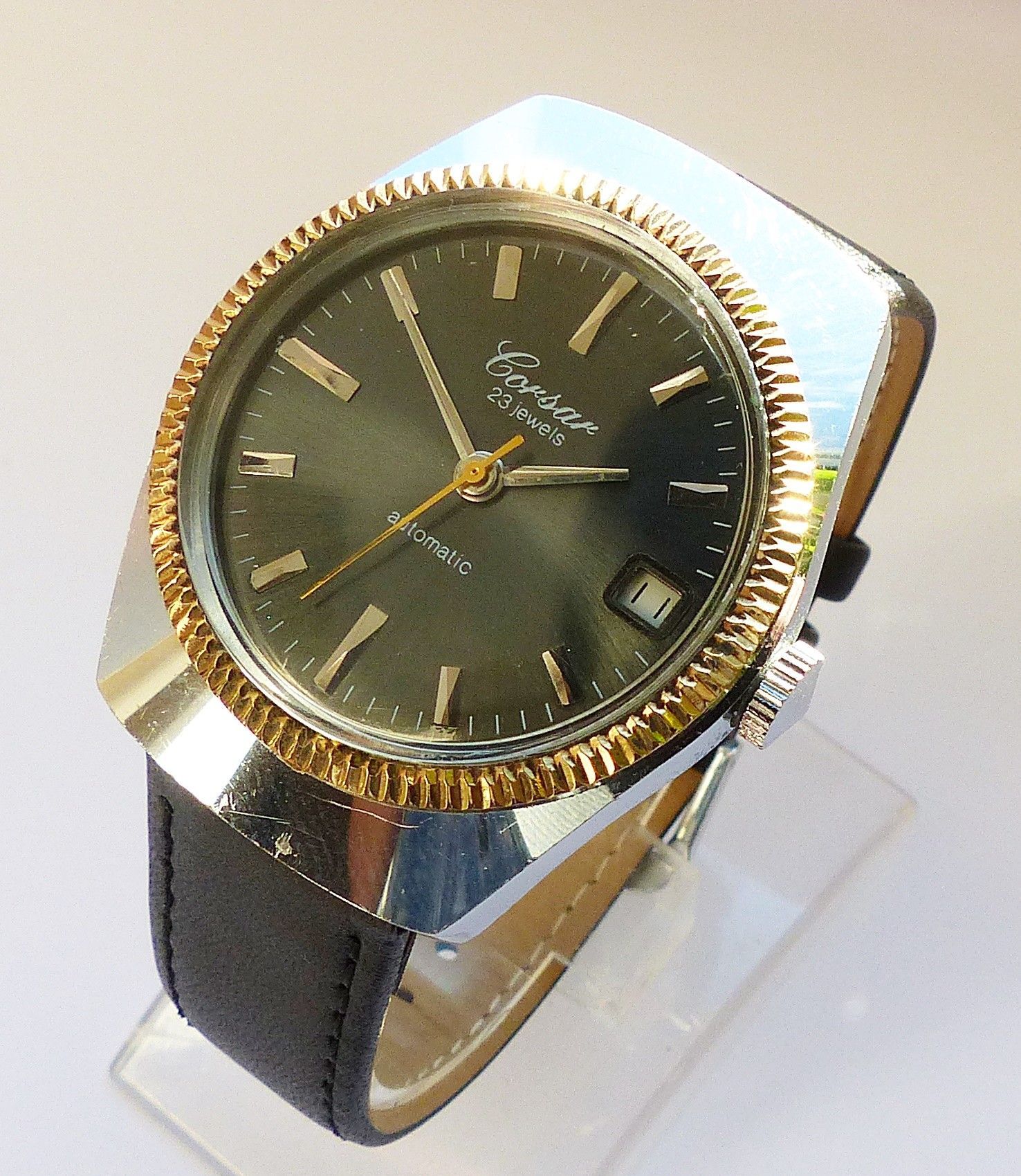 Schöne Corsar Classic Calendar Herren Vintage Armbanduhr mit Schwarzen Zifferblatt und aufgesetzten Silbernen Strichindexen, grosser zentraler Sekunde, Datum bei 3.00 Uhr, vergoldeter grändelter Lünette. Die Uhr ist voll funktionsfähig und in Top Zustand s. Fotos Uhrwerk : Mechanisch-Automatisch mit