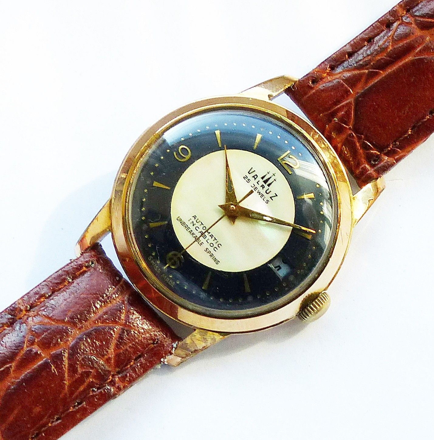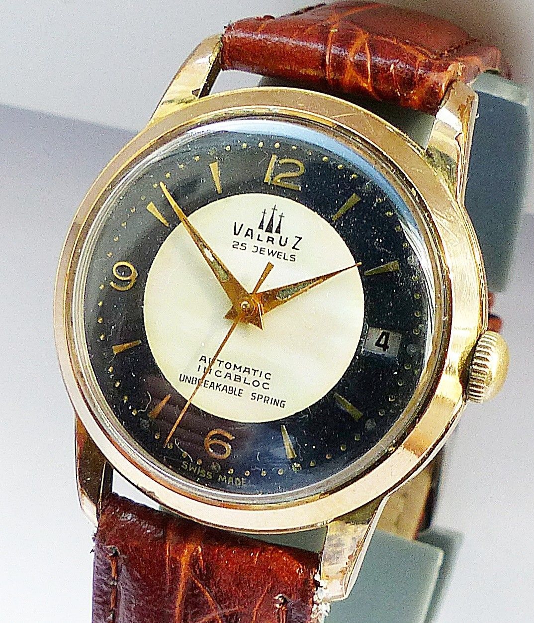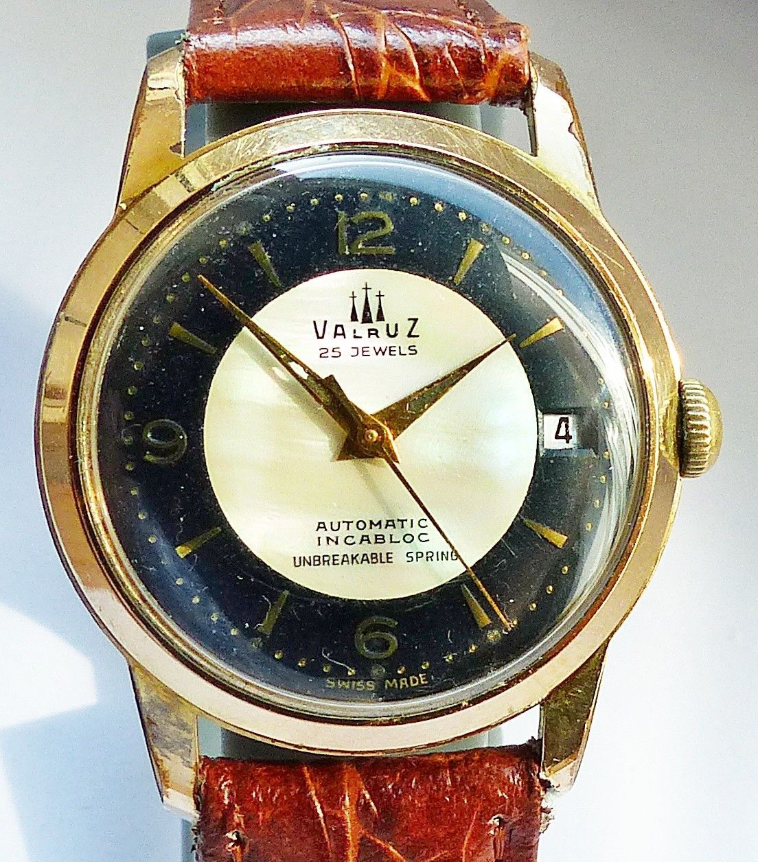 Schöne und sehr seltene Walruz Schweiz Automatic Calendar Herren Vintage Armbanduhr mit Perlmutt Zifferblatt in Gold und Schwarz und aufgesetzten Zahlen und Pfeilindizes, Datum bei 3.00 Uhr., grosser zentraler Sekunde, fluoreszierenden Zeigern und Indexpunkten. Die Uhr ist voll funktionsfähig und in