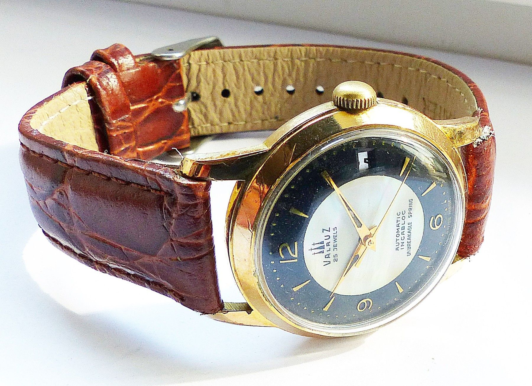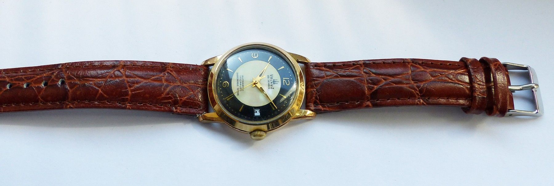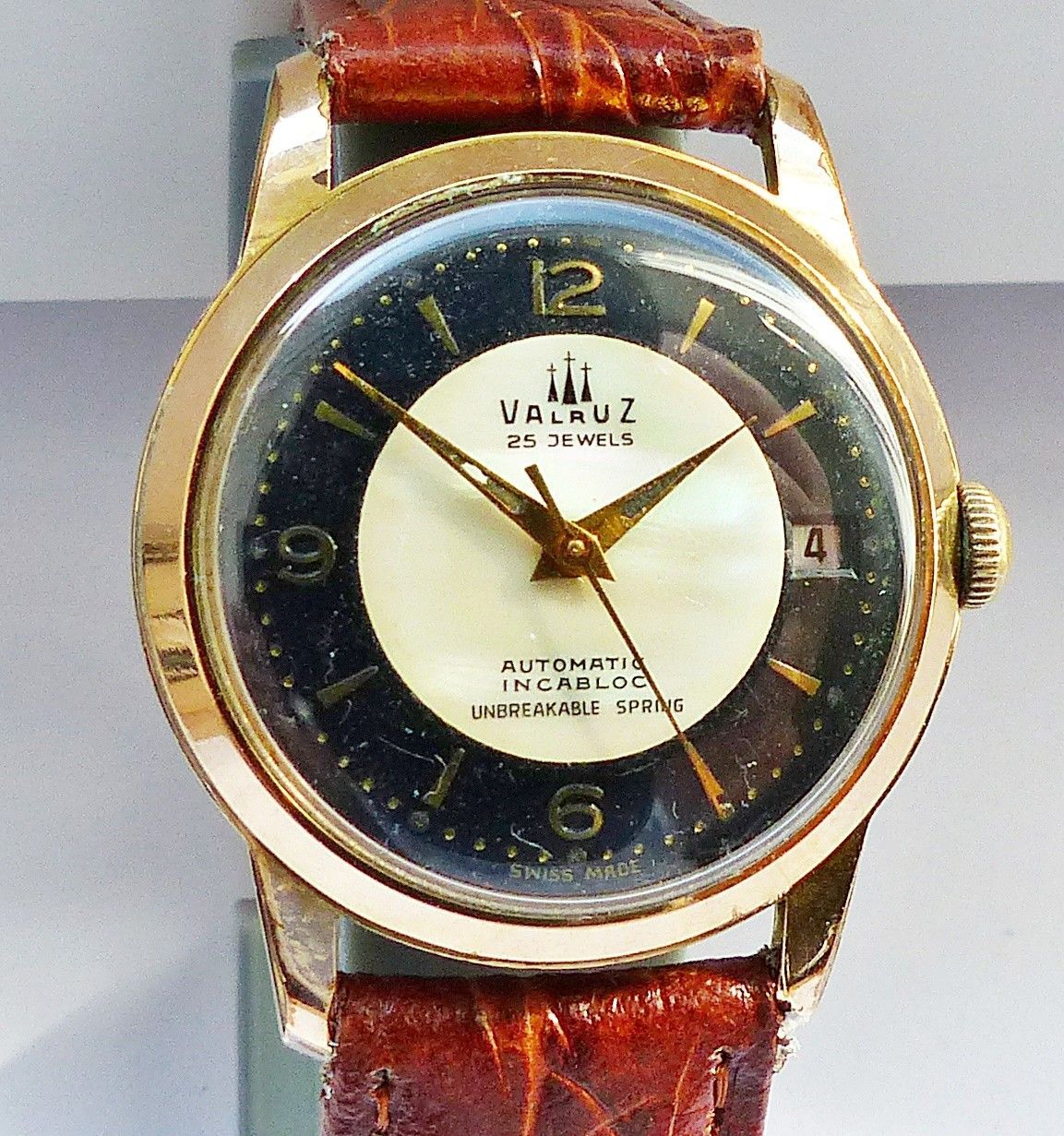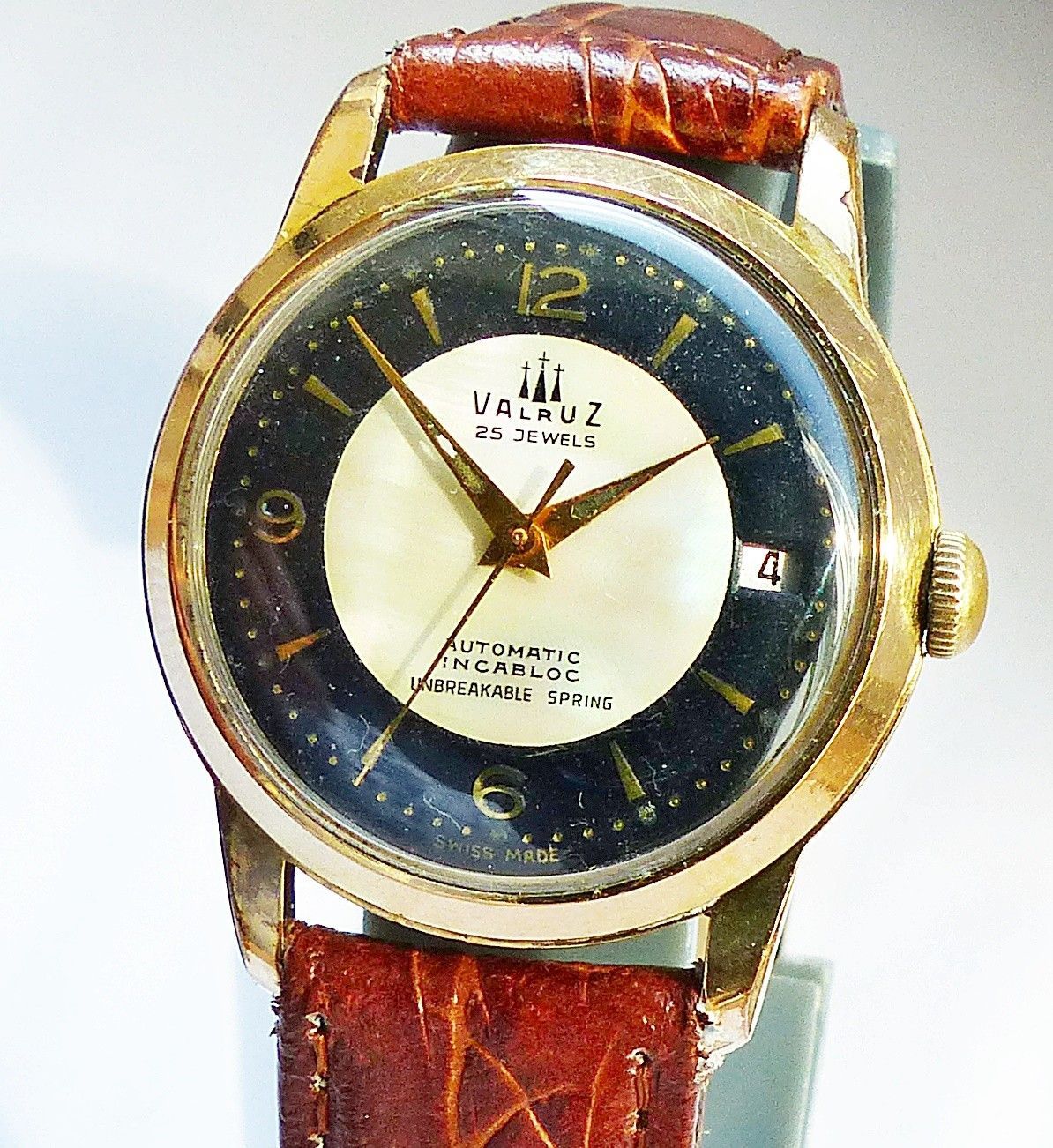 Schöne und sehr seltene Walruz Schweiz Automatic Calendar Herren Vintage Armbanduhr mit Perlmutt Zifferblatt in Gold und Schwarz und aufgesetzten Zahlen und Pfeilindizes, Datum bei 3.00 Uhr., grosser zentraler Sekunde, fluoreszierenden Zeigern und Indexpunkten. Die Uhr ist voll funktionsfähig und in