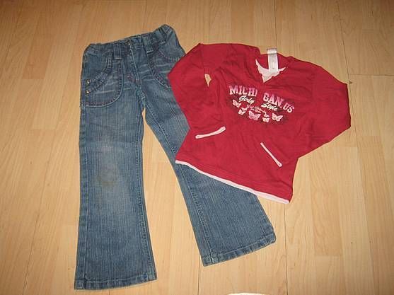 Die Kombi besteht aus einer Jeans von Berti (NKD), Gr. 116, wird mit Schiebeknopf und RV geschlossen, verstellbares Bündchen, teilweise pinke und hellblaue Nähte, Auswascheffekte an den Beinen, leichter Schlag, so ist sie in einem guten Zustand, leider sind aber die Knien angeschmuddelt, was ich mit