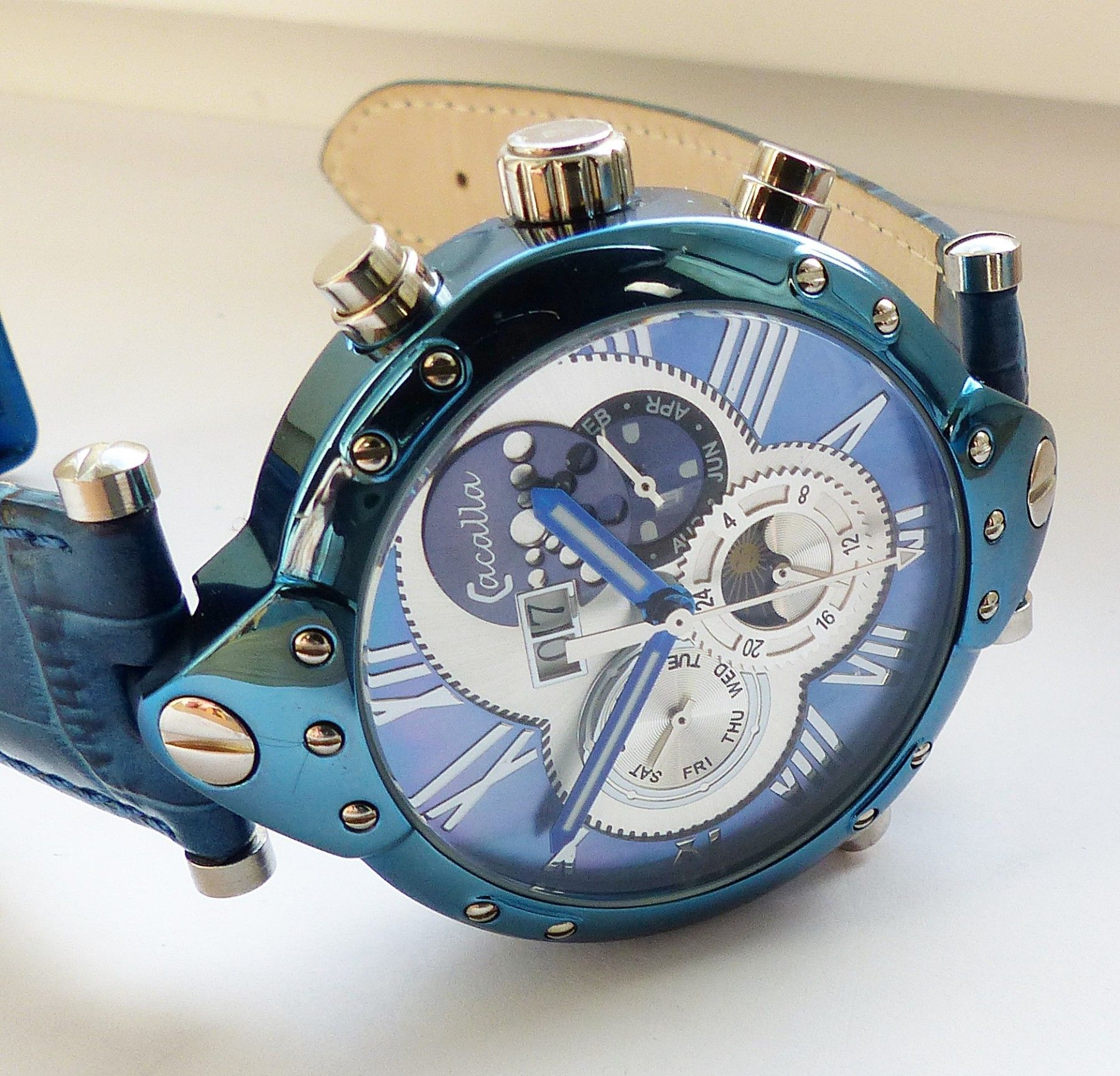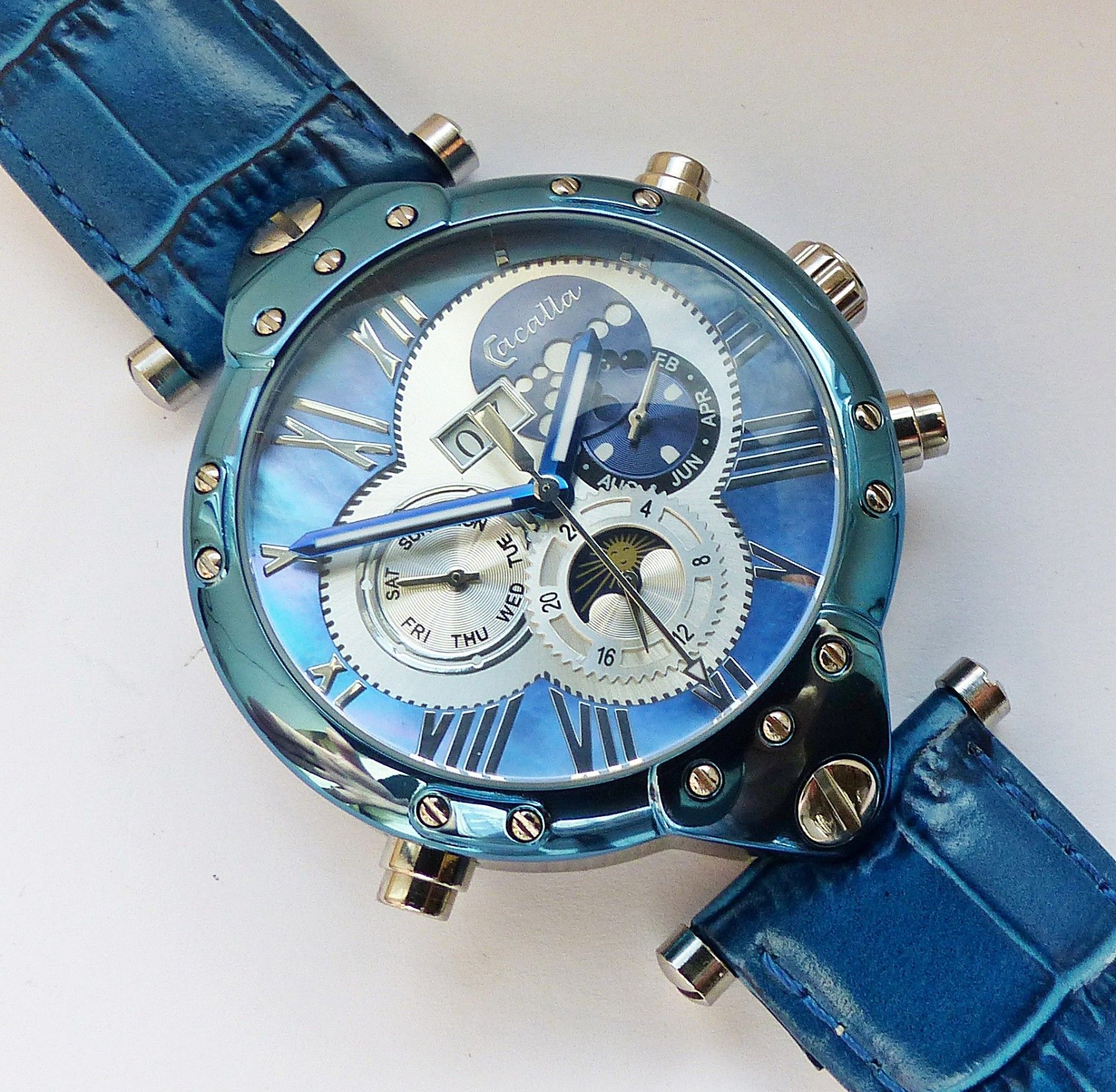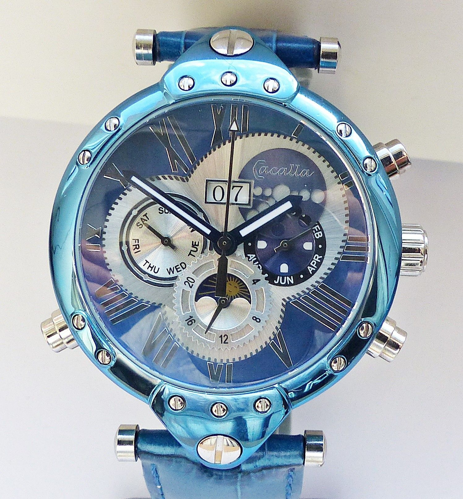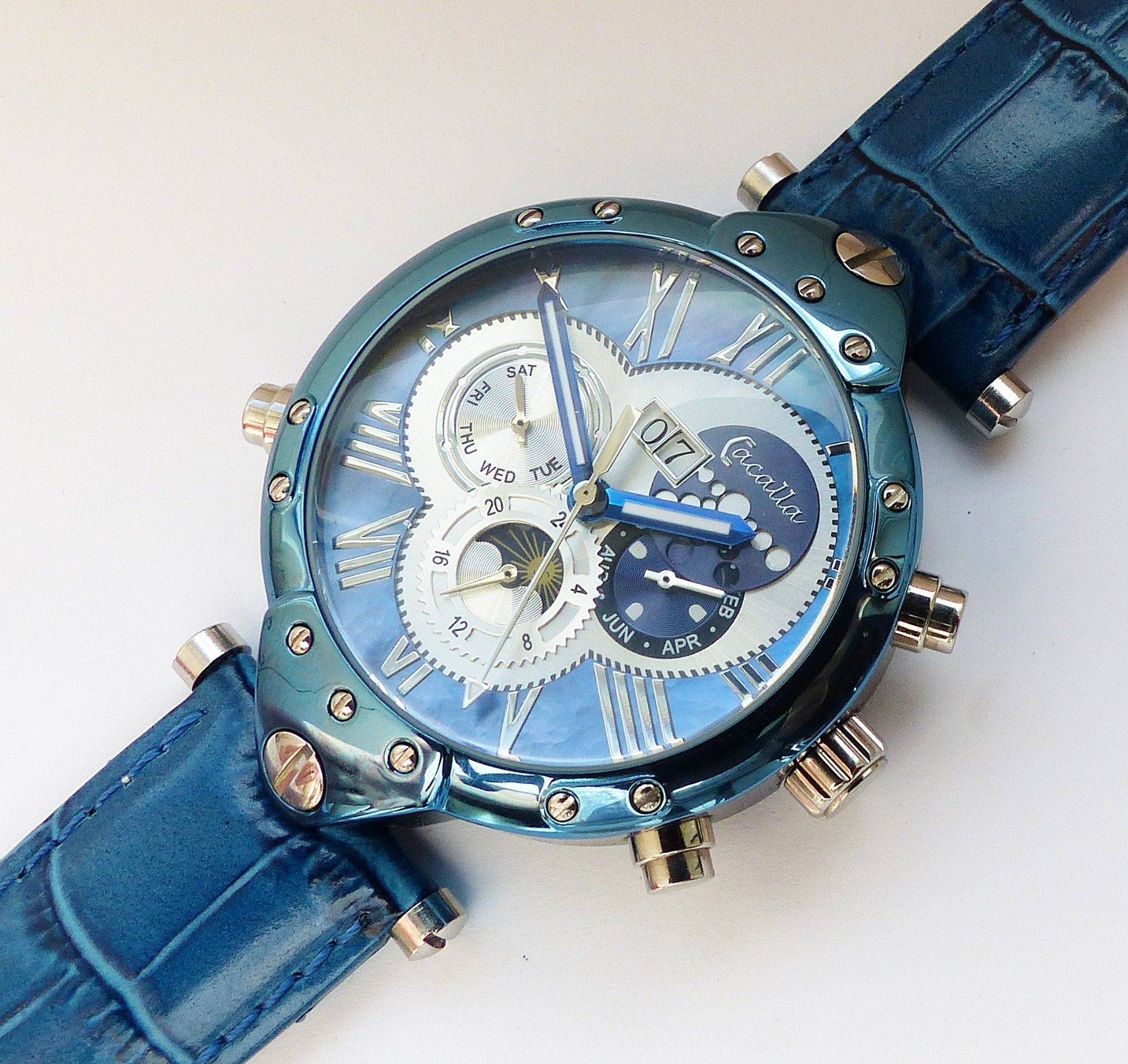 Schöner Cacalla Sun&Moon Datograph Herren Armbanduhr mit Blau-Silbernem Zifferblatt und aufgesetzten römischenZahlenindizes, grosser zentraler Sekunde, Großdatum bei 12.00 Uhr, Monatsanzeige bei 3.00 Uhr, Sun&Moon Anzeige bei 6.00 Uhr, 24Stundenanzeige bei 6.00 Uhr, Tagesanzeige bei 9.00 Uhr. Die Uh