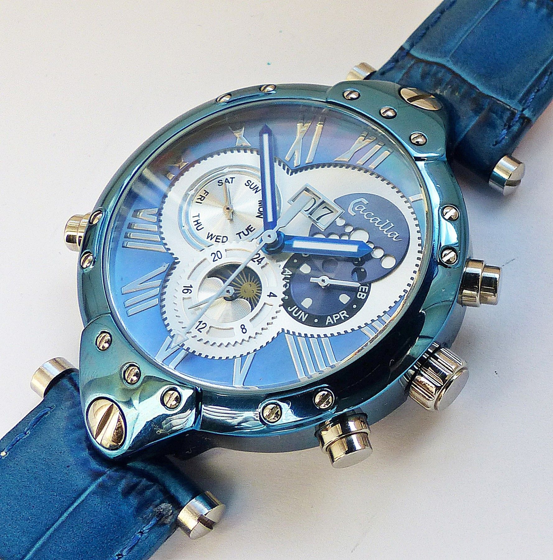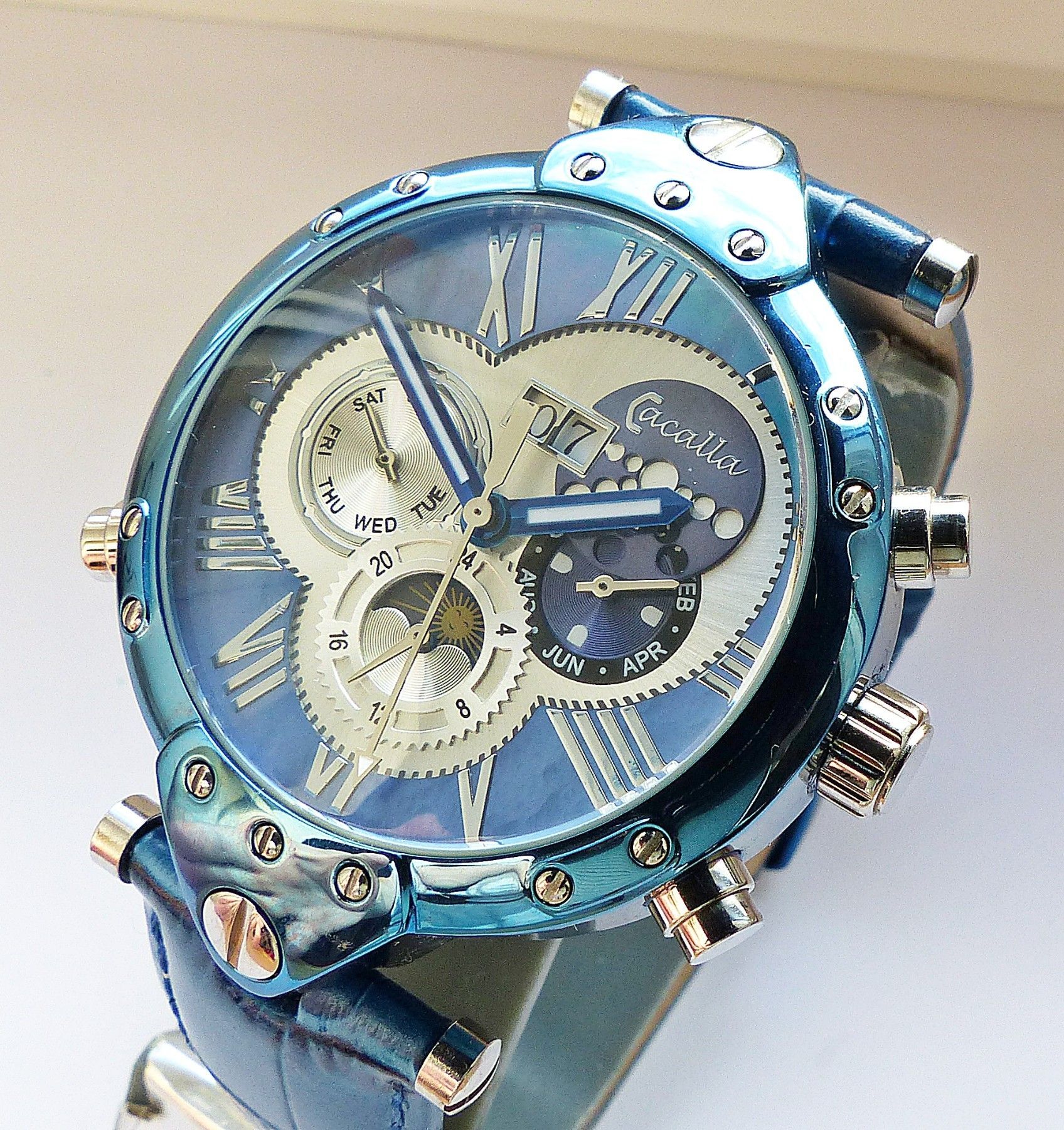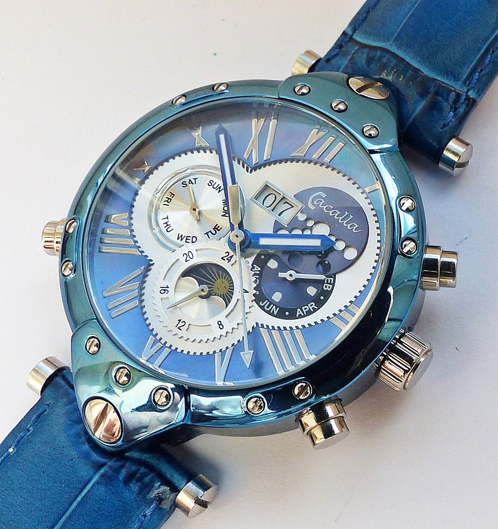 Schöner Cacalla Sun&Moon Datograph Herren Armbanduhr mit Blau-Silbernem Zifferblatt und aufgesetzten römischenZahlenindizes, grosser zentraler Sekunde, Großdatum bei 12.00 Uhr, Monatsanzeige bei 3.00 Uhr, Sun&Moon Anzeige bei 6.00 Uhr, 24Stundenanzeige bei 6.00 Uhr, Tagesanzeige bei 9.00 Uhr. Die Uh