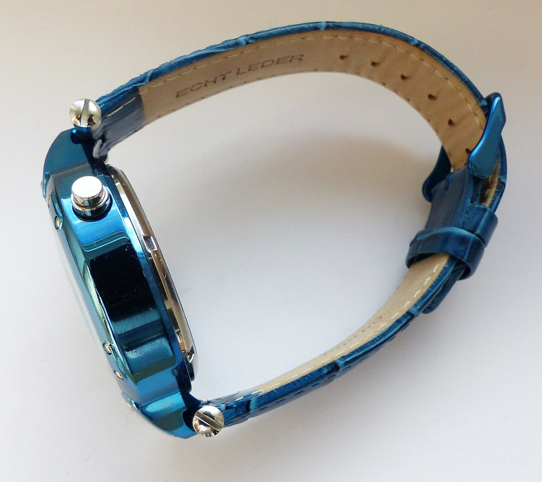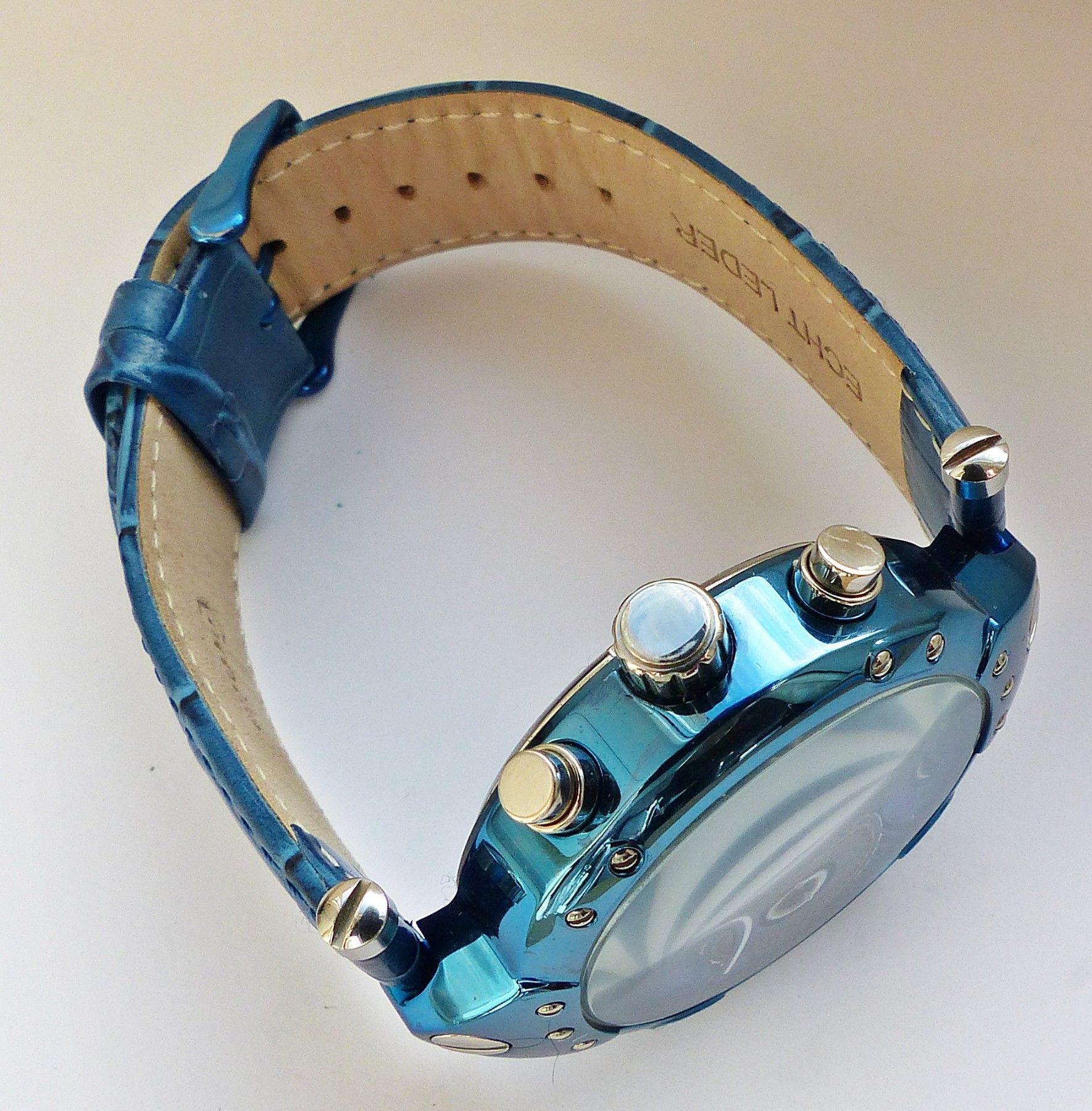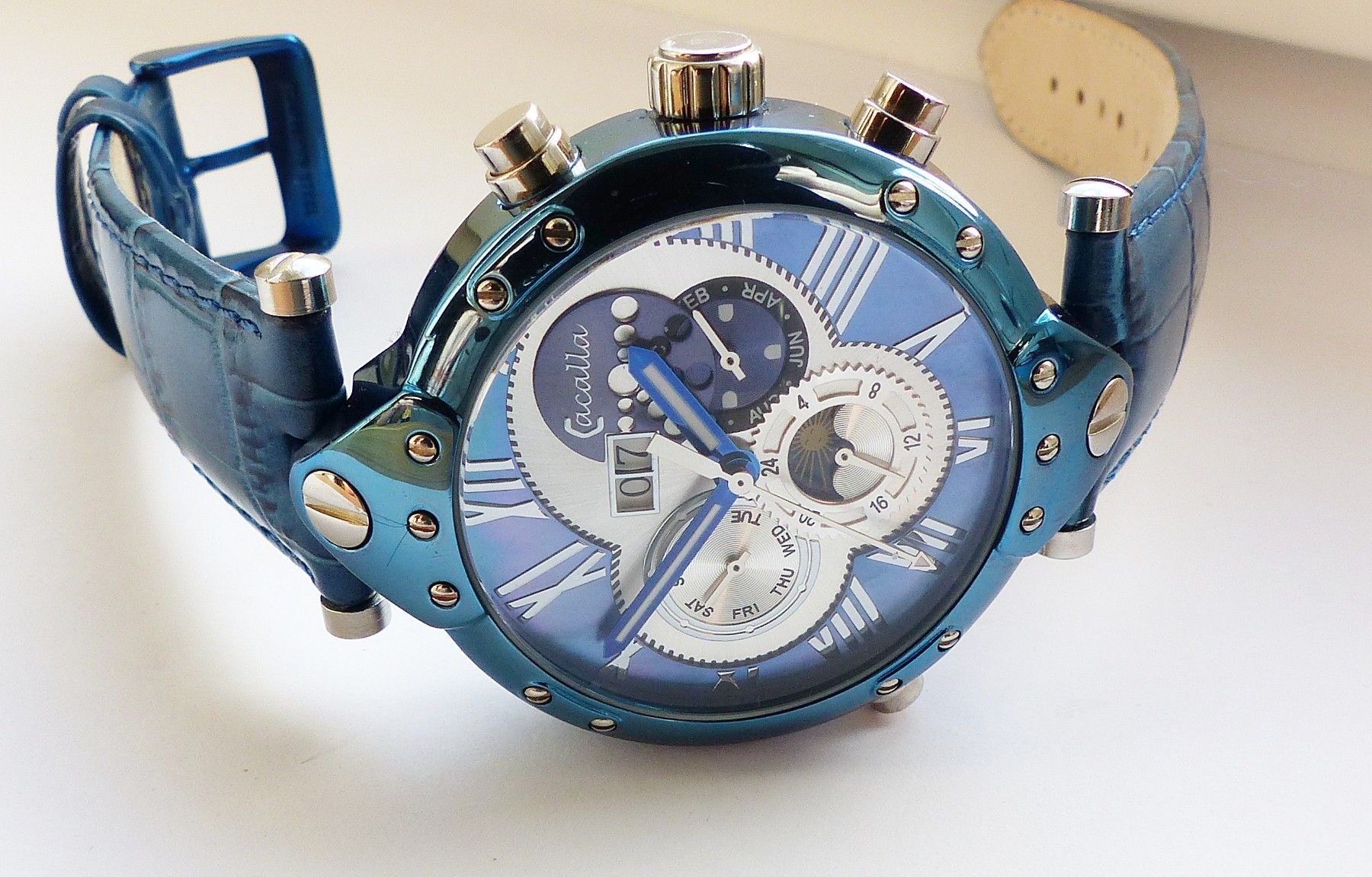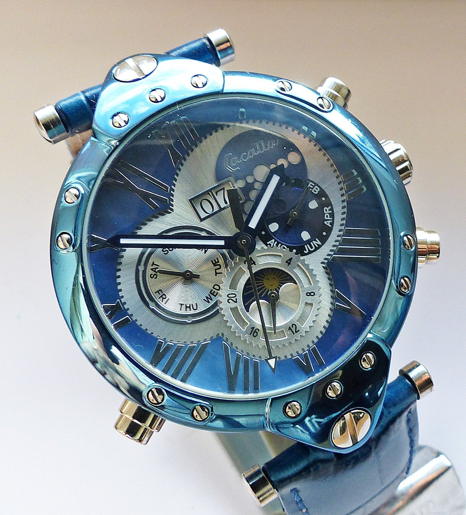 Schöner Cacalla Sun&Moon Datograph Herren Armbanduhr mit Blau-Silbernem Zifferblatt und aufgesetzten römischenZahlenindizes, grosser zentraler Sekunde, Großdatum bei 12.00 Uhr, Monatsanzeige bei 3.00 Uhr, Sun&Moon Anzeige bei 6.00 Uhr, 24Stundenanzeige bei 6.00 Uhr, Tagesanzeige bei 9.00 Uhr. Die Uh