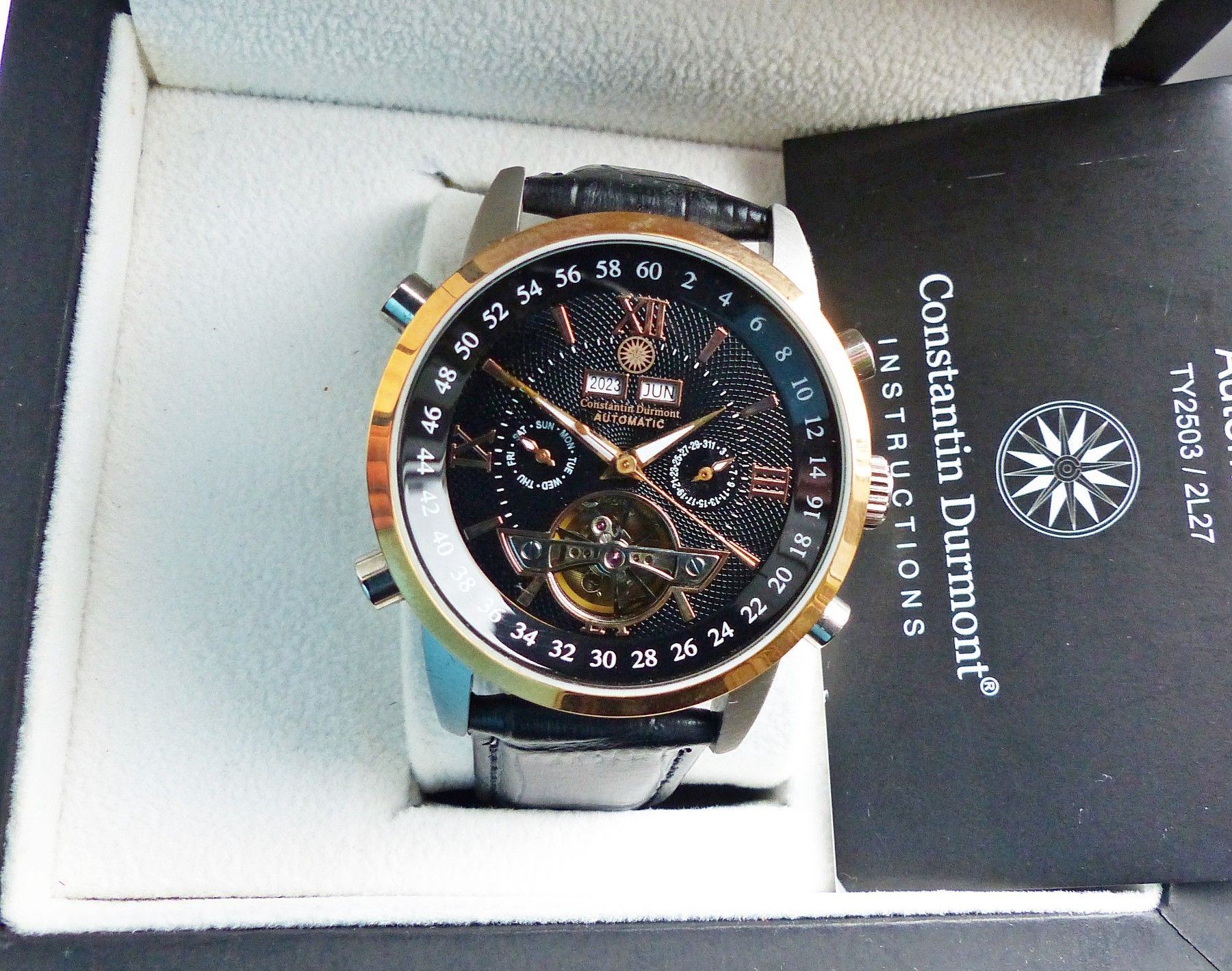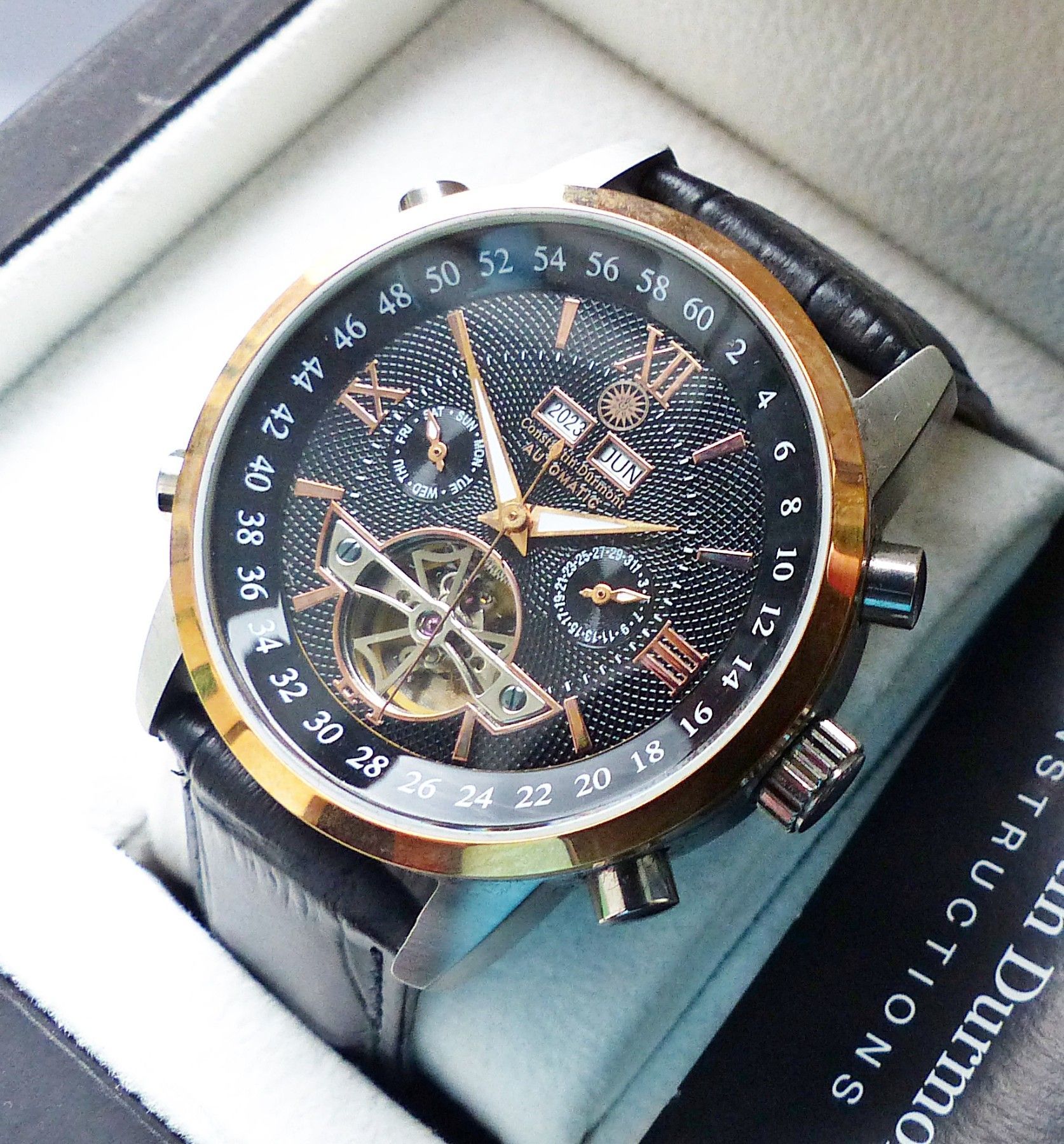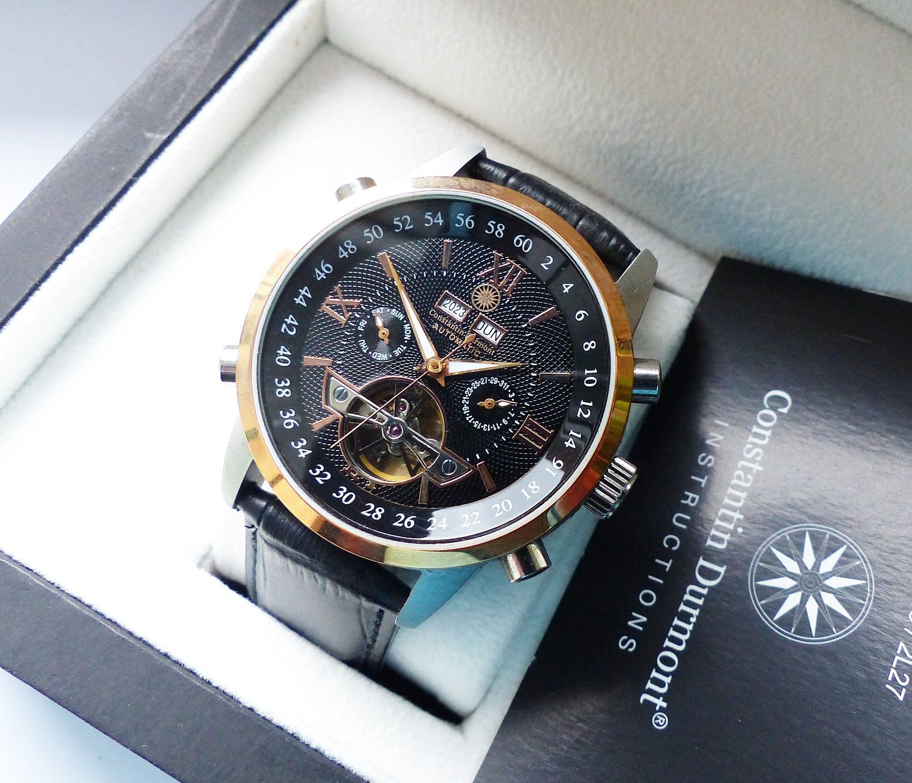 Schöner Constantin Durmont Automatic Datograph Herren Armbanduhr mit Schwarzem Zifferblatt und aufgesetzten Goldenen Indizes, grosser zentraler Sekunde, Datum, Wochentag, Monats und Jahresanzeige. Die Uhr ist voll funktionsfähig und in ungetragenem neuwertigen Zustand s. Fotos Hersteller : Constanti... Mehr