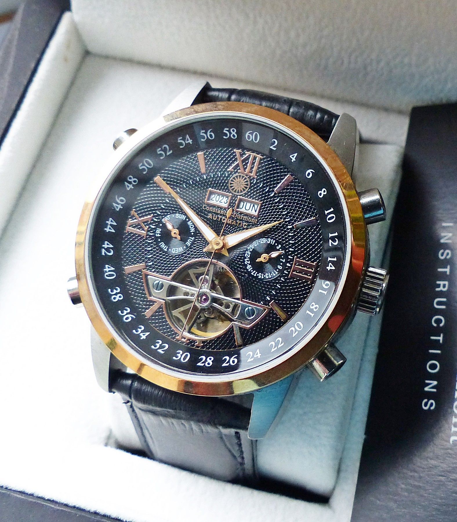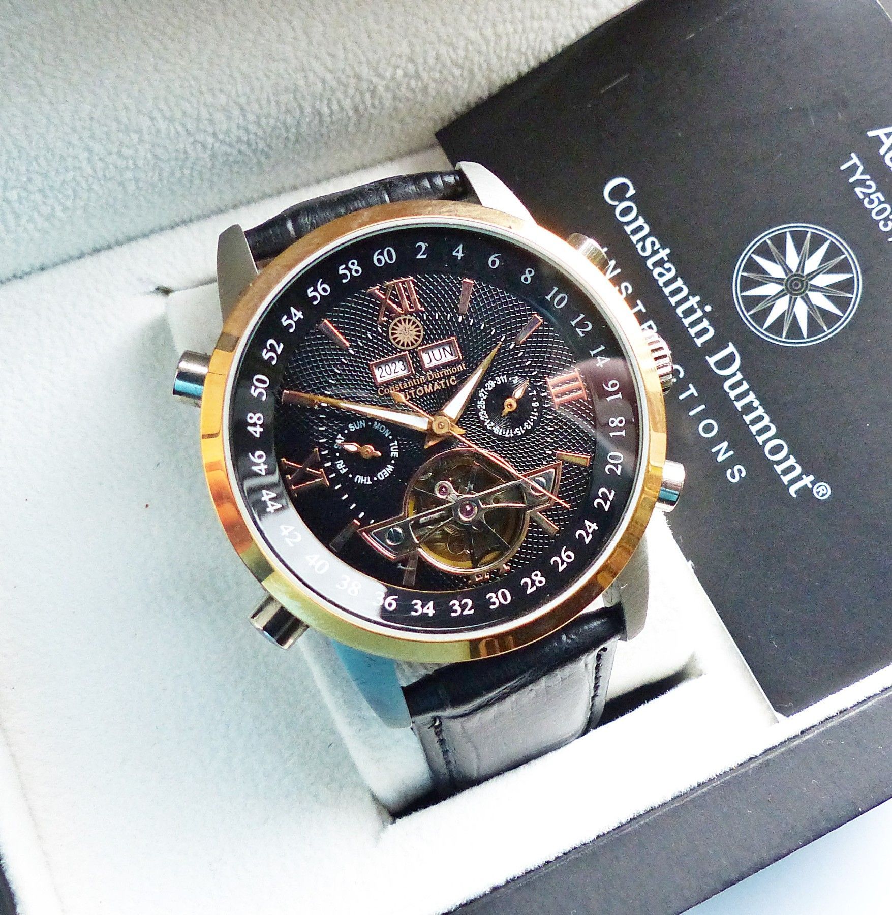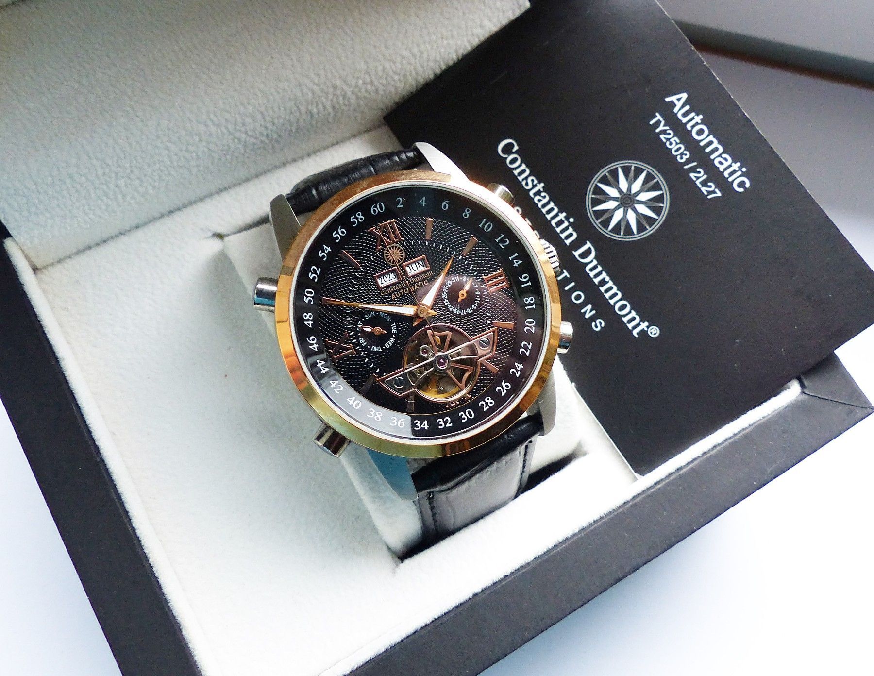 Schöner Constantin Durmont Automatic Datograph Herren Armbanduhr mit Schwarzem Zifferblatt und aufgesetzten Goldenen Indizes, grosser zentraler Sekunde, Datum, Wochentag, Monats und Jahresanzeige. Die Uhr ist voll funktionsfähig und in ungetragenem neuwertigen Zustand s. Fotos Hersteller : Constanti... Mehr