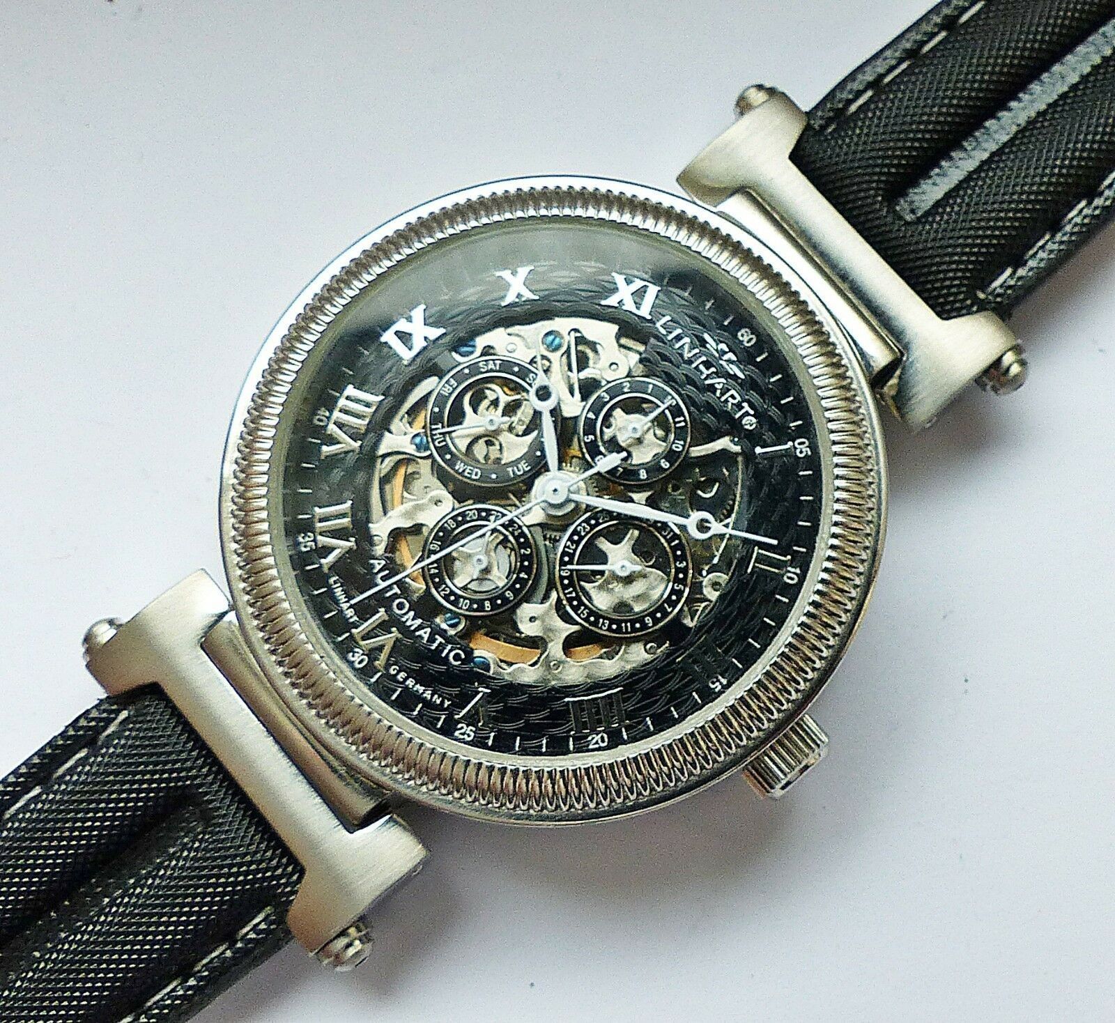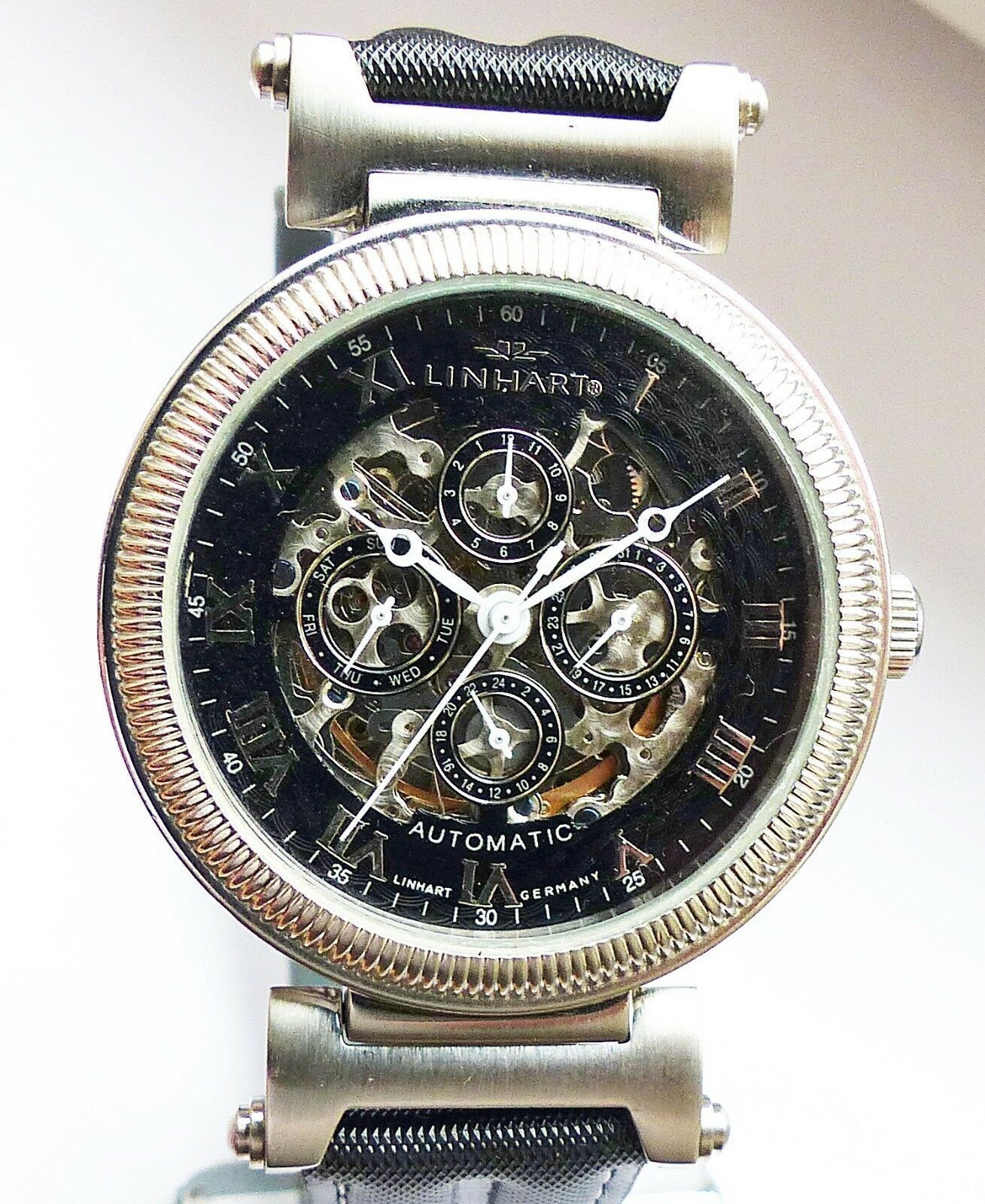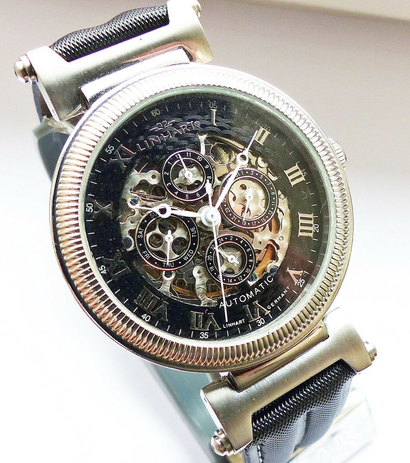 Hersteller : Linhart Deutschland Modell Skeleton Automatic Datograph mit grosser zentraler Sekunde, Schwarzem Zifferblatt und Silbernem Indexen, Datum, Wochentag, Monatsanzeige und 24Stundenanzeige, sichtbarem verziertem Automatic Uhrwerk etc. Uhrwerk : Automatisch-Mechanisch mit 35Jewels Material G