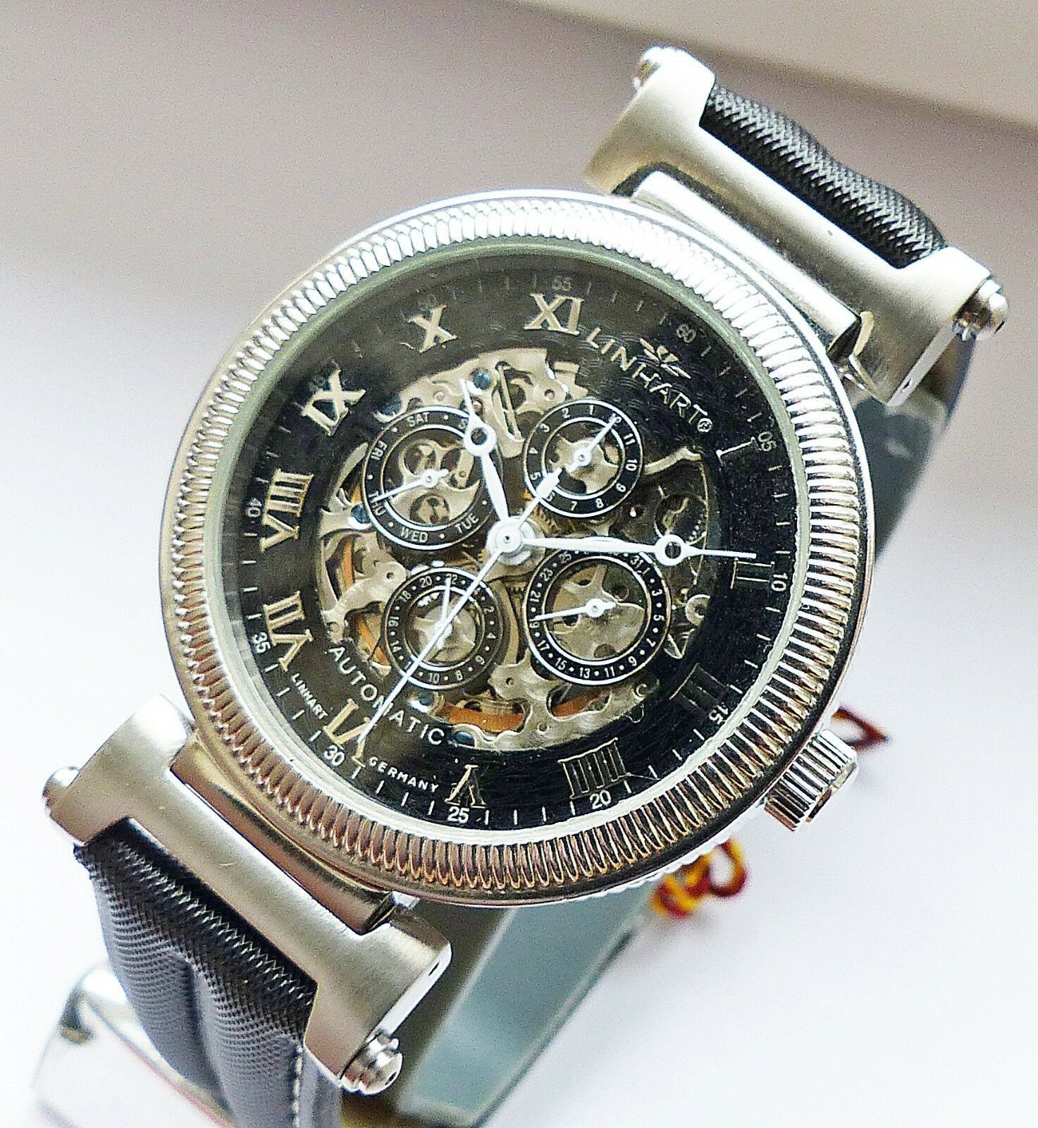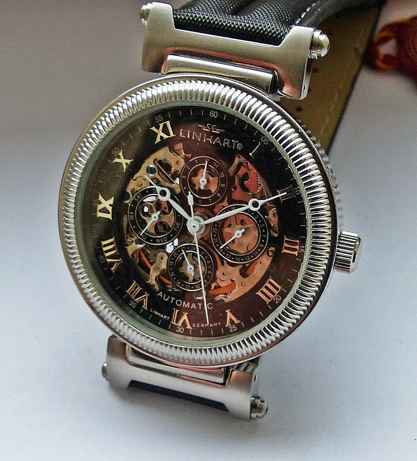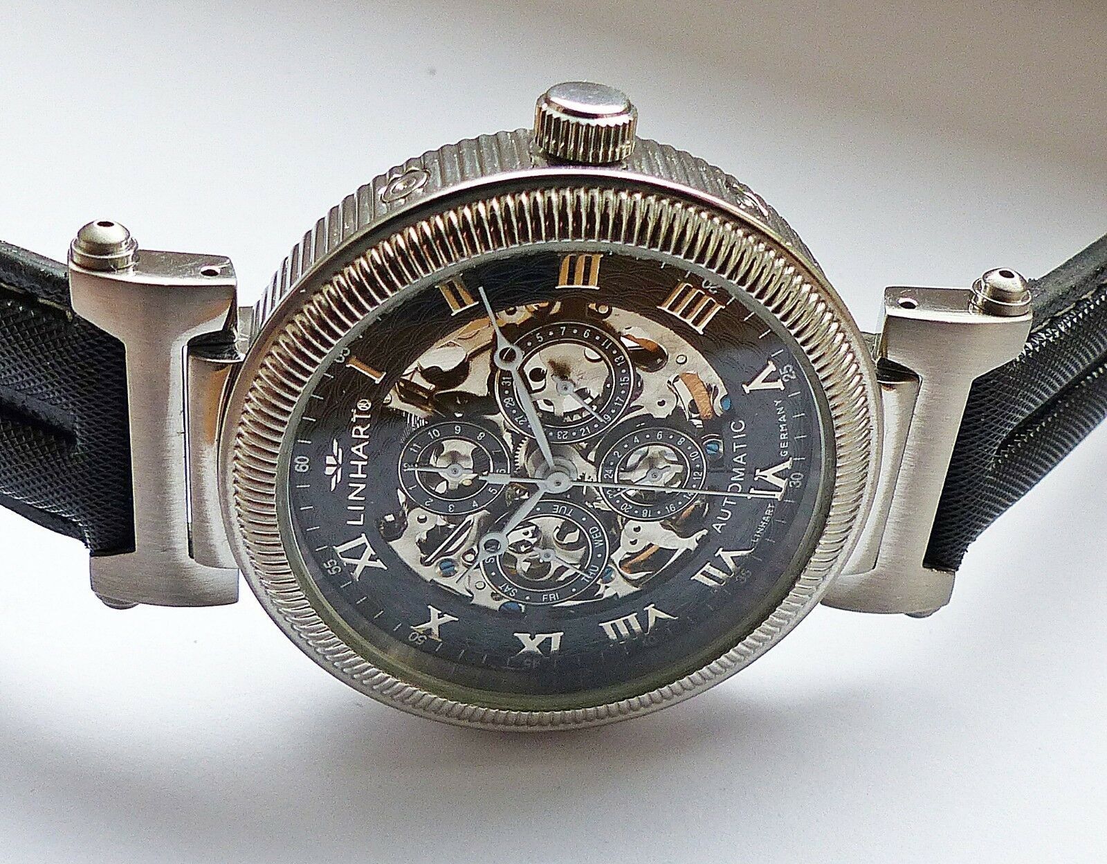 Hersteller : Linhart Deutschland Modell Skeleton Automatic Datograph mit grosser zentraler Sekunde, Schwarzem Zifferblatt und Silbernem Indexen, Datum, Wochentag, Monatsanzeige und 24Stundenanzeige, sichtbarem verziertem Automatic Uhrwerk etc. Uhrwerk : Automatisch-Mechanisch mit 35Jewels Material G