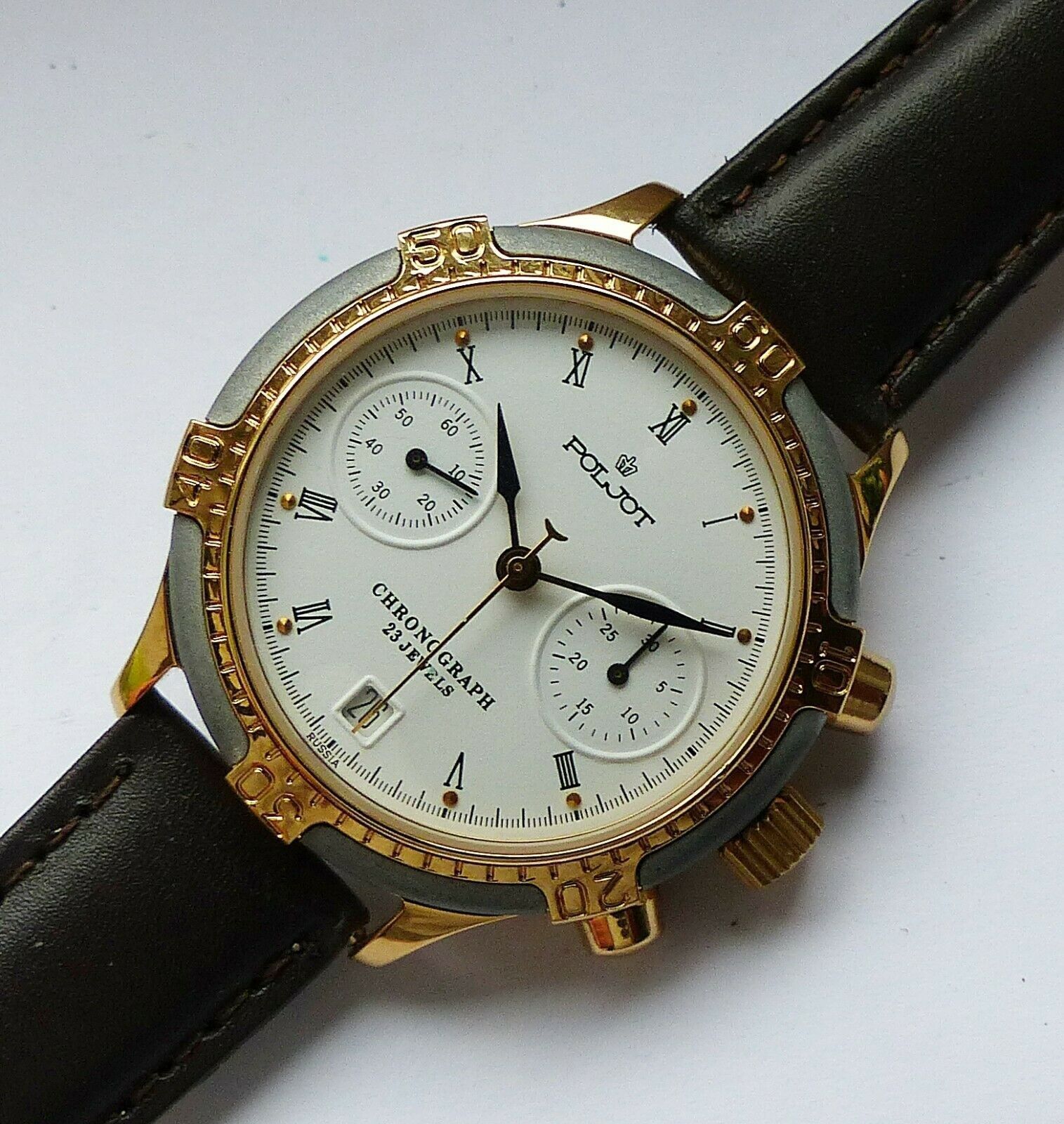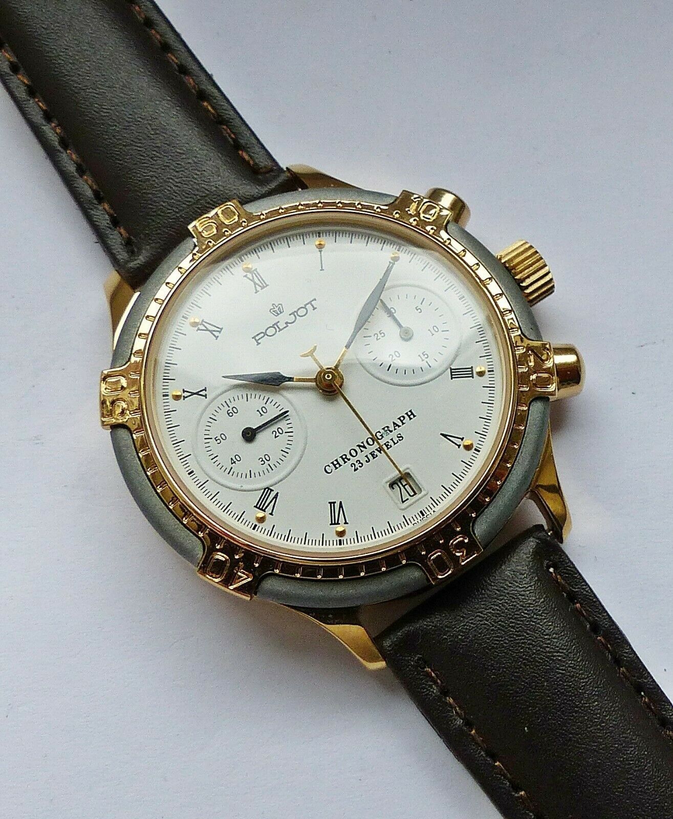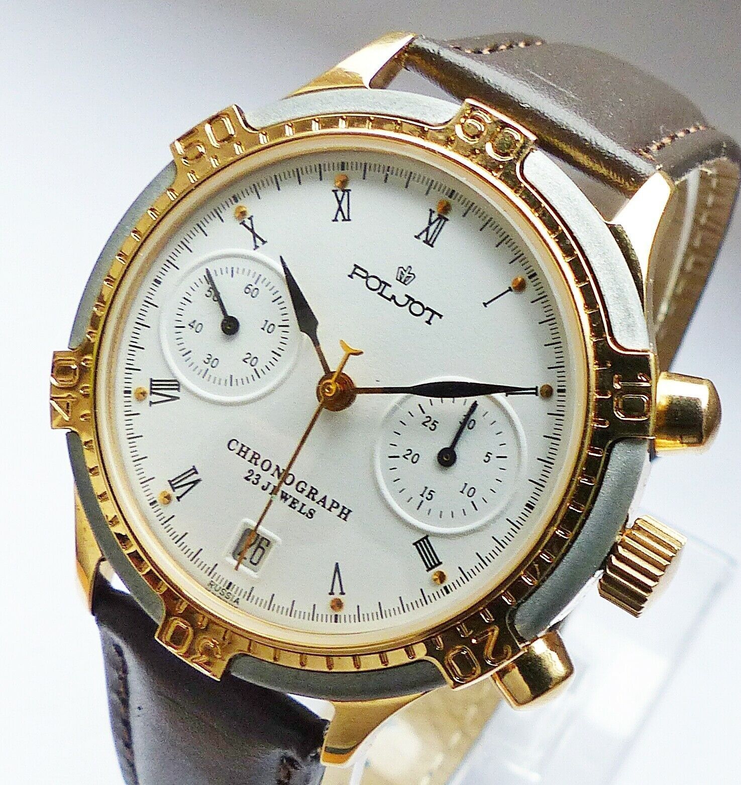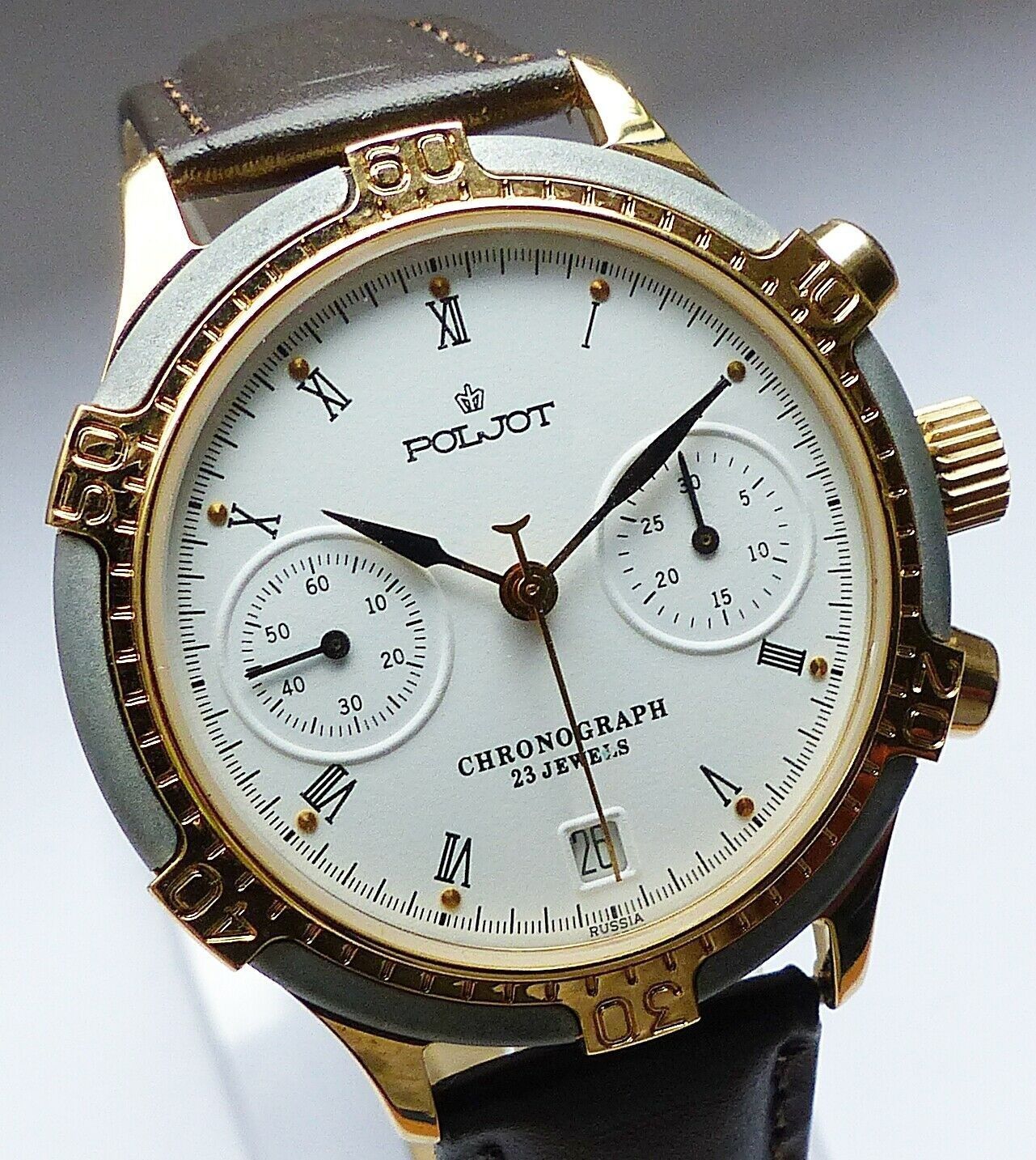 Hersteller : Poljot Russische Föderation Modell Chronograph mit zusatzdatum auf 6.00 Uhr, Weißem Zifferblatt mit römischen Zahlenindexen, Vergoldeter Lünette mit Silbergrauen eingelegten Ceramiken Uhrwerk : Kaliber Poljot 3133 Mechanischer Handaufzug mit 23Jewels Material Gehäuse : Edelstahl und Cra