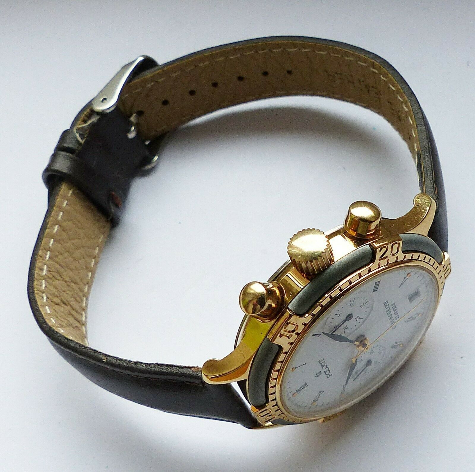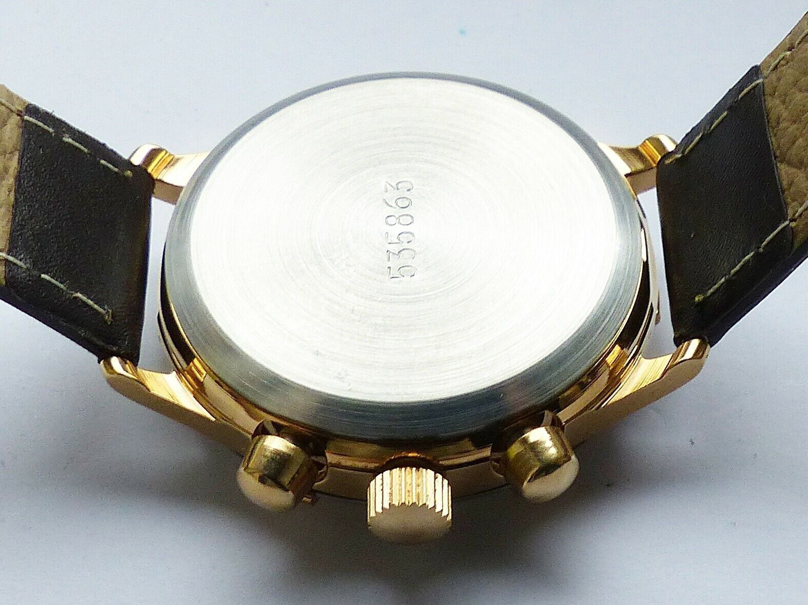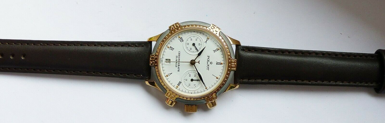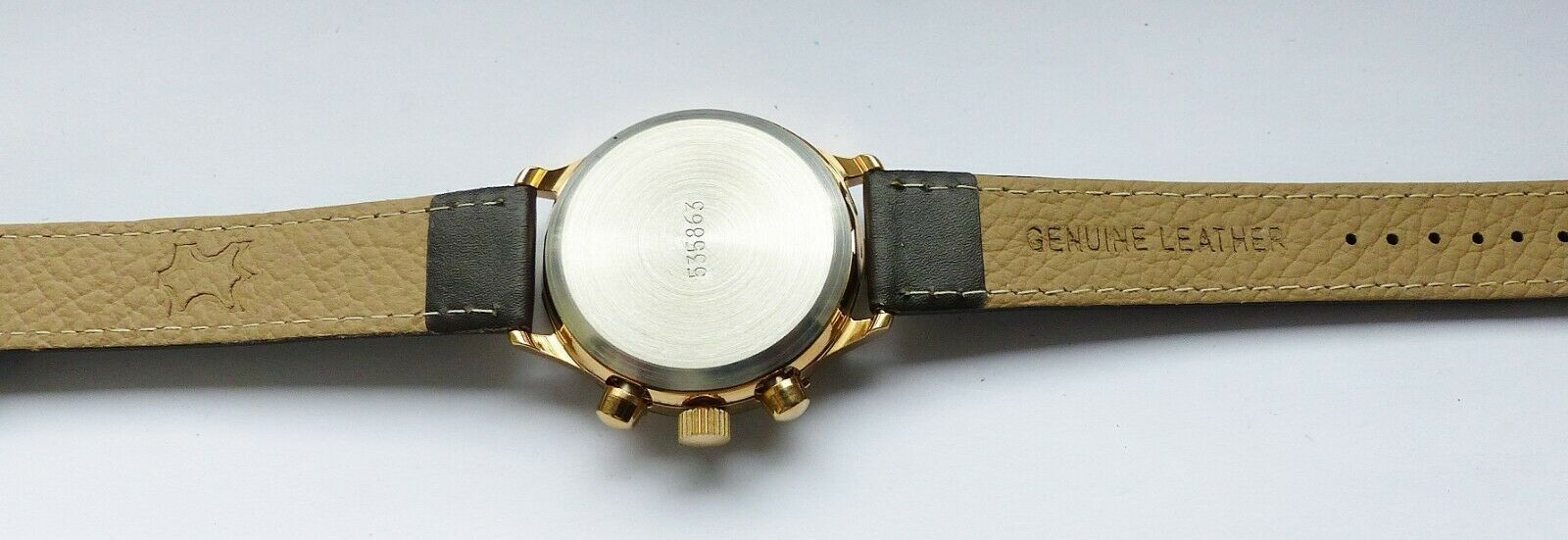 Hersteller : Poljot Russische Föderation Modell Chronograph mit zusatzdatum auf 6.00 Uhr, Weißem Zifferblatt mit römischen Zahlenindexen, Vergoldeter Lünette mit Silbergrauen eingelegten Ceramiken Uhrwerk : Kaliber Poljot 3133 Mechanischer Handaufzug mit 23Jewels Material Gehäuse : Edelstahl und Cra