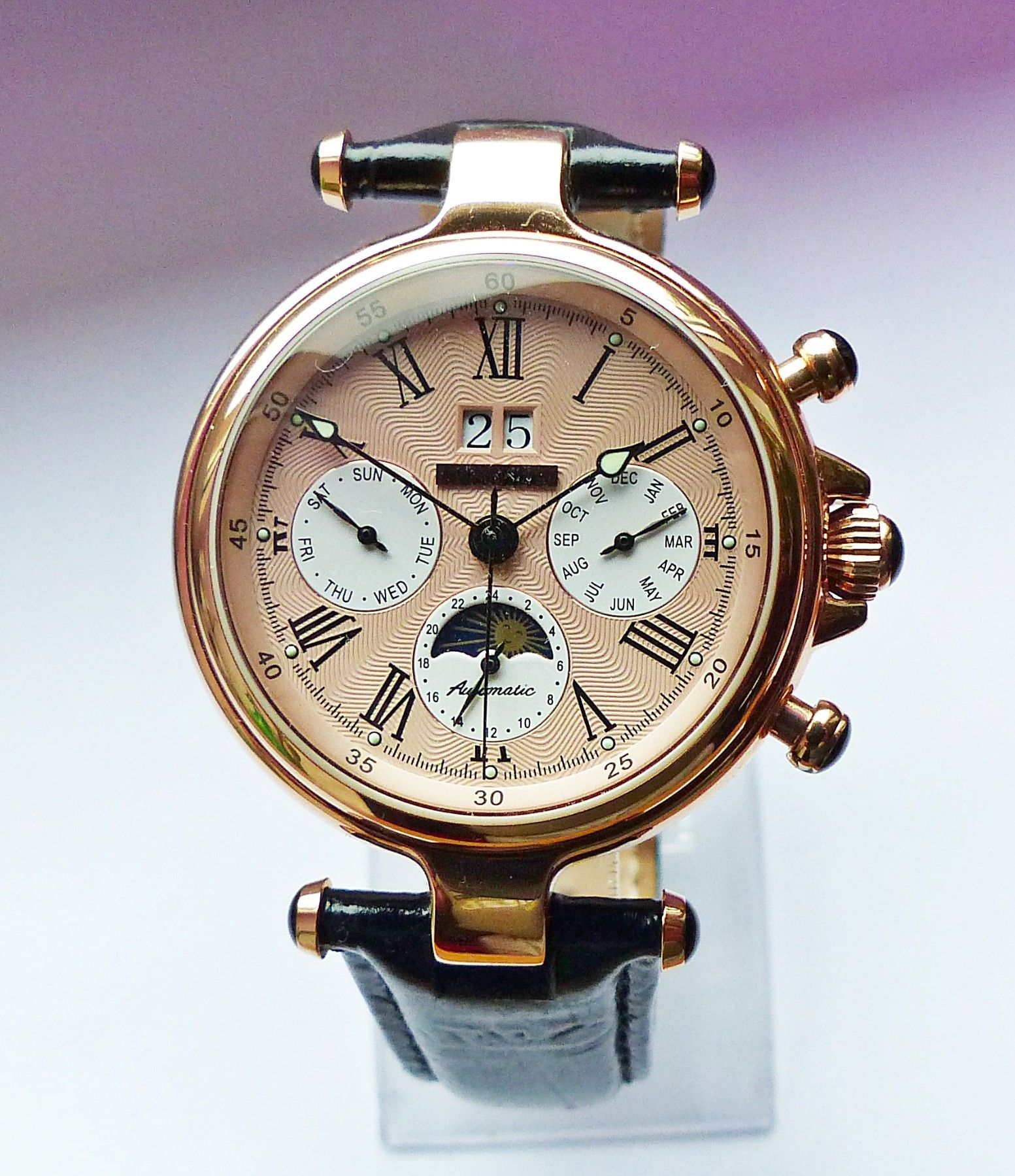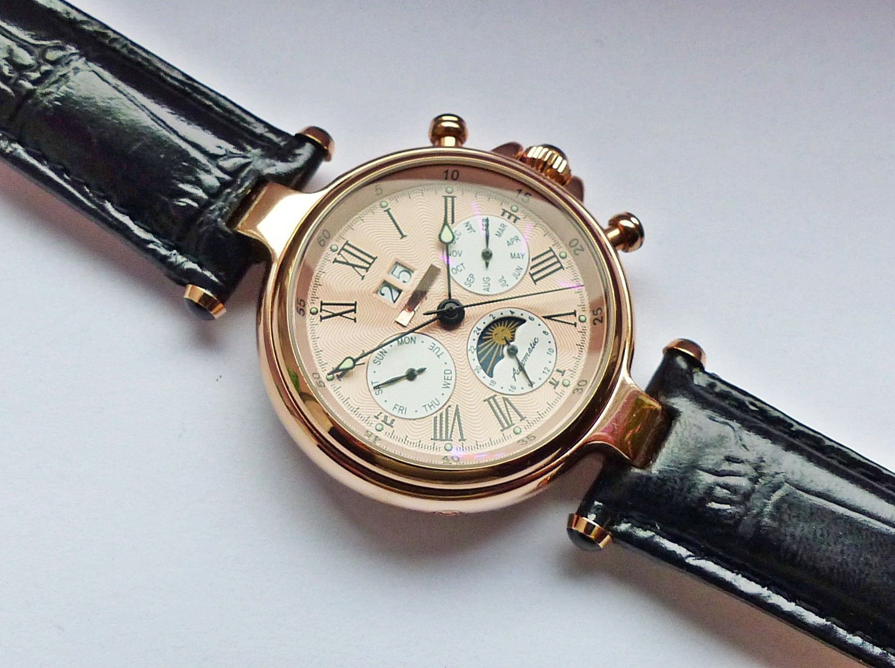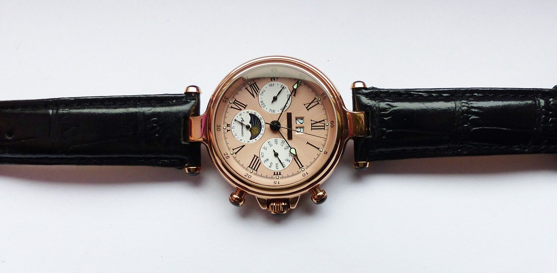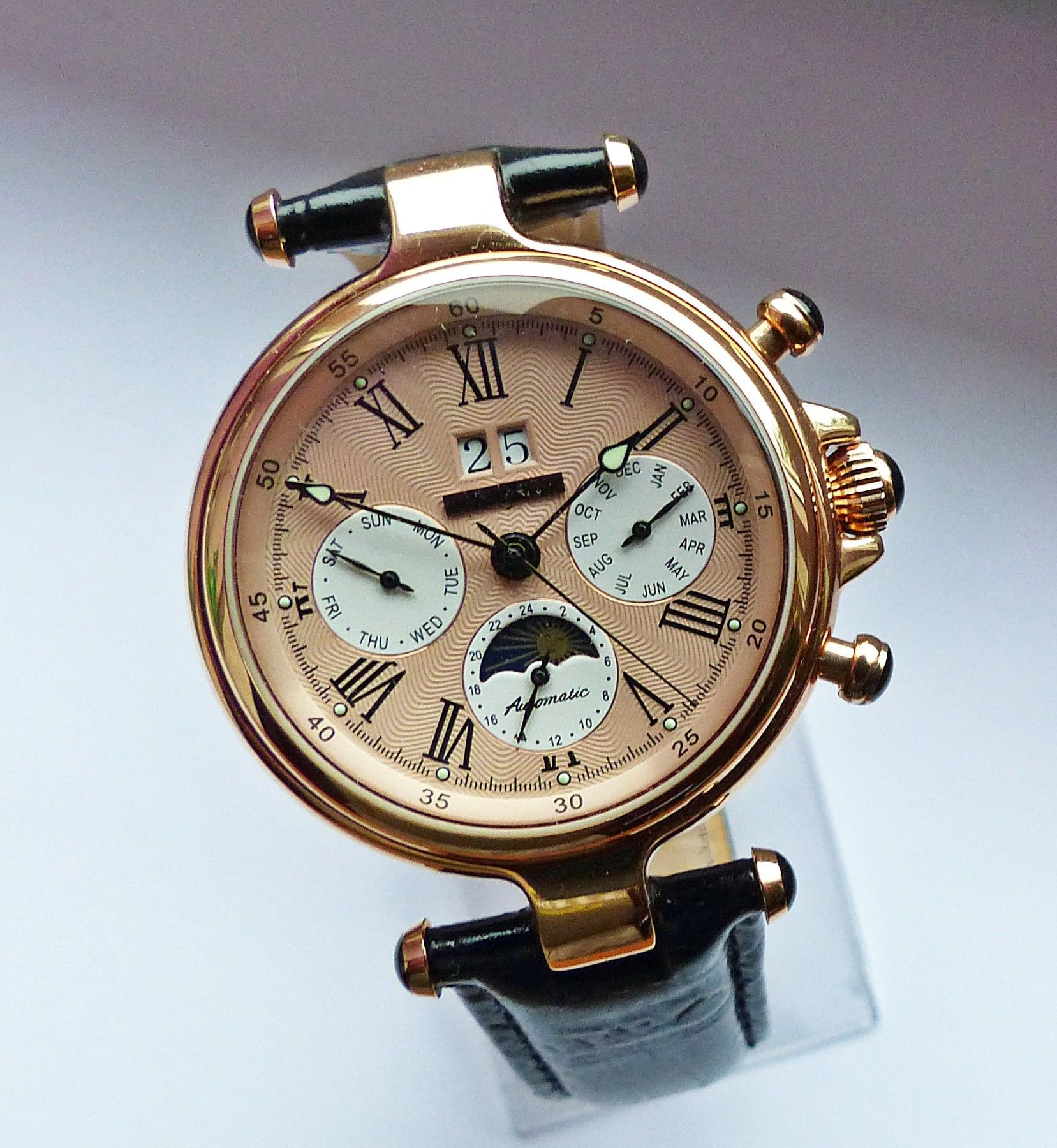 Schöner und sehr seltener Jean Jacot Herren Automatic Datograph mit Bronzefarbenem Zifferblatt und Schwarzen römischen Zahlenindizes, grosser zentraler Sekunde, Großdatum bei 12.00 Uhr, Monatsanzeige bei 3.00 Uhr, 24Stundenanzeige und Tag und Nachtanzeige bei 6.00 Uhr, Tagesanzeige bei 9.00 Uhr, flu