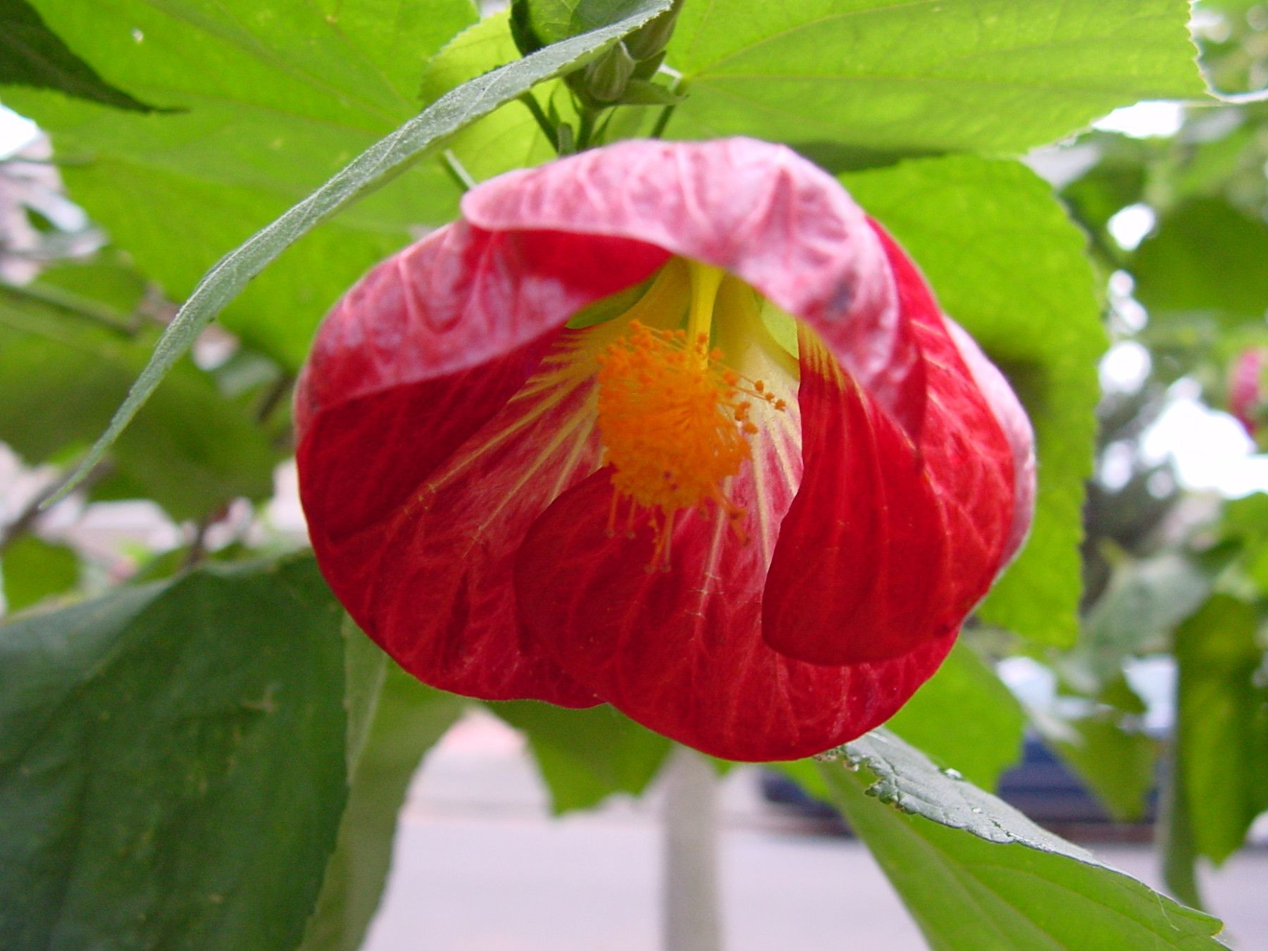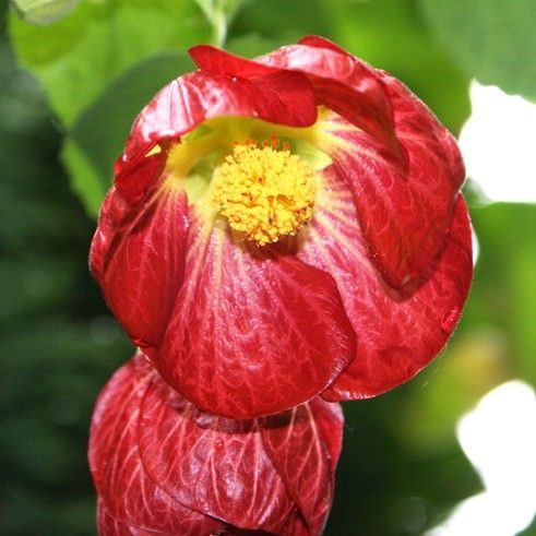 Schönmalve "Feuerwerk", mit dunkelroten Blüten Abutilon (Engelstrompeten)