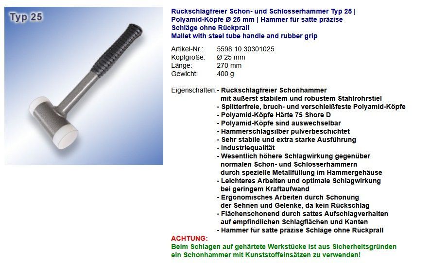Rückschlagfreier Schon- und Schlosserhammer Typ 25 Polyamid-Köpfe Ø 25 mm Hammer für satte präzise Schläge ohne Rückprall Mallet with steel tube handle and rubber grip Artikel-Nr.: 5598.10.30301025 Kopfgröße: Ø 25 mm Länge: 270 mm Gewicht: 400 g Eigenschaften: - Rückschlagfreier Schonh