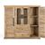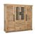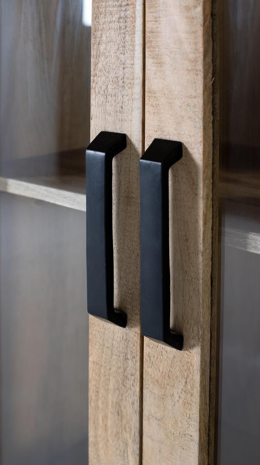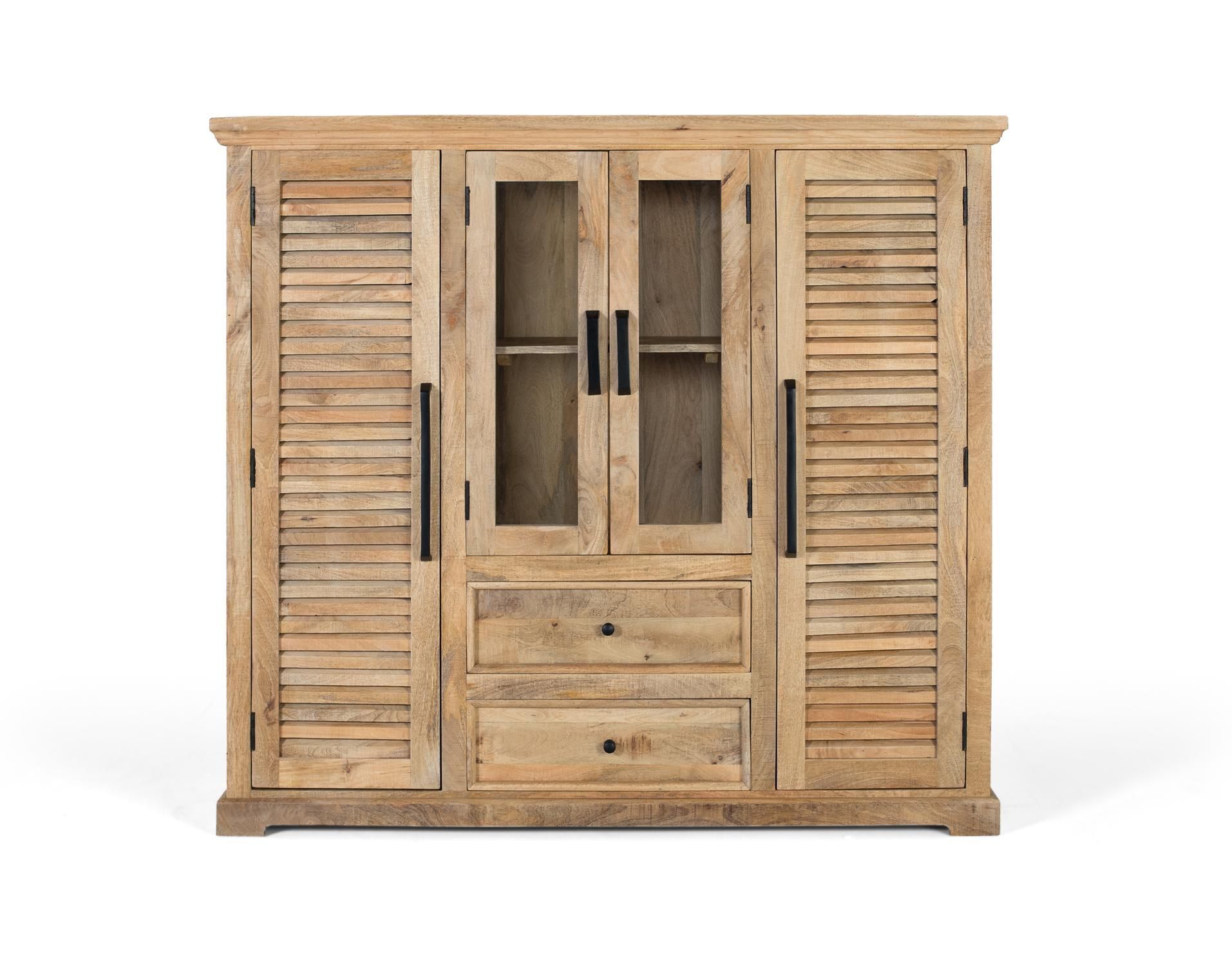 Schrank aus Mangoholz, mit zwei zentralen Téren aus transparentem Glas, ideal fér die Präsentation von Dekorationsgegenständen, und zwei seitlichen Holztéren, die einen rustikalen Touch verleihen. Daréber hinaus verfégt es éber untere Schubladen fér zusätzlichen Stauraum.