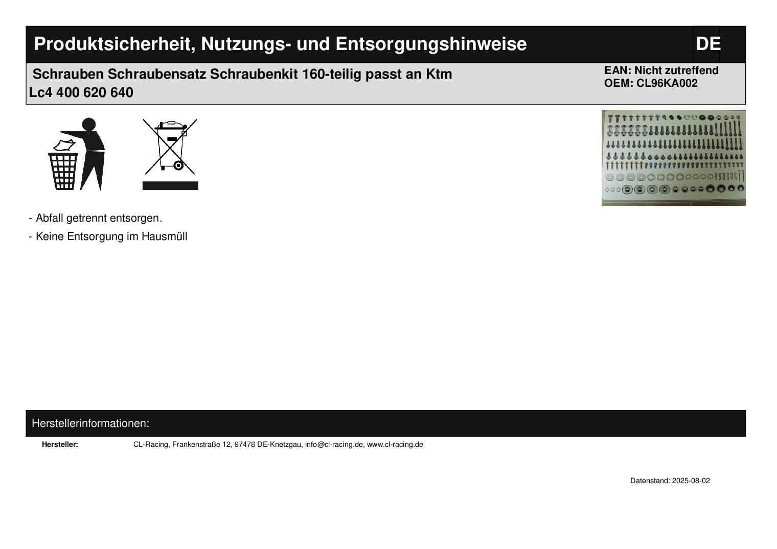Schrauben Schraubensatz Schraubenkit 160-teilig passt an Ktm Lc4 400 620 640