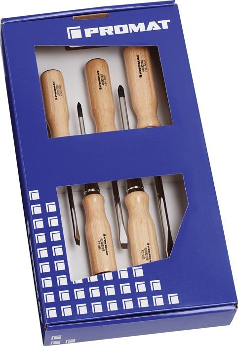 PROMAT Schraubendrehersatz 5-tlg. Schlitz/PZD Holzgriff Rundklinge m.6-Kant-Ansatz