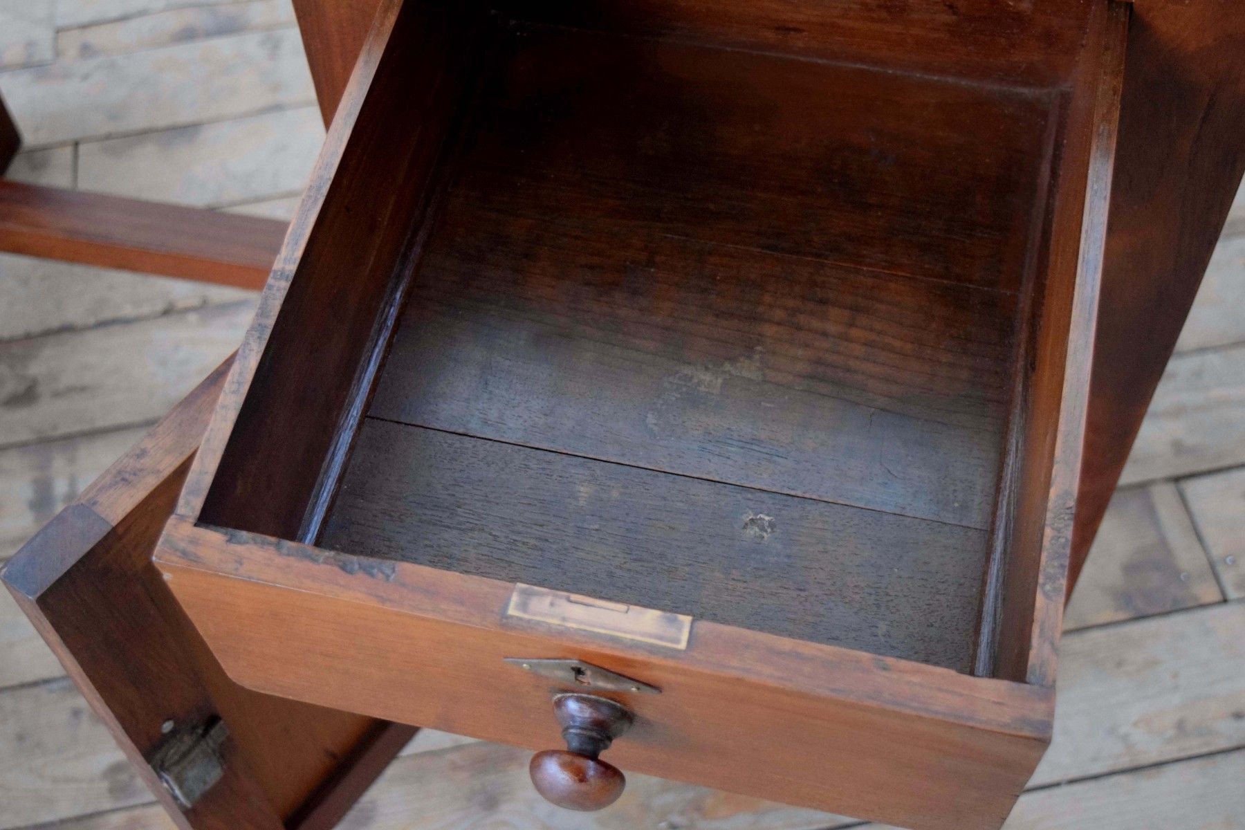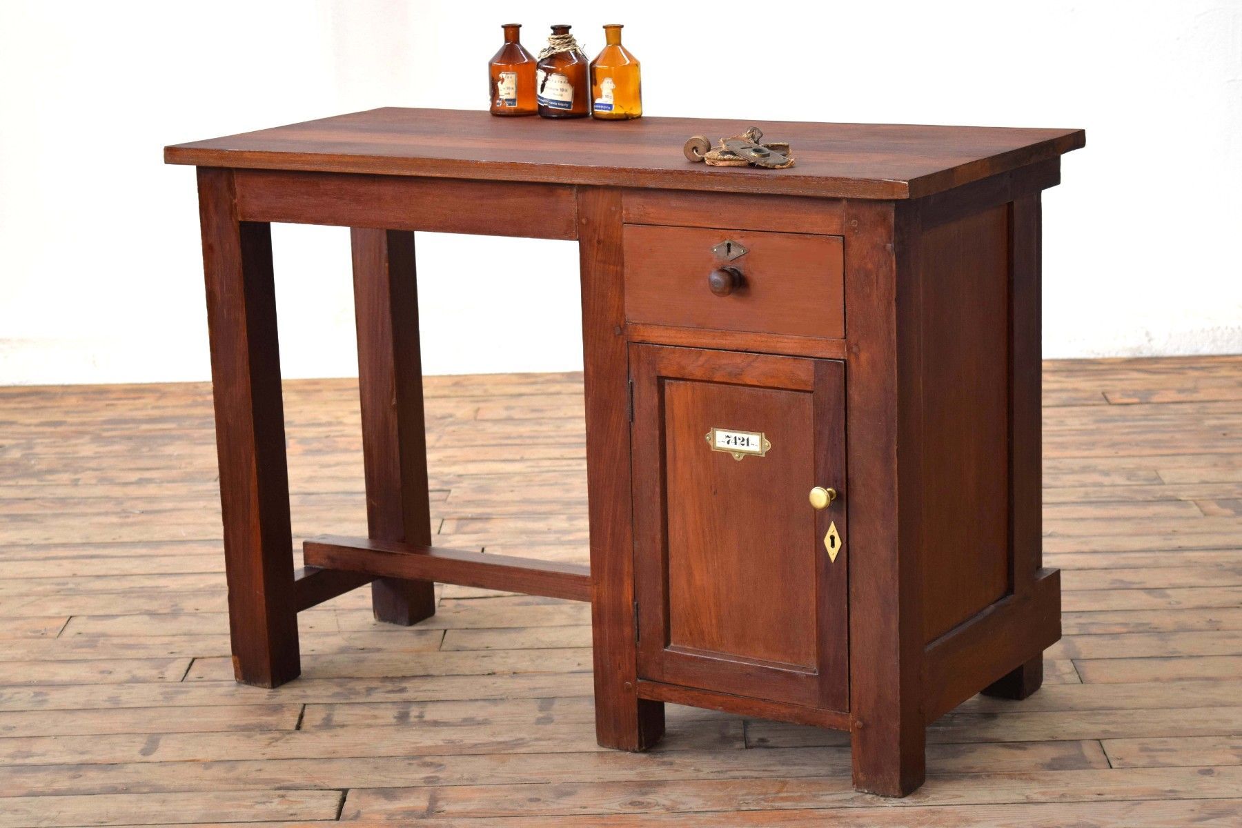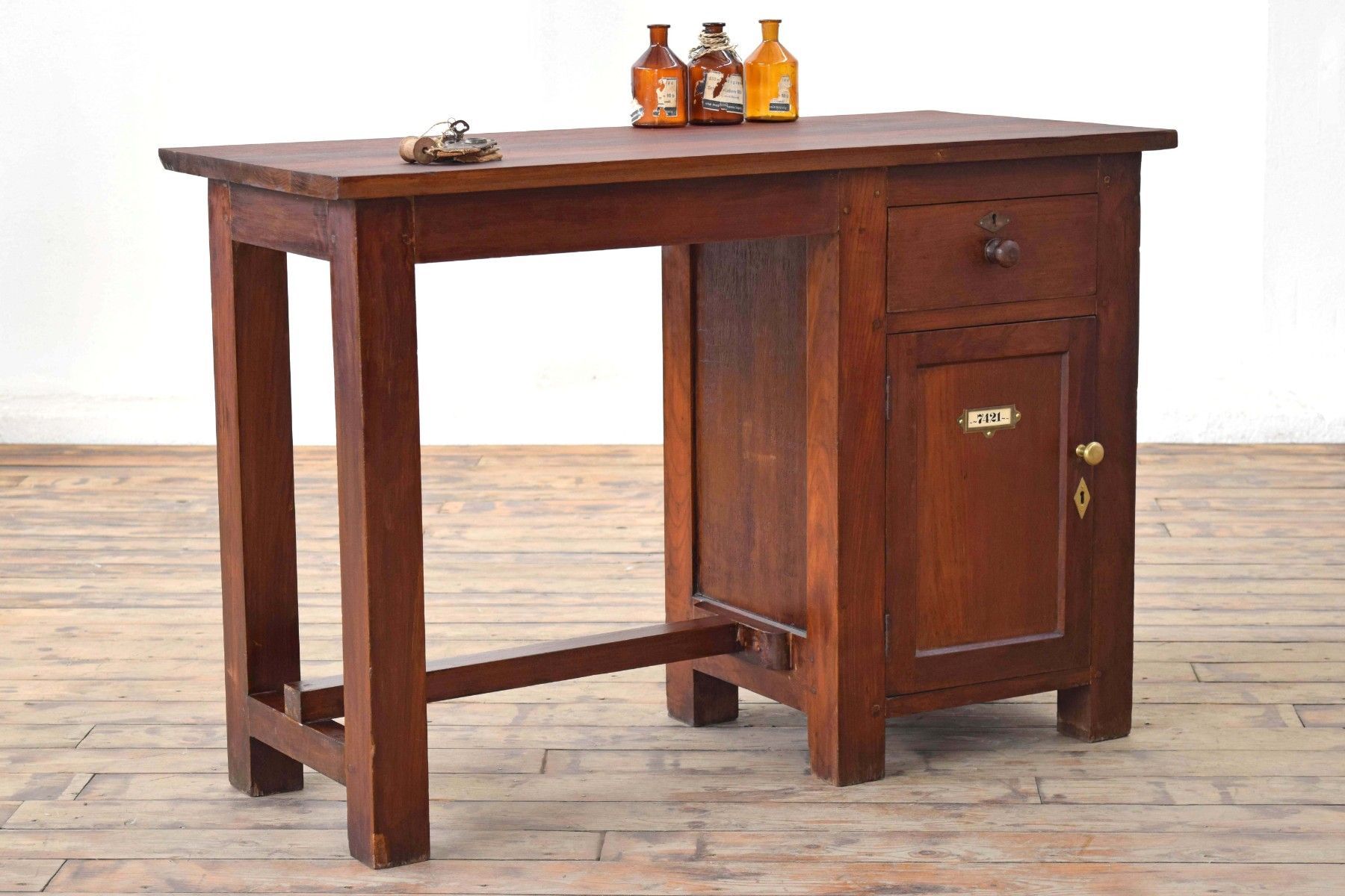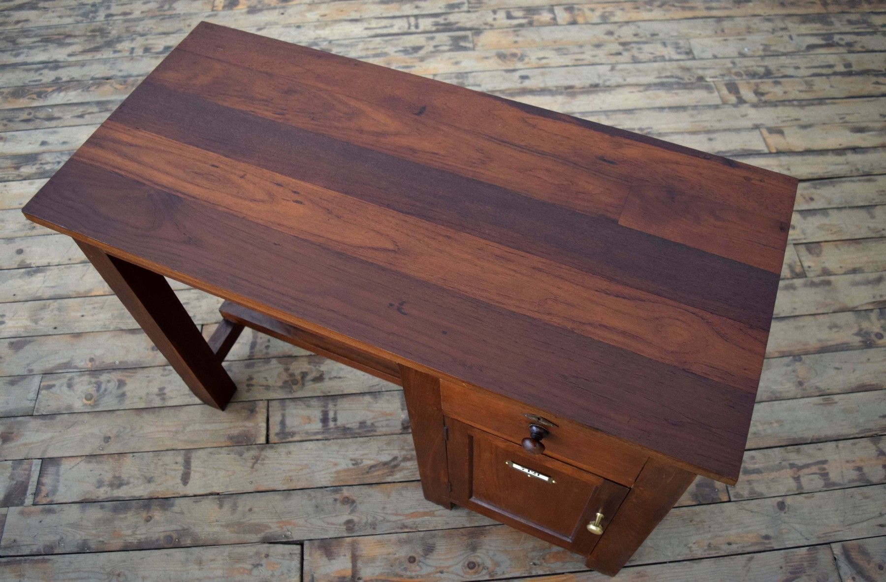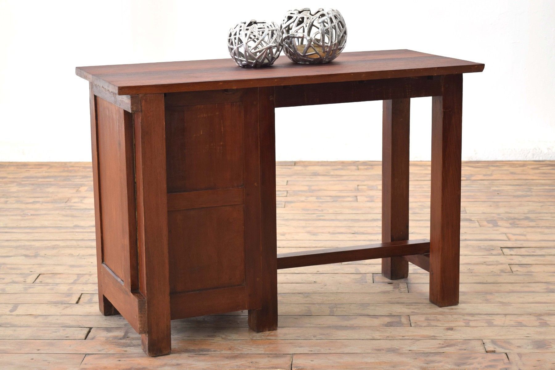 antiker Schreibtisch (um 1925) aus Vollholz (Teak) mit Schellack- Auftrag, Beschläge aus Messing Höhe 77cm (Unterkante für Beinfreiheit 67cm), Breite 111cm, Tiefe 56cm eine Schubladen, nutzbares Innenmaß: 11 x 28 x 34cm ein Fach, nutzbares Innenmaß: 42 x 30 x 35cm mit Gebrauchsspuren aus cirka 100 Jahren, stabil, sauber, wohnfertig, gepflegt kräftig gemastertes Holz mit dezent rötlichem Charakter freistehend verwendbar Der Versand innerhalb Deutschlands ist kostenlos.